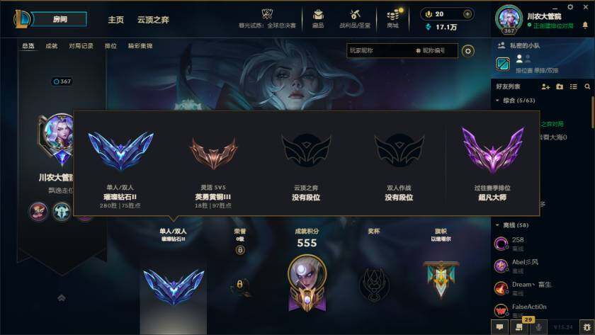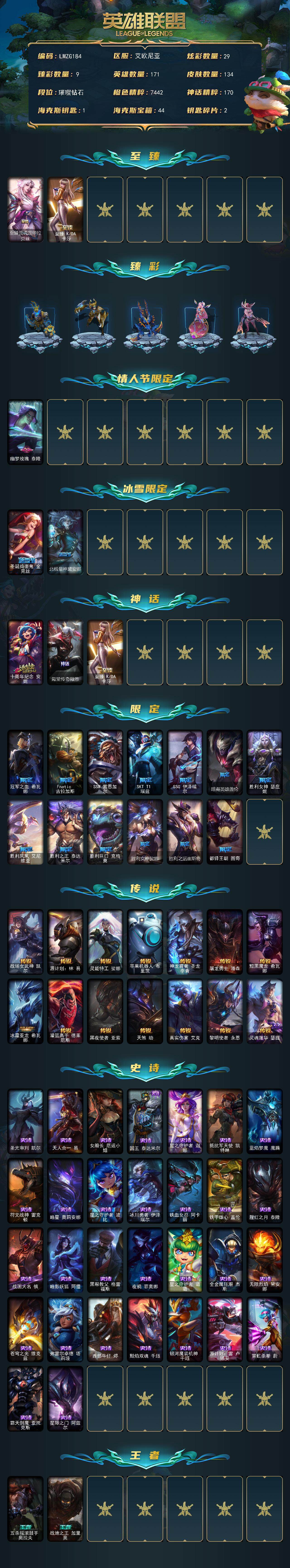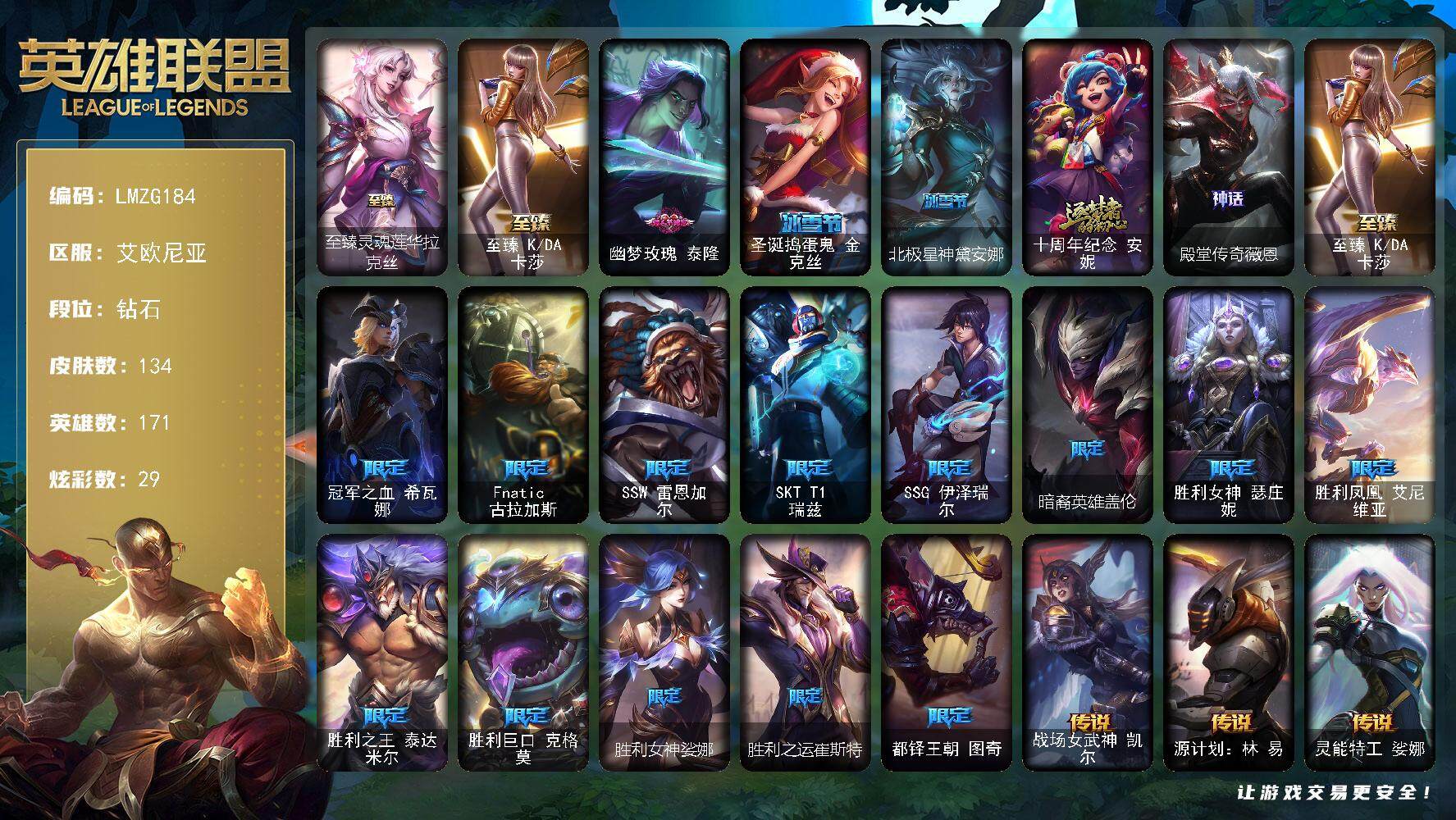 【187726】【LMZG184】171英雄/134皮肤/4神话/16限定/9臻彩/29炫彩/14传说/30史诗/钻石/至臻灵魂莲华拉克丝/至臻K/DA卡莎/冠军之刃锐雯2016凯旋圣装/冠军典狱长锤石凯旋圣装/冠军之血希瓦娜凯旋圣装/霸天异形卡兹克掠空魅影/星之守护者萨勒芬妮未来之光/破败军团厄运小姐灵岛征伐使/魔女阿卡丽虚荣/暗影妖狐阿狸入梦之影/幽梦玫瑰泰隆/圣诞捣蛋鬼金克丝/北极星神黛安