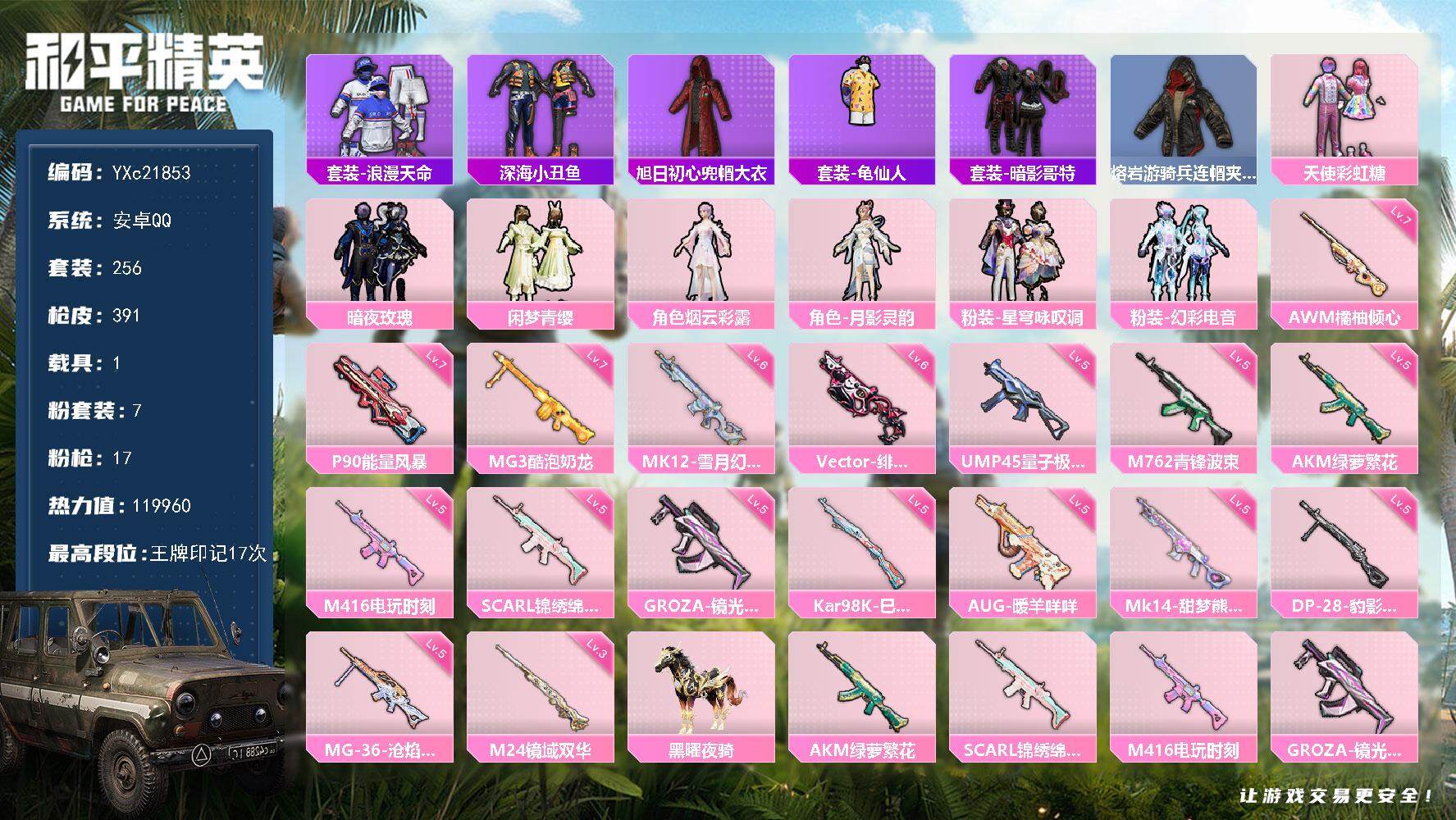 【188526】【不可二次】【安卓QQ】龟仙人 AKM-绿萝繁花 M762-青锋波束 漫步者 AWM-橘柚倾心 极速红龙 暗夜鎏金降落伞 M762-奇异狩猎者 M416-电玩时刻 凝视深渊降落伞 深海小丑鱼 瑞龙福将 云虎纪 甜蜜誓约降落伞 环太平洋降落伞 浪漫天命 团圆交子 仲夏莫吉托降落伞 M762-瑞龙福将 齐天大圣飞行器 至尊龙雀降落伞 SCAR-L-锦绣绵绵 白月香洋装 暗夜玫瑰 天使