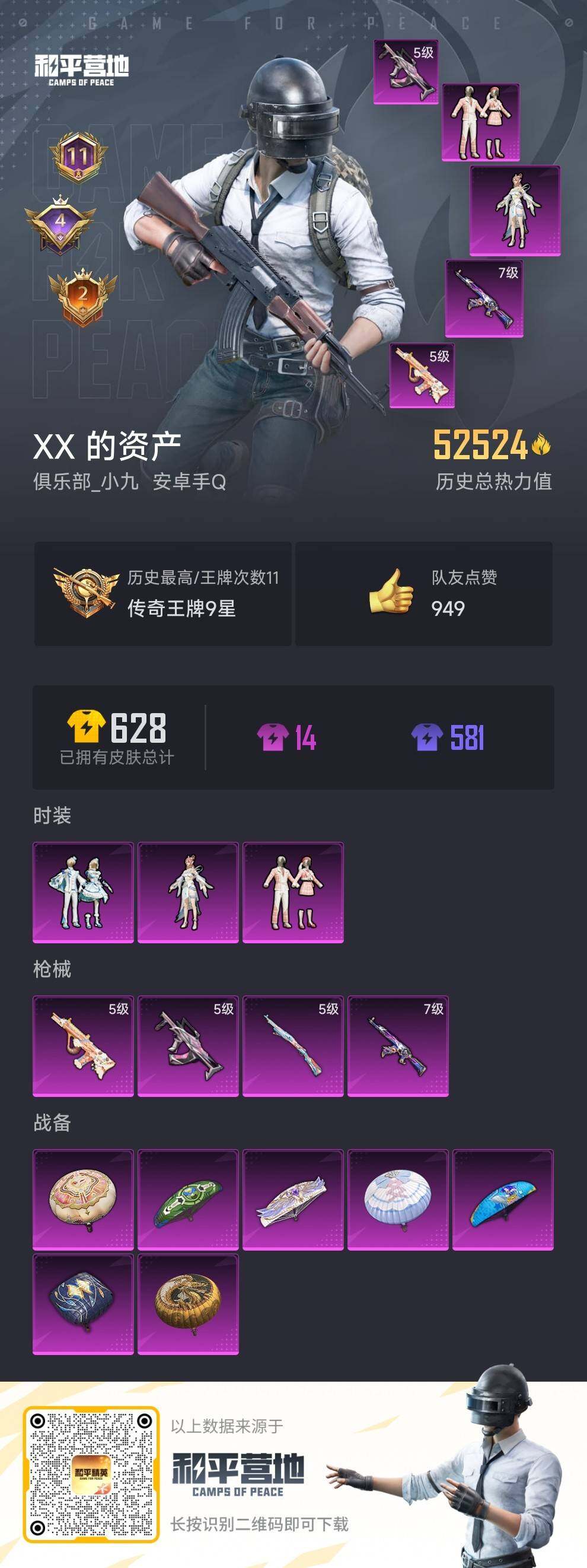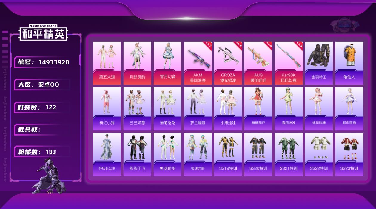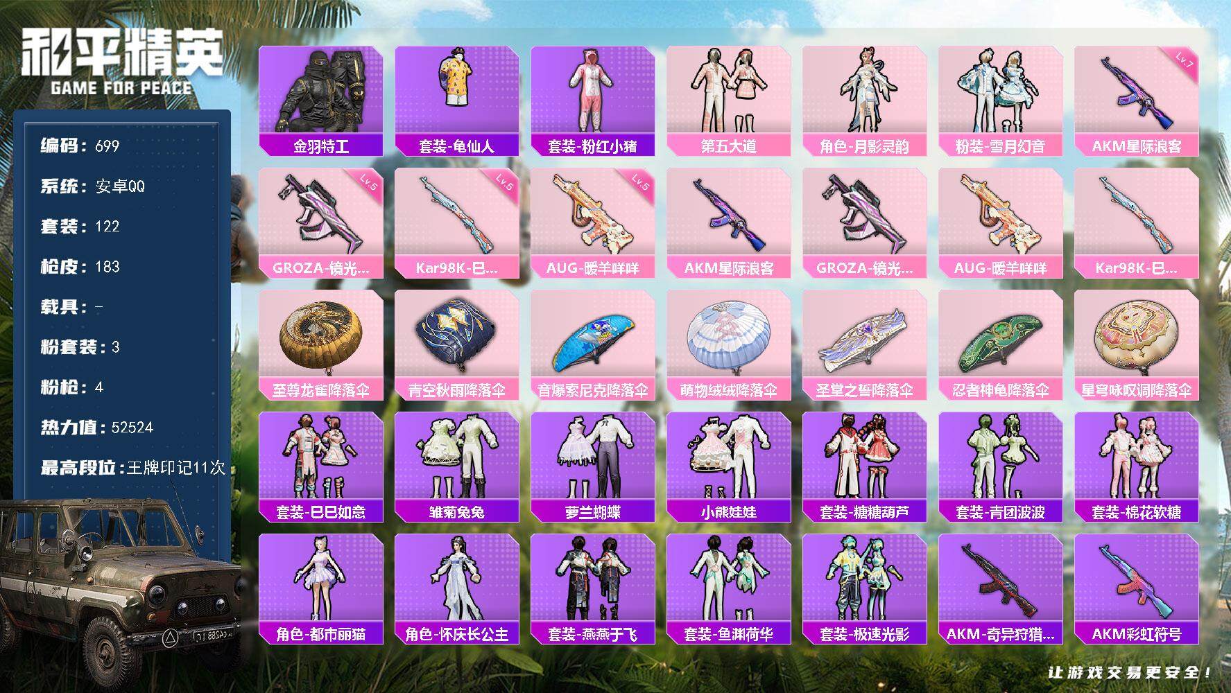【188799】[14933920]安卓 手Q-3粉装-4特效枪-0载具-0粉色飞行器-52524热力值-11王牌印记-122套装-183枪皮【热门品类】:套装-金羽特工,套装-龟仙人,套装-粉红小猪【粉色套装】:粉装-第五大道,角色-月影灵韵,粉装-雪月幻音【粉色枪皮等级】:AKM-星际浪客(七级),GROZA-镜光银凌(五级),AUG-暖羊咩咩(五级),Kar98K-巳巳如意(五级)【粉色枪