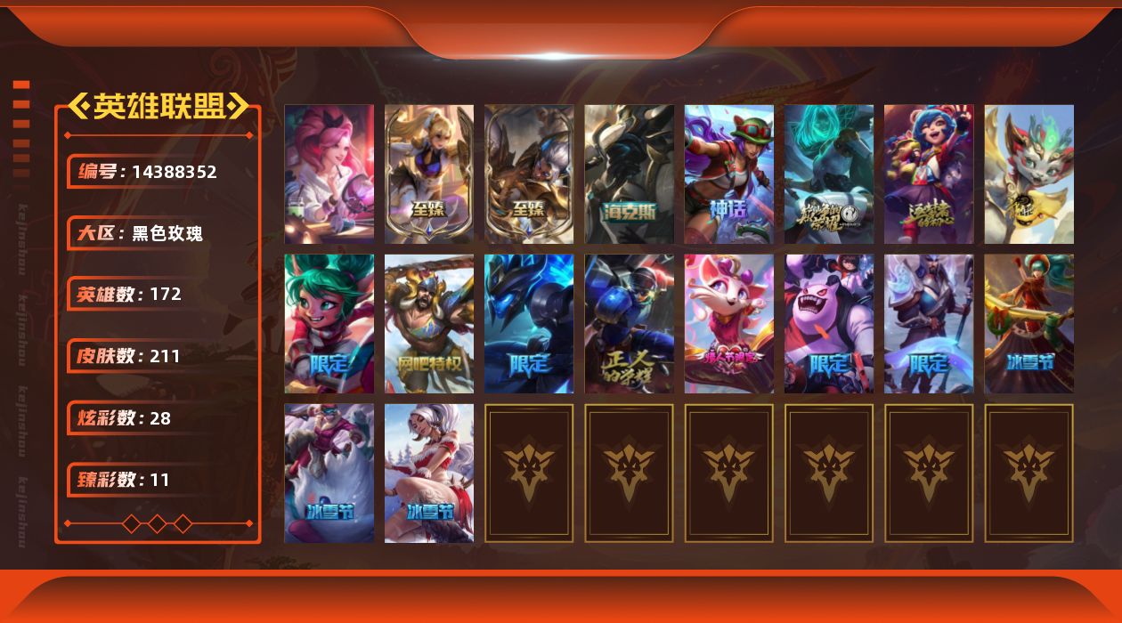 【192808】[14388352]【店主推荐捡漏号!可直接换绑】黑铁段位-172英雄-211皮肤-28炫彩-3终极-7神话-14限定-18传说-49史诗【珍稀头像】:红包头像【至臻皮肤】:至臻战斗学院蕾欧娜,至臻神龙尊者炎龙瑟提【臻彩皮肤】:无畏骑士瑟庄妮赤子初心,冠军之矛卡莉丝塔凯旋圣装,玉剑传说无极麒麟,幻灵战斗猫金克丝梦幻强袭,源计划火菲奥娜惩戒,霸天异形卡兹克刹那银光,星之守护者卡莎热