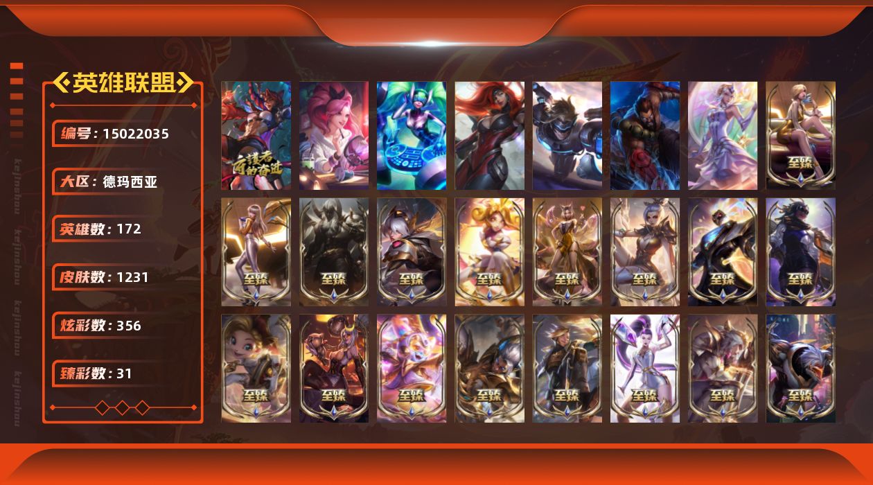 【204016】[15022035]t33144【德玛西亚】原皮龙瞎 1231皮肤 356炫彩 31臻彩 37神话/224限定/114传说/172英雄 账号等级:340 云顶神话:6 单双排段位:铂金【重要头像】云顶古琴娑娜 爱意绵绵 爱情鸽 爱情之歌 两仪无极 萨勒芬妮超级巨星 萨勒芬妮独立音乐人 我麦是开的么 万圣节卡特琳娜 KDA萨勒芬妮 EDG佐伊 灵魂莲华阿狸炫彩