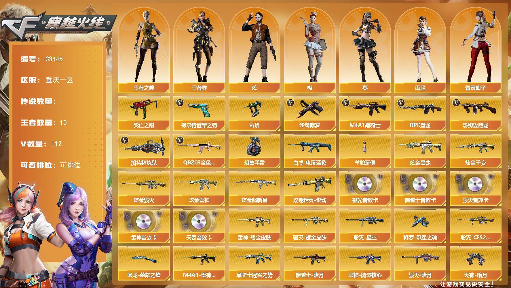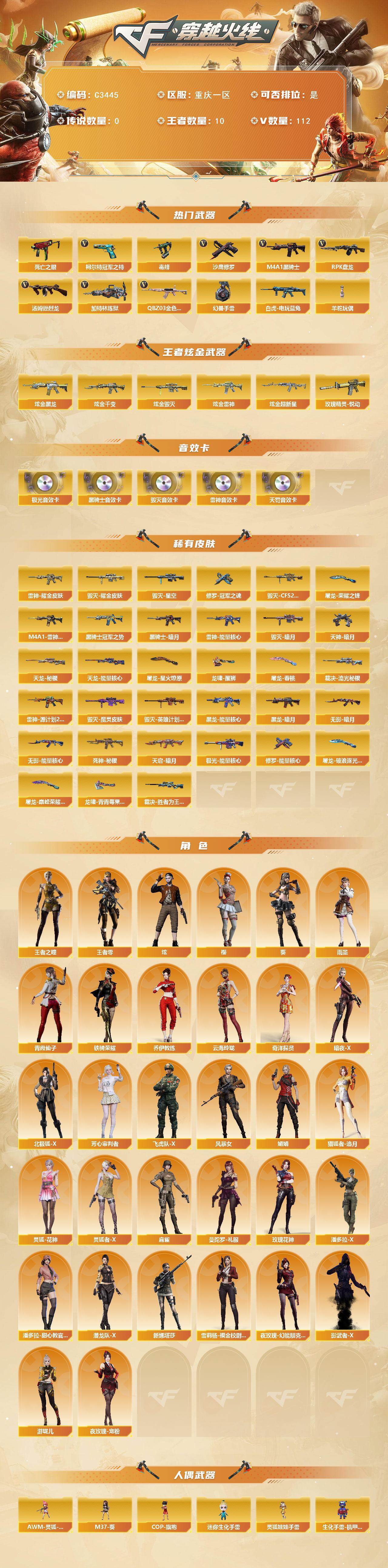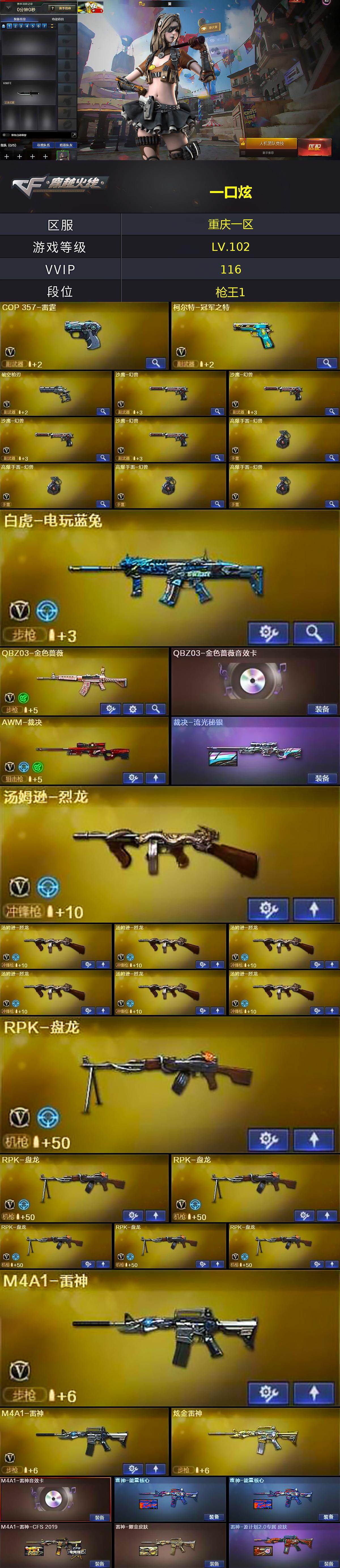 【205417】【C3445】重庆一区-112V-10王者-5炫金【热门武器】:QBZ03-金色蔷薇,死亡之眼*2,白虎-电玩蓝兔,柯尔特-冠军之特,毒蜂,M4A1-黑骑士,汤姆逊-烈龙*7,RPK-盘龙*6,加特林-炼狱*3,羊驼玩偶,沙鹰-修罗*7,高爆手雷-幻兽*4【王者炫金武器】:玫瑰精灵-悦动,炫金黑龙,炫金千变,炫金雷神,炫金超新星,炫金毁灭【音效卡】:M4A1-雷神音效卡,M4A1