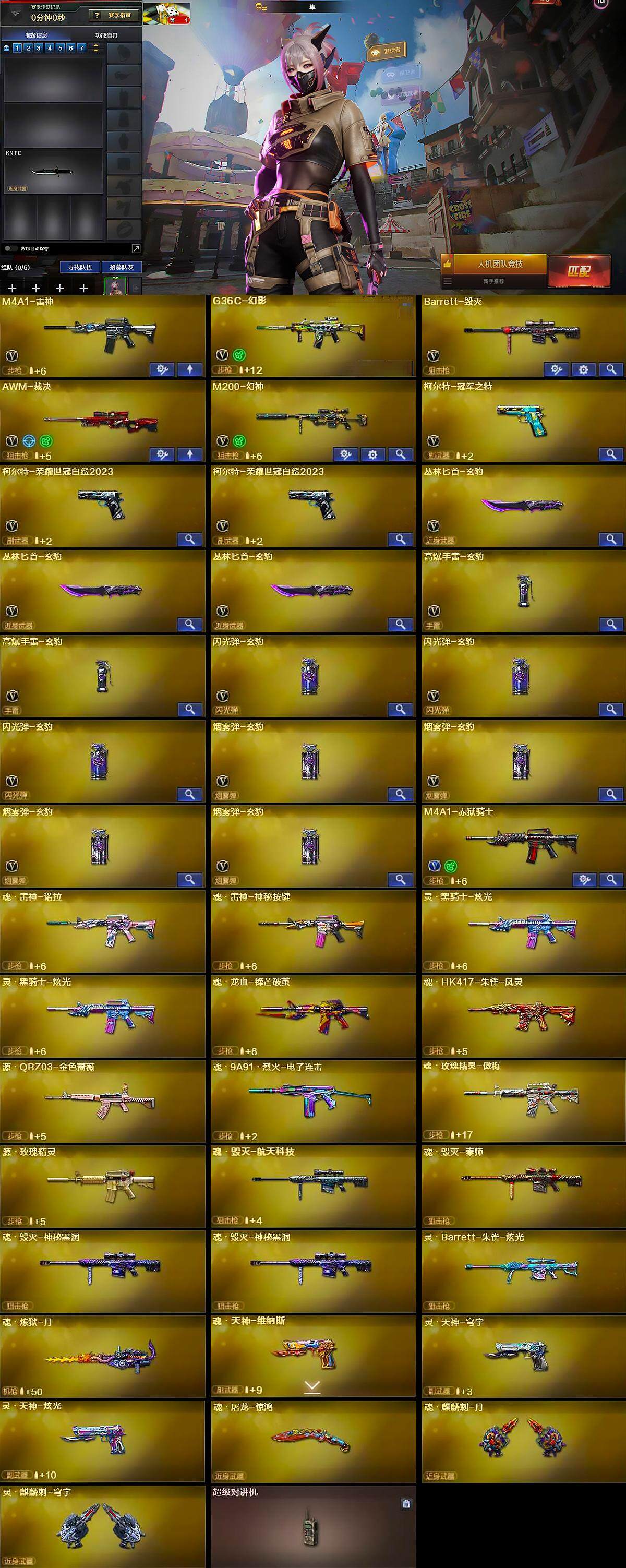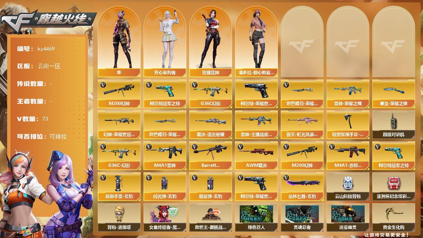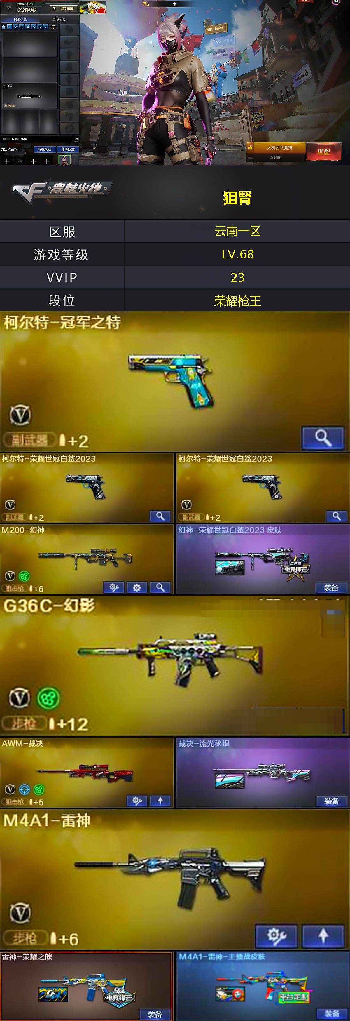 【206834】云南一区-23V-0王者-0炫金【热门武器】:G36C-幻影,M200-幻神,柯尔特-荣耀世冠白鲨2023*2,柯尔特-冠军之特,炽芒蝶刃-荣耀世冠白鲨2023 皮肤【皮肤】:幻神-荣耀世冠白鲨2023 皮肤,裁决-流光秘银,雷神-荣耀之魄,M4A1-雷神-主播战皮肤,毁灭-虹光风暴 皮肤,屠龙-荣耀之锋,轻型军用手斧-再燃火线,炽芒蝶刃-荣耀世冠白鲨2023 皮肤【角色】:隼,