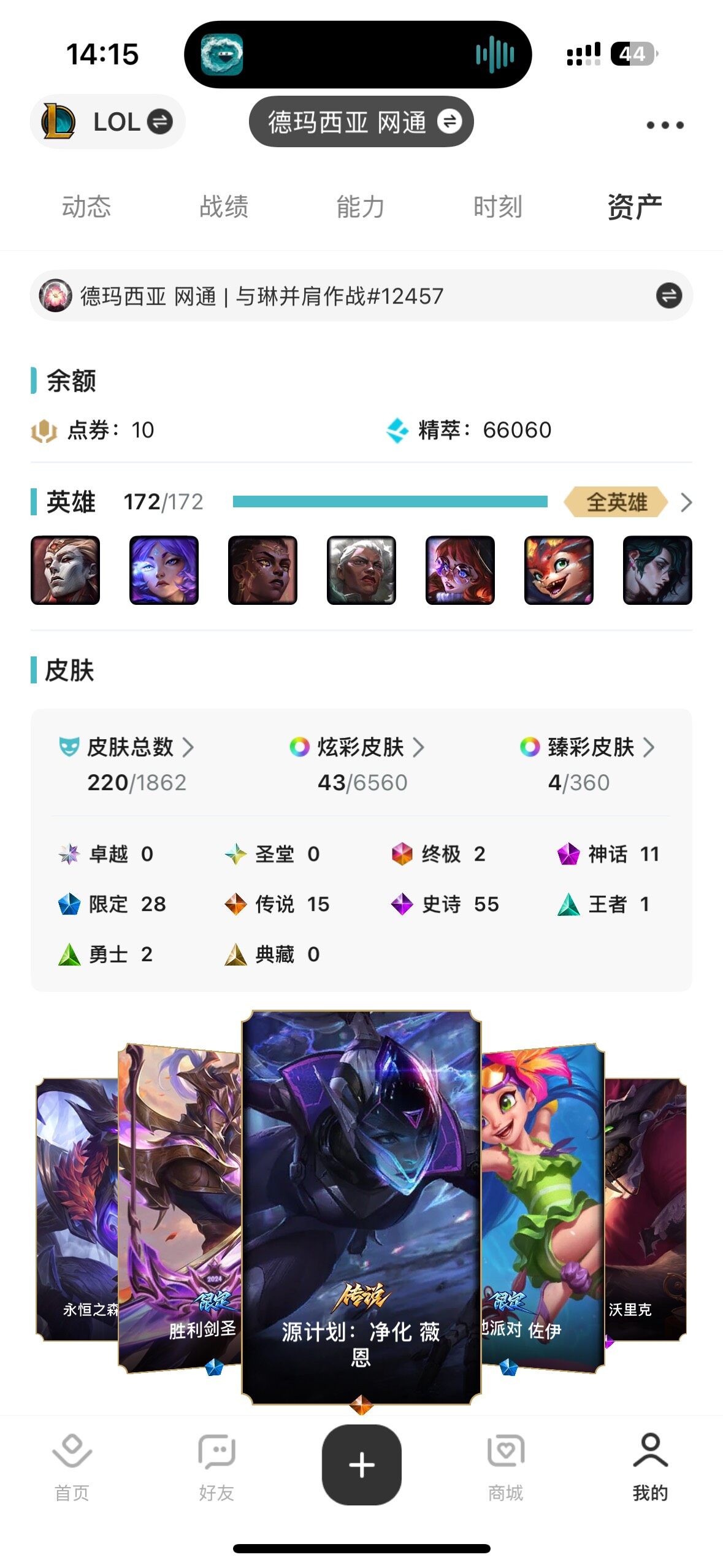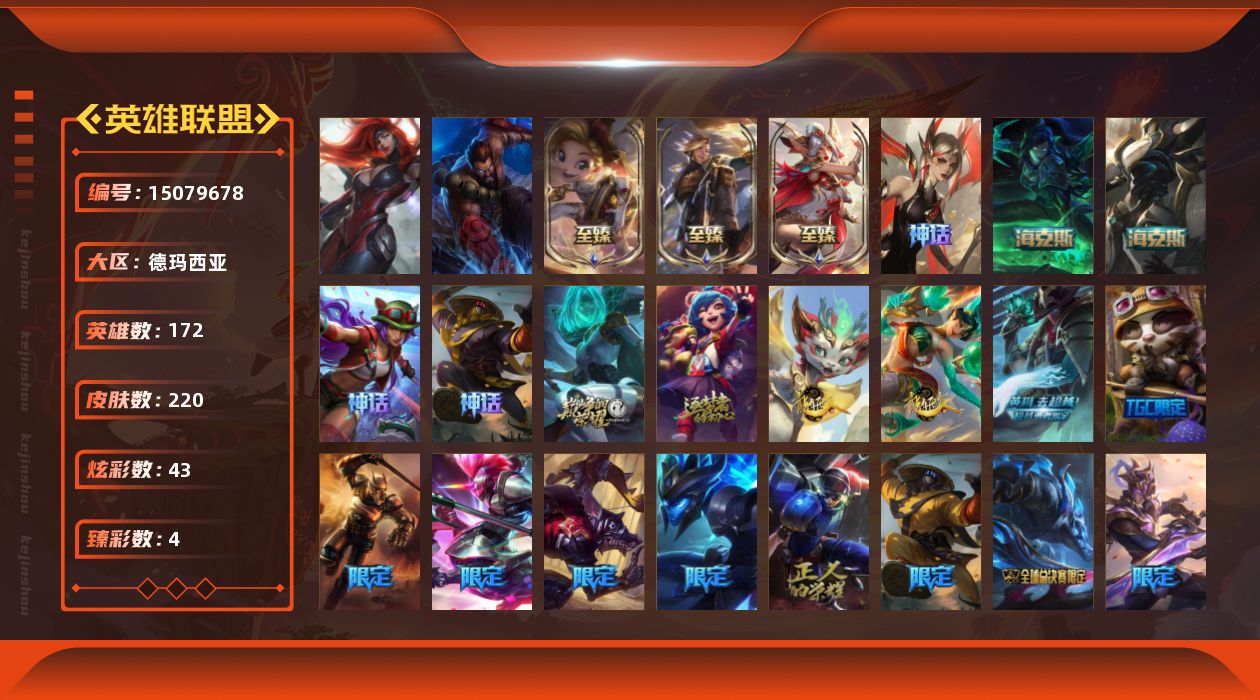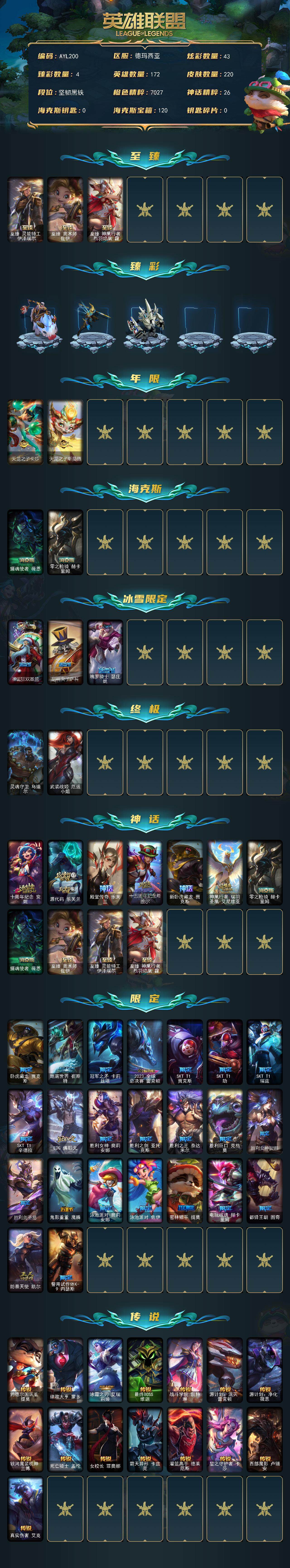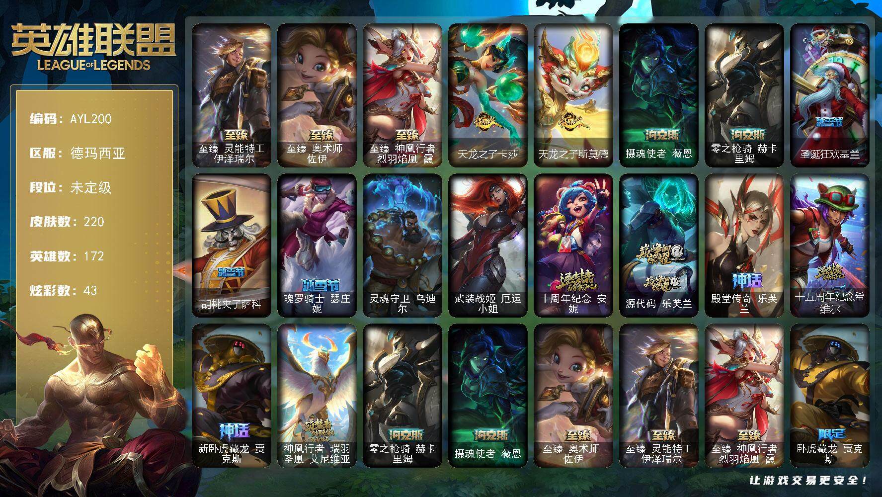【214953】[15079678]可二次【店主推荐捡漏号!可直接换绑】未定级段位-172英雄-220皮肤-43炫彩-2终极-11神话-28限定-15传说-55史诗【至臻皮肤】:至臻灵能特工伊泽瑞尔,至臻奥术师佐伊,至臻神凰行者烈羽焰凰霞【臻彩皮肤】:无畏骑士瑟庄妮赤子初心,冠军之矛卡莉丝塔凯旋圣装,霸天巨兽雪崩墨菲特,殿堂传奇乐芙兰登神【年限皮肤】:天龙之子卡莎,天龙之子斯莫德【海克斯皮肤】: