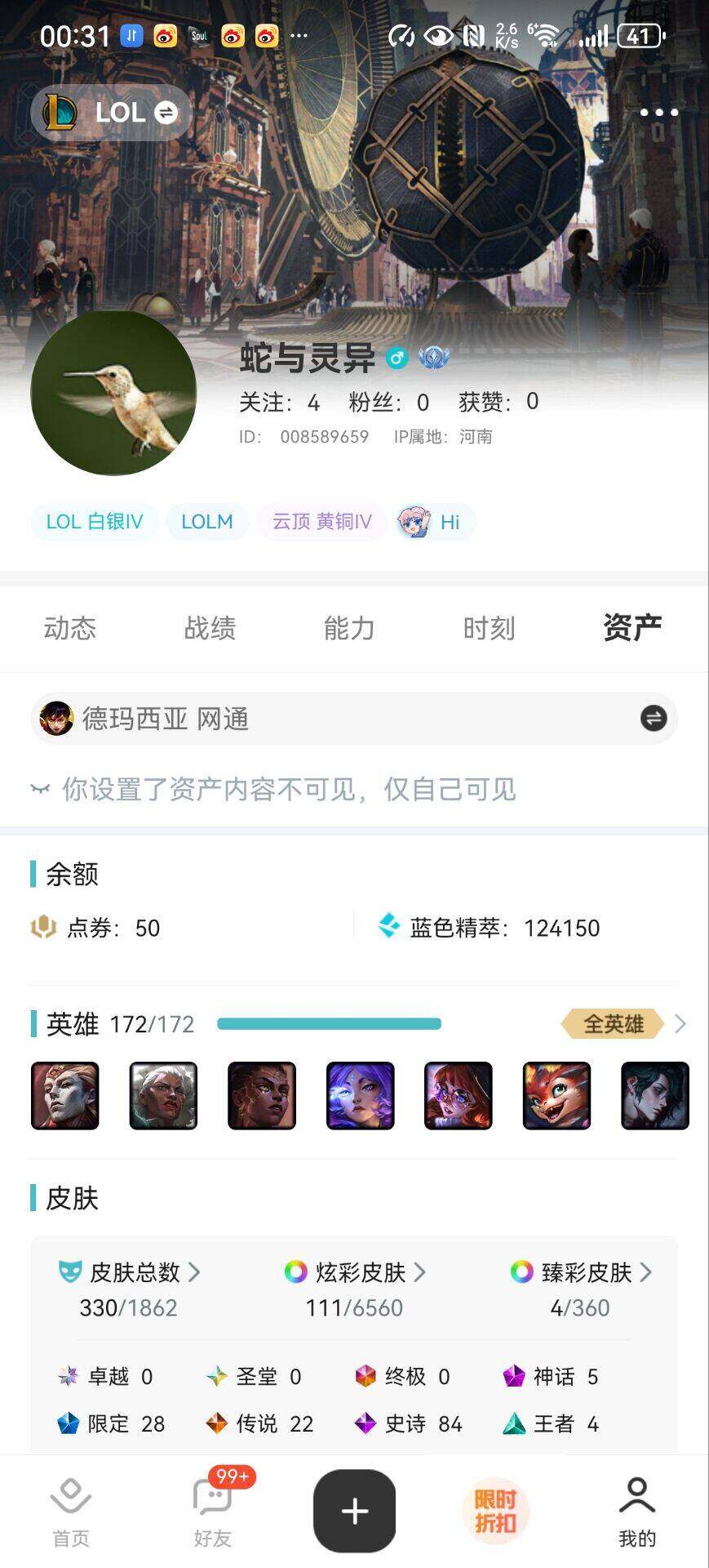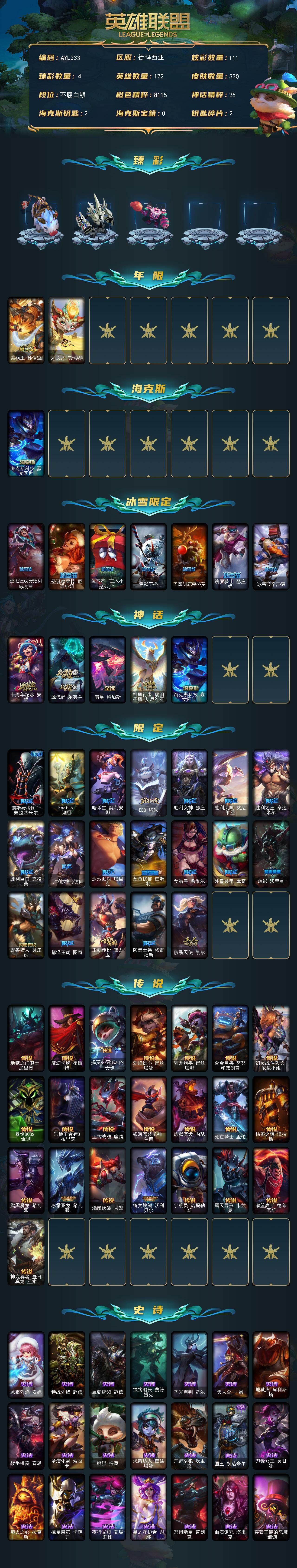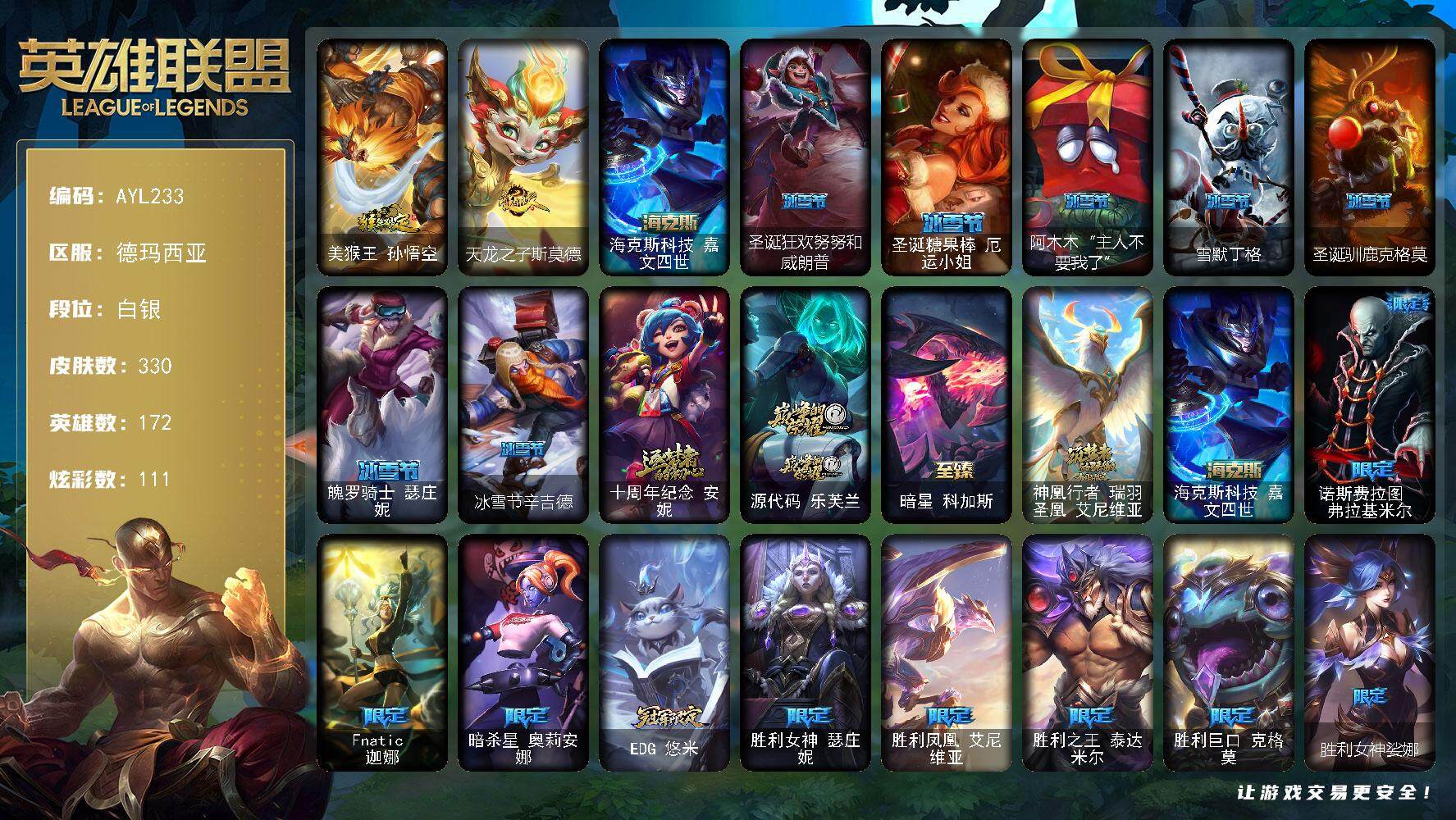 【215028】[15079977]可二次【特价出售/店主推荐】白银段位-172英雄-330皮肤-111炫彩-0终极-5神话-28限定-22传说-84史诗【臻彩皮肤】:无畏骑士瑟庄妮赤子初心,霸天巨兽雪崩墨菲特,可爱可爱粉红红布里茨,星之守护者阿卡丽未来之光【年限皮肤】:美猴王孙悟空,天龙之子斯莫德【海克斯皮肤】:海克斯科技嘉文四世【冰雪限定】:圣诞狂欢努努和威朗普,圣诞糖果棒厄运小姐,阿木木“