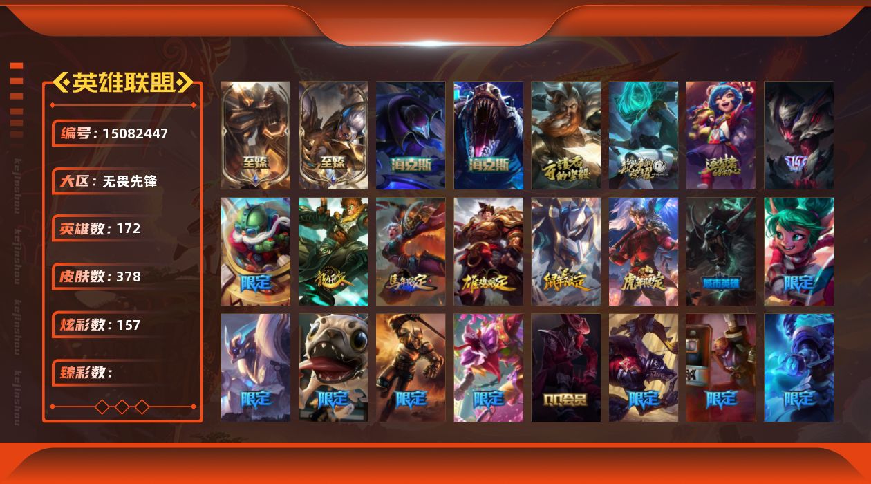 【215676】[15082447]7神话 65限定 43传说 91史诗 378皮肤 157炫彩 172英雄 可二次 可修改实名 【至臻】:至臻 王国机神玄武 盖伦,至臻 神龙尊者 炎龙瑟提【海克斯】:海克斯 魔腾,海克斯 雷克顿【限定】:诸神的黄昏 泰达米尔,钢铁军团 拉克丝,生化领主 泰达米尔【情人节限定】:甜心宝贝 娑娜【赛季限定皮】:胜利巨口 克格莫,胜利之王 泰达米尔,胜利之树 茂凯,