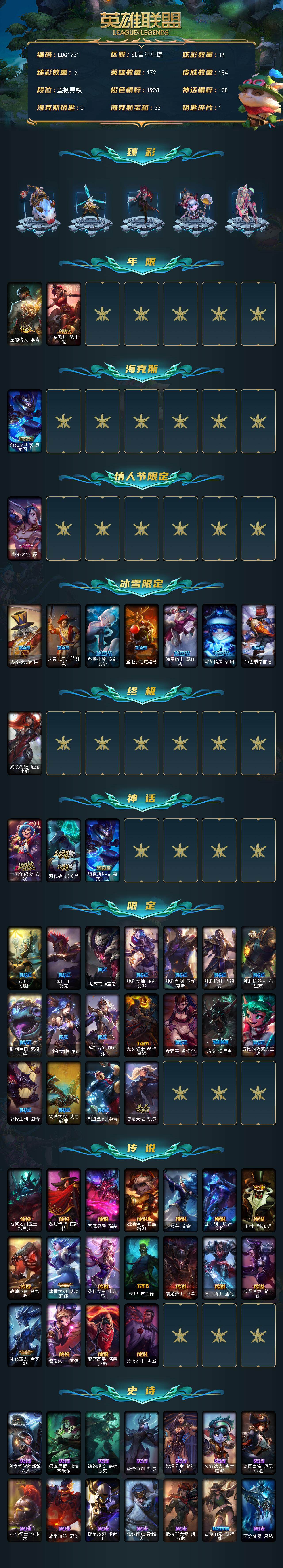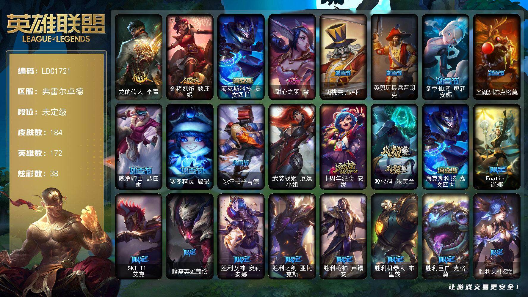 【219990】【LDC1721】172英雄/184皮肤/1终极/3神话/28限定/6臻彩/38炫彩/18传说/48史诗/未定级/无畏骑士瑟庄妮赤子初心/冰霜之刃艾瑞莉娅炫金/西部魔影卢锡安贝利尔之怠/咖啡甜心璐璐焦糖布丁/幻灵战斗猫金克丝梦幻强袭/魔女阿卡丽虚荣/龙的传人李青/金猪烈焰瑟庄妮/海克斯科技嘉文四世/甜心之羽霞/胡桃夹子萨科/英勇玩具兵普朗克/冬季仙境奥莉安娜/圣诞驯鹿克格莫/魄罗
