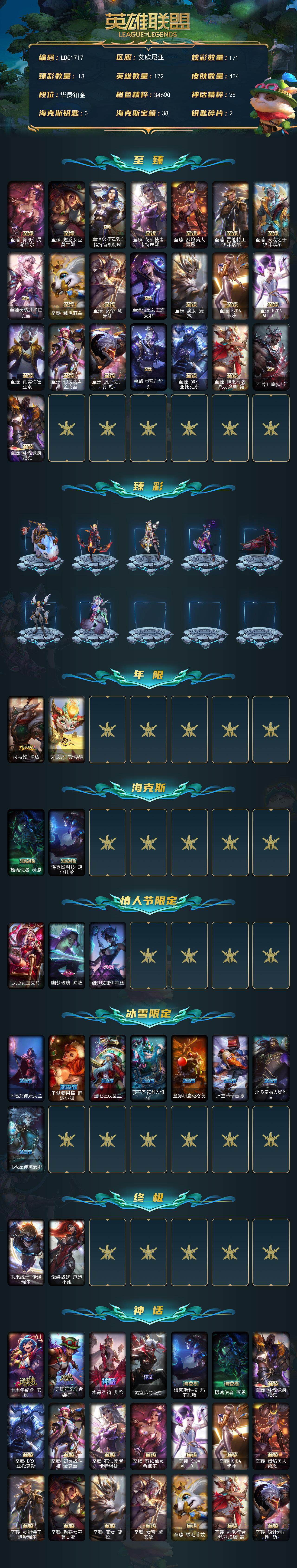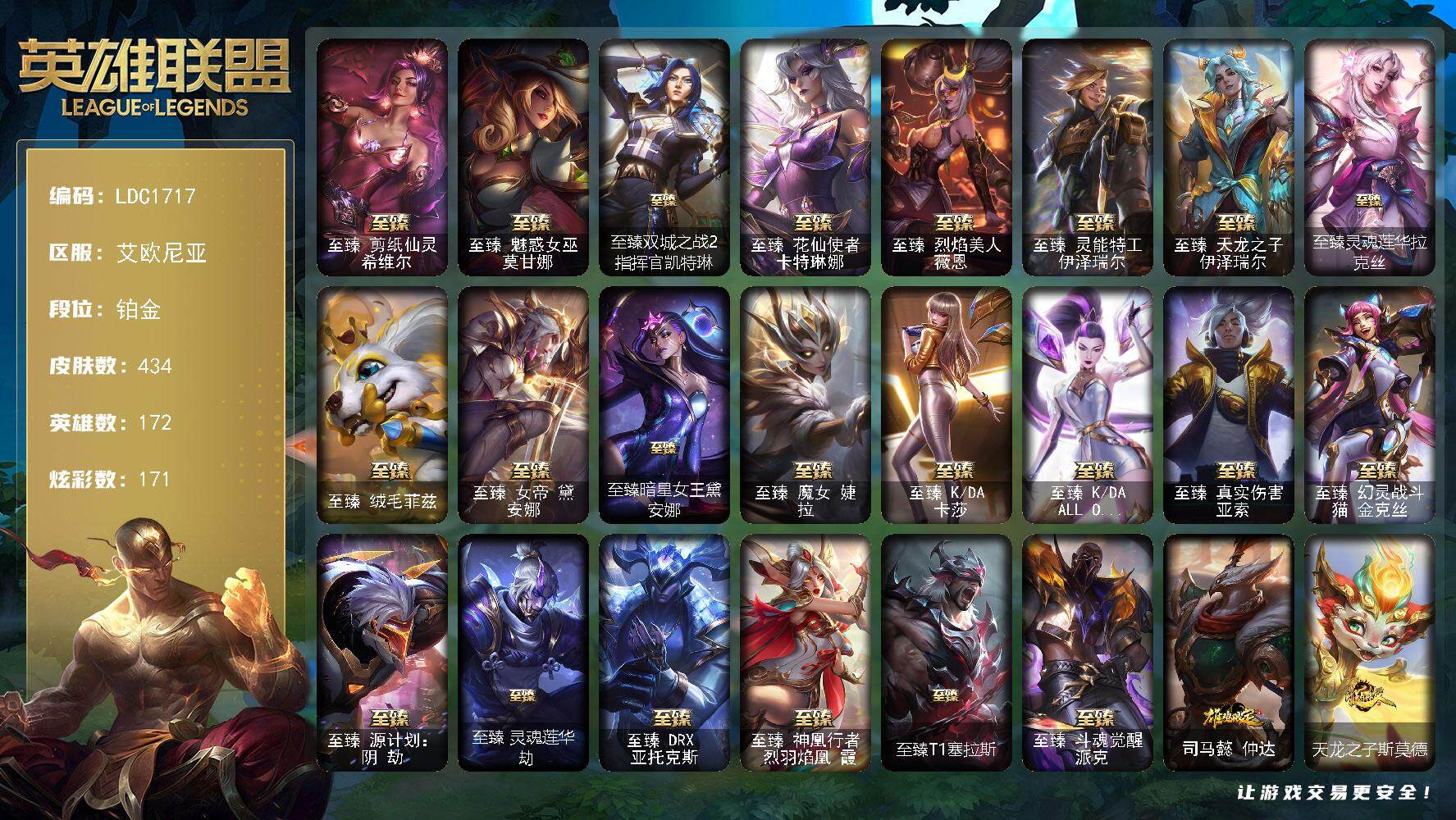 【220021】【LDC1717】172英雄/434皮肤/2终极/28神话/50限定/13臻彩/171炫彩/65传说/79史诗/铂金账号等级:886/至臻剪纸仙灵希维尔/至臻魅惑女巫莫甘娜/至臻双城之战2指挥官凯特琳/至臻花仙使者卡特琳娜/至臻烈焰美人薇恩/至臻灵能特工伊泽瑞尔/至臻天龙之子伊泽瑞尔/至臻灵魂莲华拉克丝/至臻绒毛菲兹/至臻女帝黛安娜/至臻暗星女王黛安娜/至臻魔女婕拉/至臻K/DA