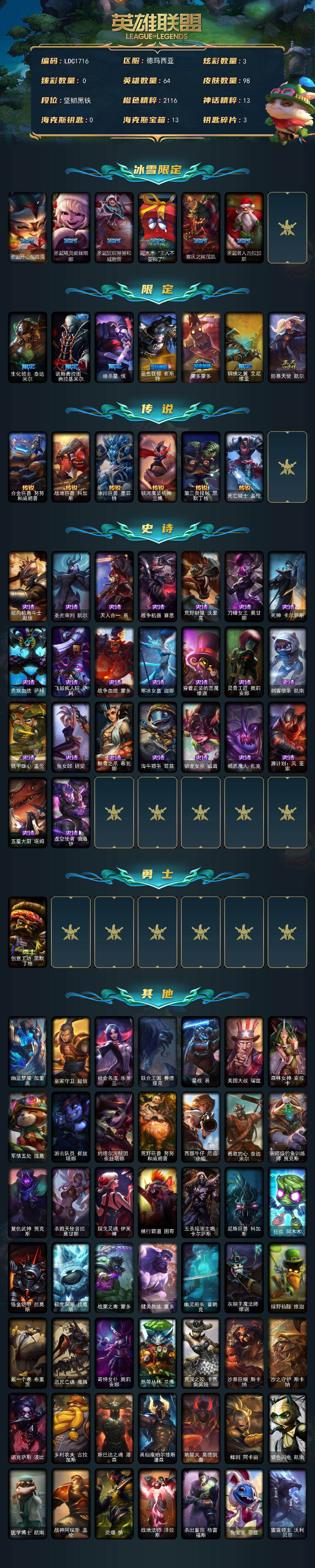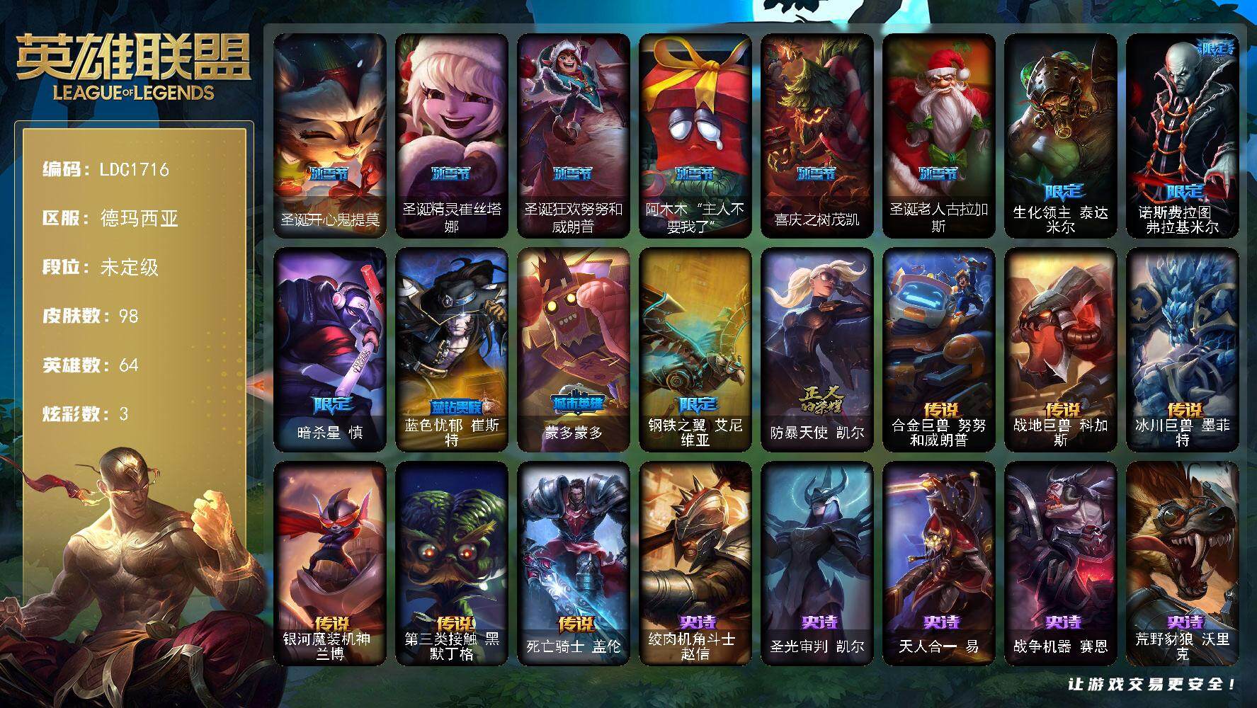 【220027】【LDC1716】64英雄/98皮肤/13限定/3炫彩/6传说/23史诗/未定级账号等级:31/圣诞开心鬼提莫/圣诞精灵崔丝塔娜/圣诞狂欢努努和威朗普/阿木木:“主人不要我了”/喜庆之树茂凯/圣诞老人古拉加斯/生化领主泰达米尔/诺斯费拉图费拉基米尔/暗杀星慎/蓝色忧郁崔斯特/蒙多蒙多/钢铁之翼艾尼维亚/防暴天使凯尔/合金巨兽努努和威朗普/战地巨兽科加斯/冰川巨兽墨菲特/银河魔装机