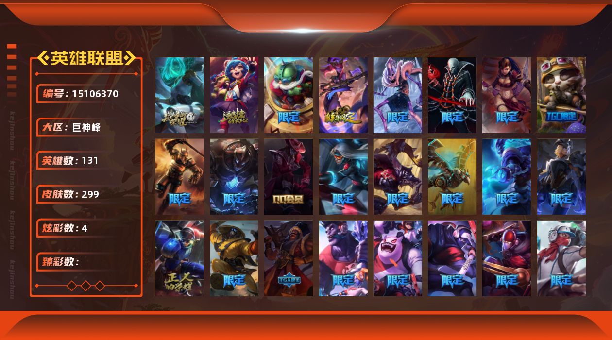 【220233】[15106370]可二次【店主推荐捡漏号!可直接换绑】未定级段位-131英雄-299皮肤-4炫彩-2神话-49限定-25传说-87史诗【年限皮肤】:玉净夜叉凯特琳【情人节限定】:觅心游侠卢锡安【冰雪限定】:幸福女神乐芙兰,圣诞开心鬼提莫,圣诞精灵崔丝塔娜,圣诞狂欢努努和威朗普,圣诞糖果棒厄运小姐,圣诞狂欢基兰,阿木木“主人不要我了”,胡桃夹子萨科,平安夜女神娑娜,英勇玩具兵普朗