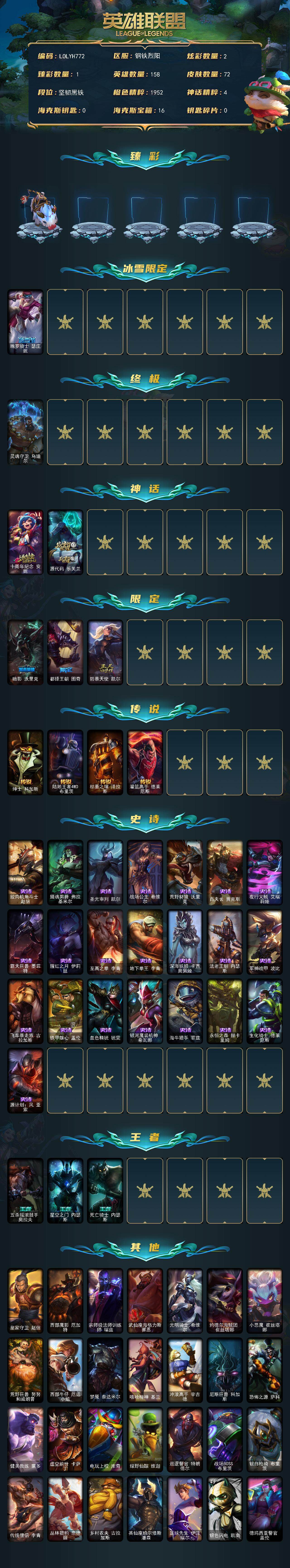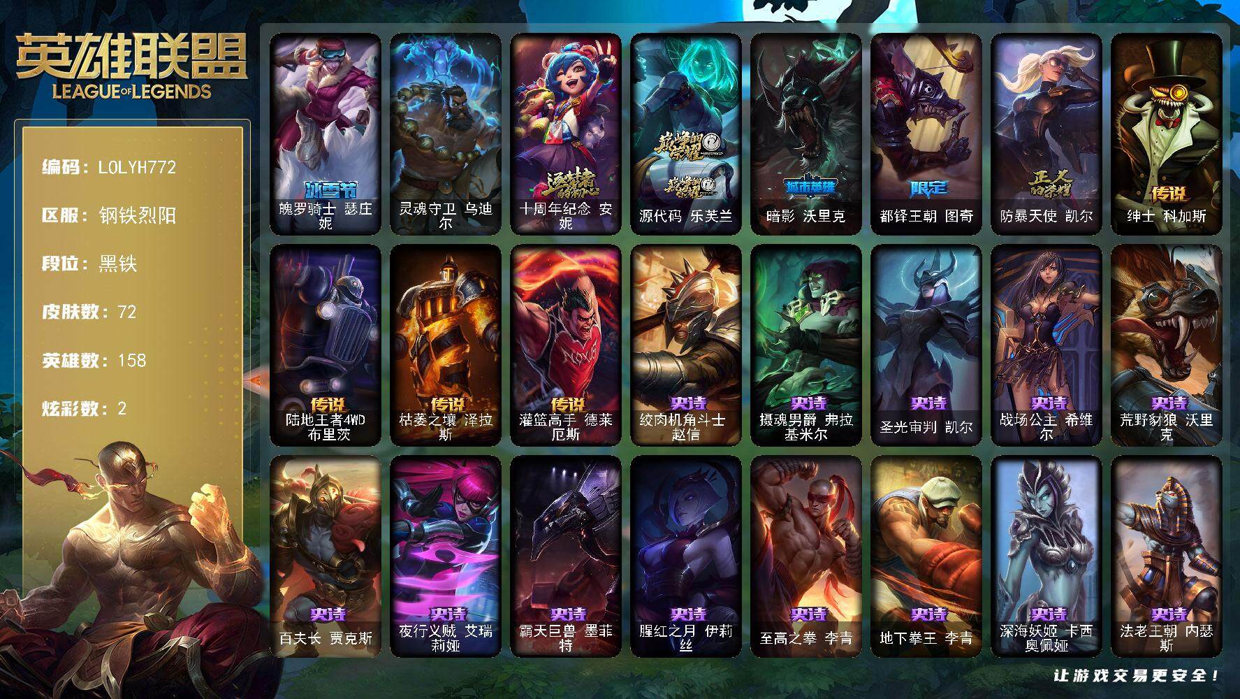 【220335】【LOLYH772】158英雄/72皮肤/1终极/2神话/4限定/1臻彩/2炫彩/4传说/22史诗/黑铁/无畏骑士瑟庄妮赤子初心/魄罗骑士瑟庄妮/灵魂守卫乌迪尔/十周年纪念安妮/源代码乐芙兰/暗影妖狐阿狸/都铎王朝图奇/防暴天使凯尔/绅士科加斯/陆地王者4WD布里茨/枯萎之壤泽拉斯/灌篮高手德莱厄斯/绞肉机角斗士赵信/摄魂男爵费拉基米尔/圣光审判凯尔/战场公主希维尔/荒野豺狼沃里