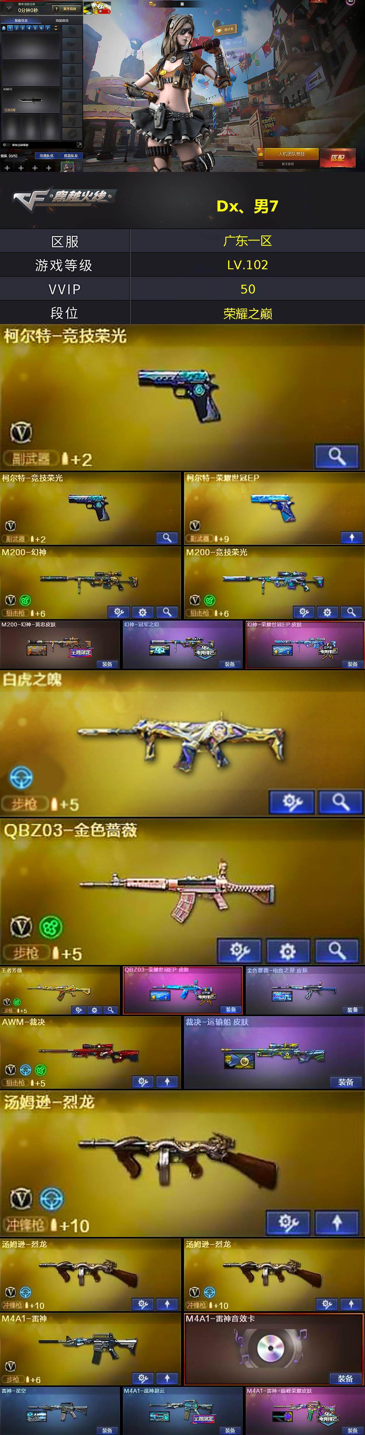 【231433】【231433】广东一区-50V-6王者-3炫金【热门武器】:QBZ03-金色蔷薇,M200-幻神,M200-竞技荣光,死亡之眼,白虎之魄,M