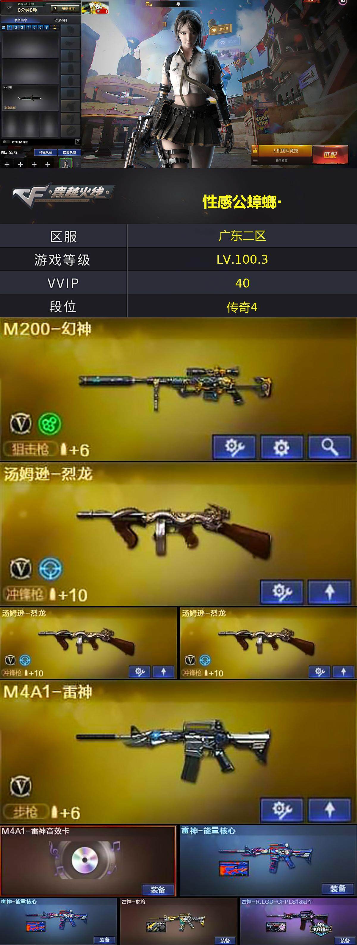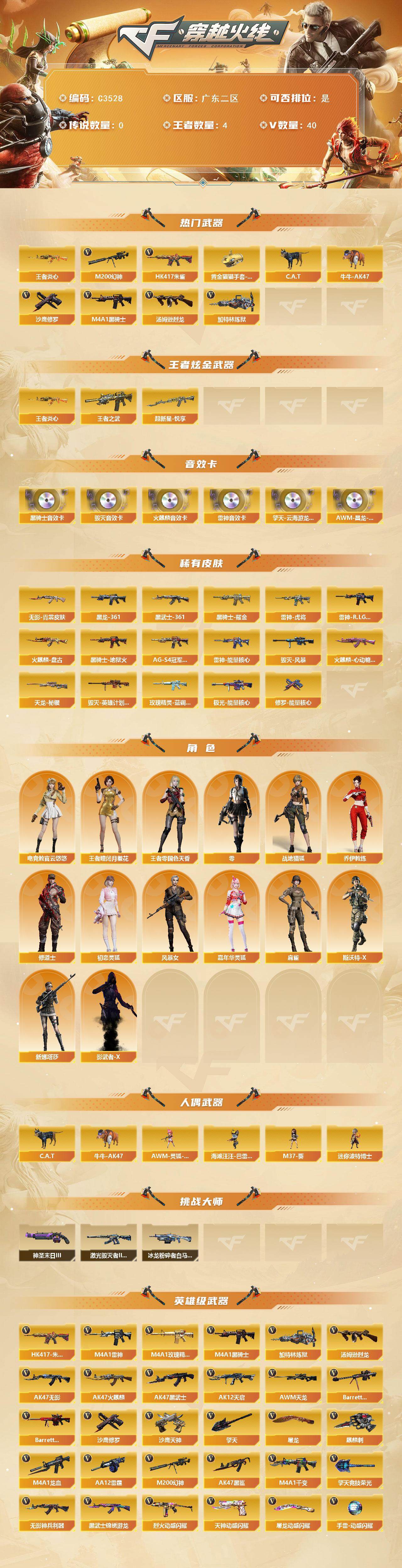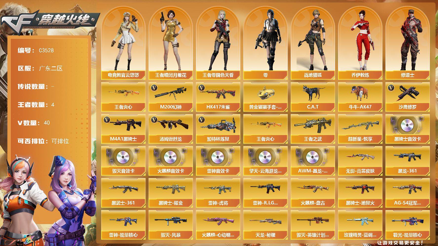 【231533】【231533】【C3528】广东二区-40V-4王者-0炫金【热门武器】:HK417-朱雀,M200-幻神,王者炎心,C.A.T,牛牛-AK