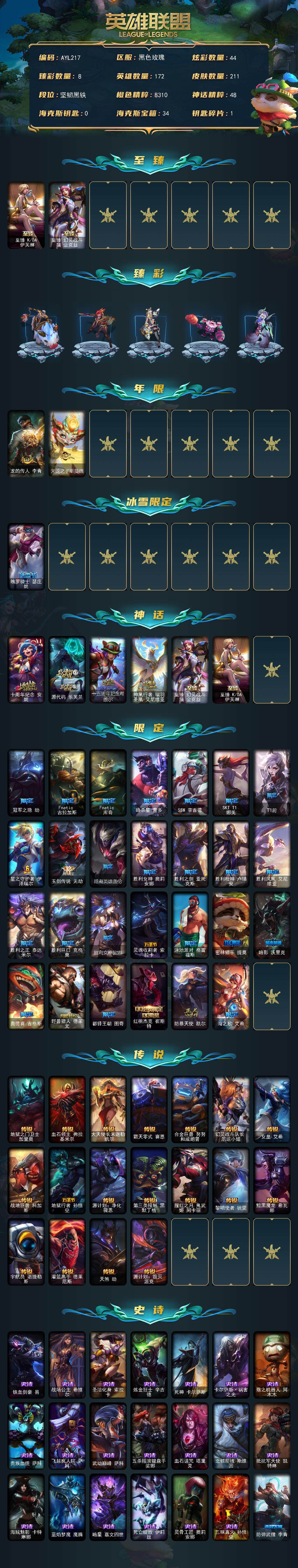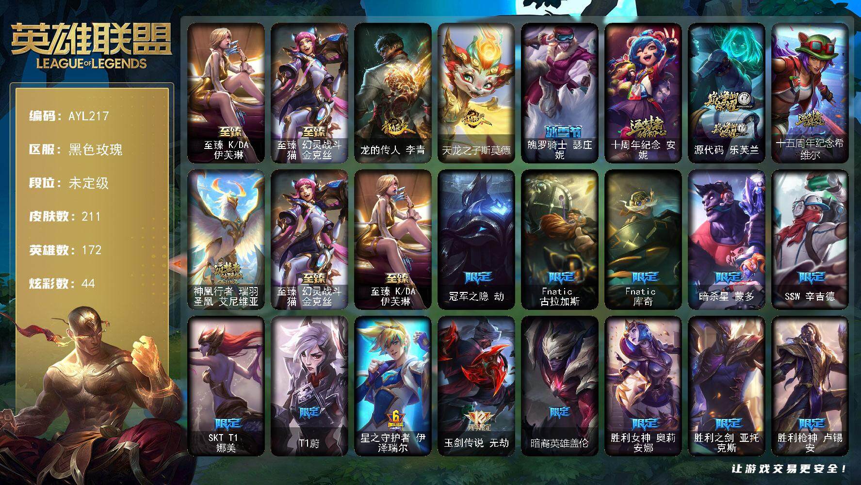 【233964】[15189169]【店主推荐捡漏号】未定级段位-172英雄-211皮肤-44炫彩-0终极-6神话-30限定-18传说-49史诗【至臻皮肤】:至臻KDA伊芙琳,至臻幻灵战斗猫金克丝【臻彩皮肤】:无畏骑士瑟庄妮赤子初心,冠军之刃锐雯2016凯旋圣装,黎明使者锐雯黑夜使者,咖啡甜心金克丝核桃巴菲,可爱可爱粉红红布里茨,魔女阿卡丽虚荣,净雪之月莫甘娜冬虹,黑夜使者嘉文四世白夜【年限皮肤