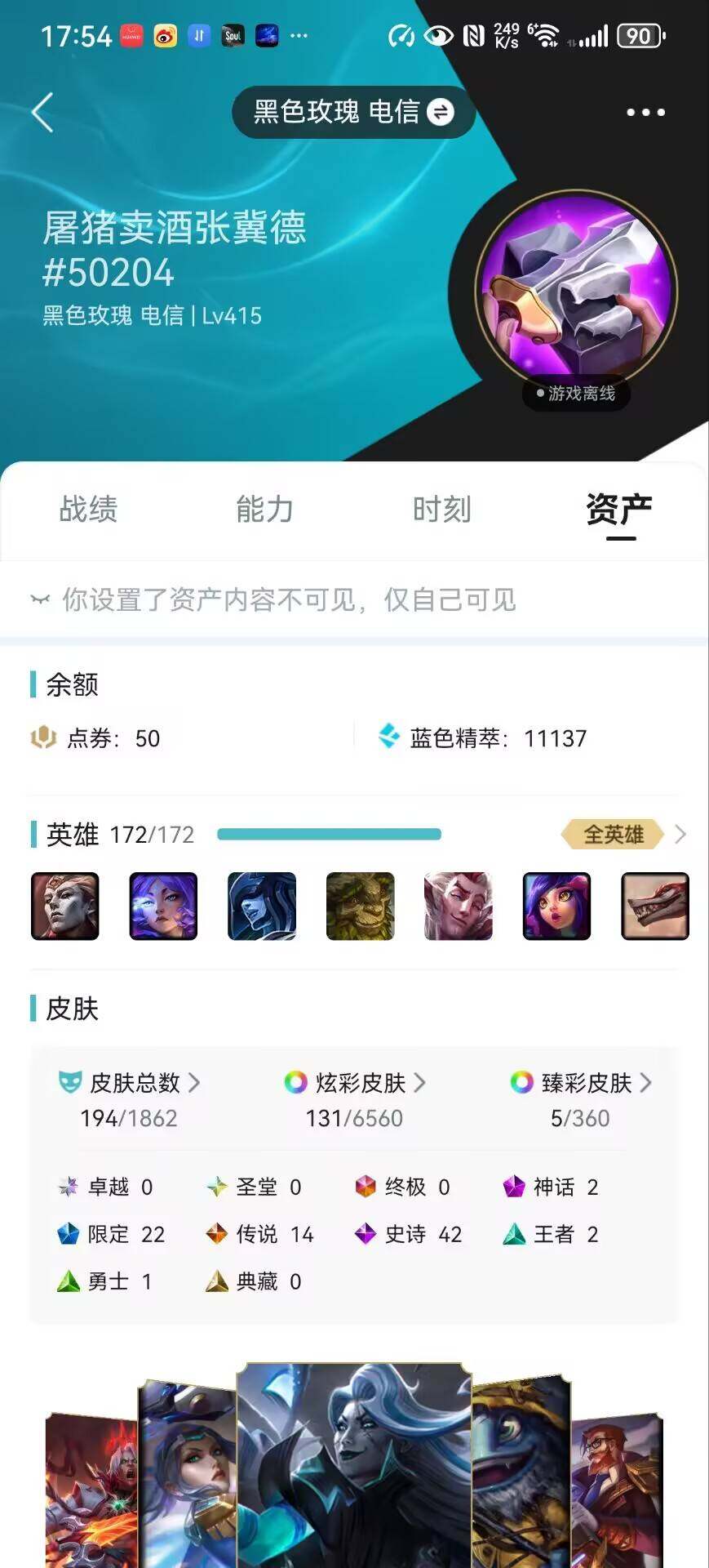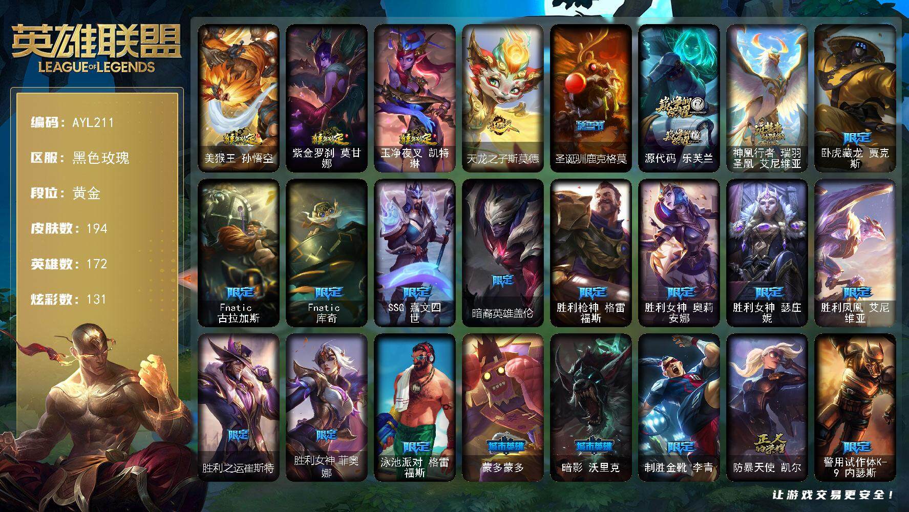 【234102】[15189934]【特价出售/店主推荐】黄金段位-172英雄-194皮肤-131炫彩-0终极-2神话-22限定-14传说-42史诗【臻彩皮肤】:冠军之志瑞兹凯旋圣装,玉剑传说翼剑仙珠光,灵魂莲华卡西奥佩娅流火,战斗学院盖伦不死鸟,魔女阿卡丽虚荣【年限皮肤】:美猴王孙悟空,紫金罗刹莫甘娜,玉净夜叉凯特琳,天龙之子斯莫德【冰雪限定】:圣诞驯鹿克格莫【神话皮肤】:源代码乐芙兰,神凰行