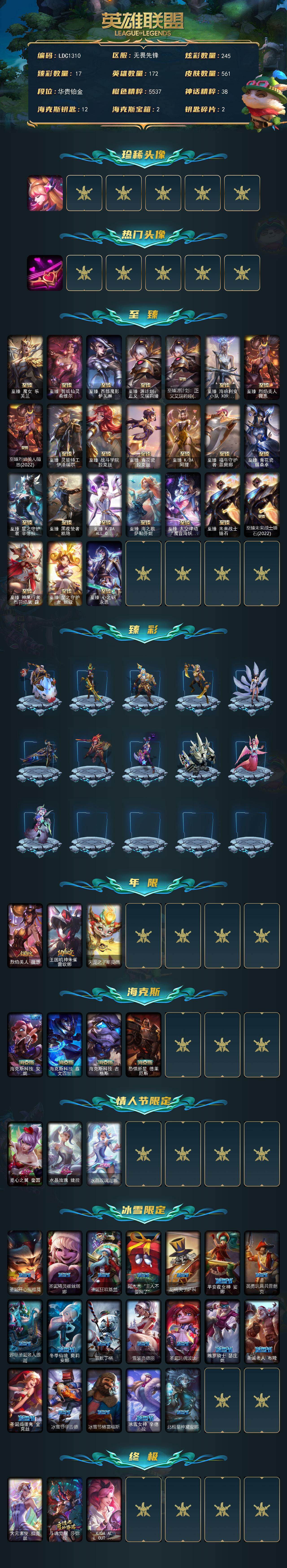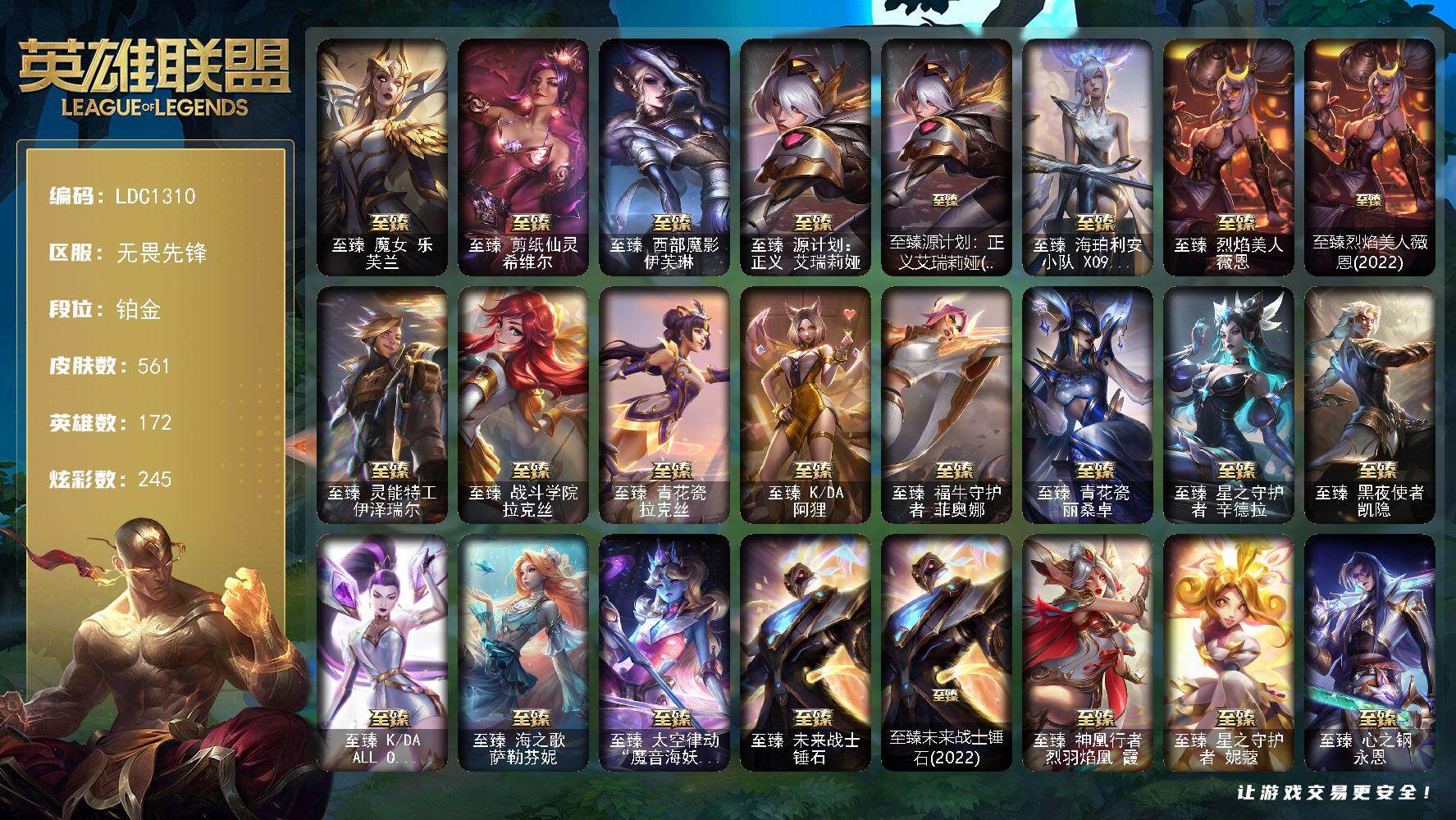 【246940】【LDC1310】172英雄/561皮肤/5终极/33神话/65限定/17臻彩/245炫彩/50传说/131史诗/铂金账号等级:1048/星守阿狸/爱情之歌/至臻魔女乐芙兰/至臻剪纸仙灵希维尔/至臻西部魔影伊芙琳/至臻源计划:正义艾瑞莉娅/至臻源计划:正义艾瑞莉娅(2022)/至臻海珀利安小队X09星环灵风迦娜/至臻烈焰美人薇恩/至臻烈焰美人薇恩(2022)/至臻灵能特工伊泽瑞尔
