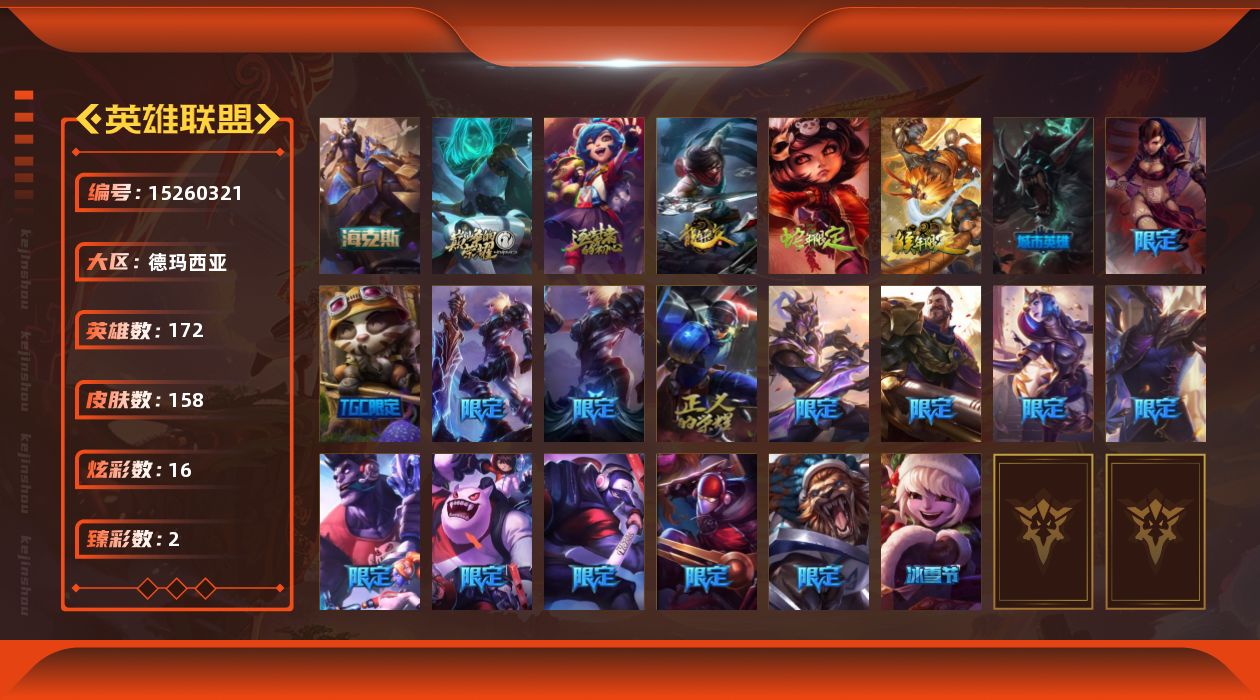 【246959】[15260321]可二次【店主推荐捡漏号!可直接换绑】铂金段位-172英雄-158皮肤-16炫彩-0终极-4神话-23限定-12传说-39史诗【臻彩皮肤】:冠军之刃锐雯2016凯旋圣装,春晖神女艾希玉露金风【年限皮肤】:银龙裁决泰隆,你看见过我的熊猫吗安妮,美猴王孙悟空【海克斯皮肤】:海克斯科技瑟庄妮【冰雪限定】:圣诞精灵崔丝塔娜,阿木木“主人不要我了”,圣诞老人古拉加斯【神话