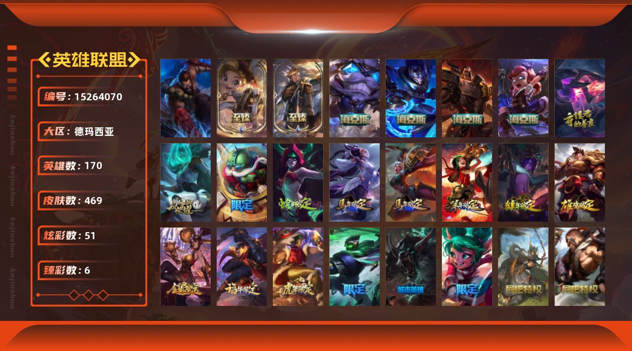 【247861】[15264070]t32399【德玛西亚】原皮龙瞎 469皮肤 51炫彩 6臻彩 9神话/106限定/49传说/170英雄 账号等级:462 【重要头像】可爱安妮 披萨鸡 送披萨的小姐姐希维尔 至臻奥术师佐伊 【重要皮肤】奥术师佐伊至臻 灵能特工伊泽瑞尔至臻 海克斯科技安妮 海克斯科技吉格斯 海克斯科技嘉文四世 暗星科加斯 恐惧新星德莱厄斯 胜利之王泰达米尔 奥斯曼大帝泰达米尔