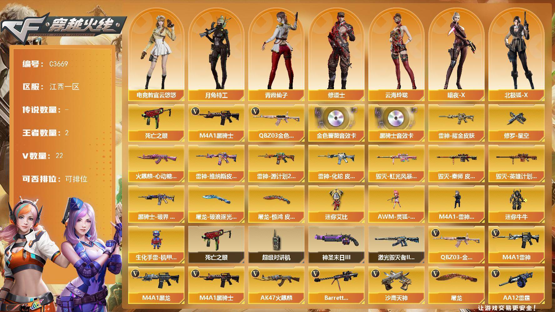 【264614】【264614】【C3669】江西一区-22V-2王者-0炫金【热门武器】:QBZ03-金色蔷薇,死亡之眼,M4A1-黑骑士【音效卡】:M4A