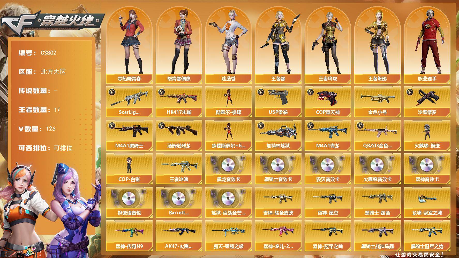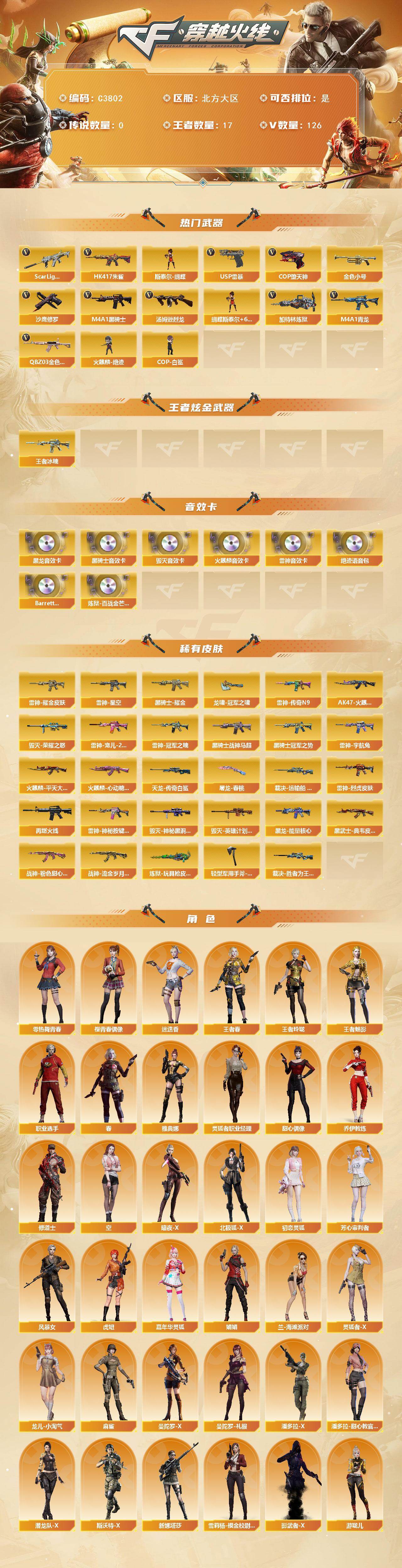 【306936】【306936】【C3802】北方大区-126V-17王者-0炫金【热门武器】:QBZ03-金色蔷薇,Scar Light-白虎,HK417-