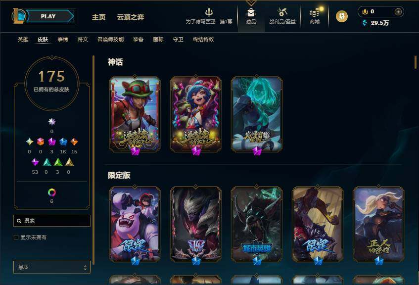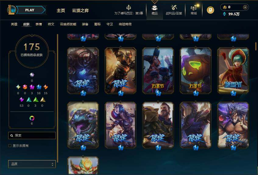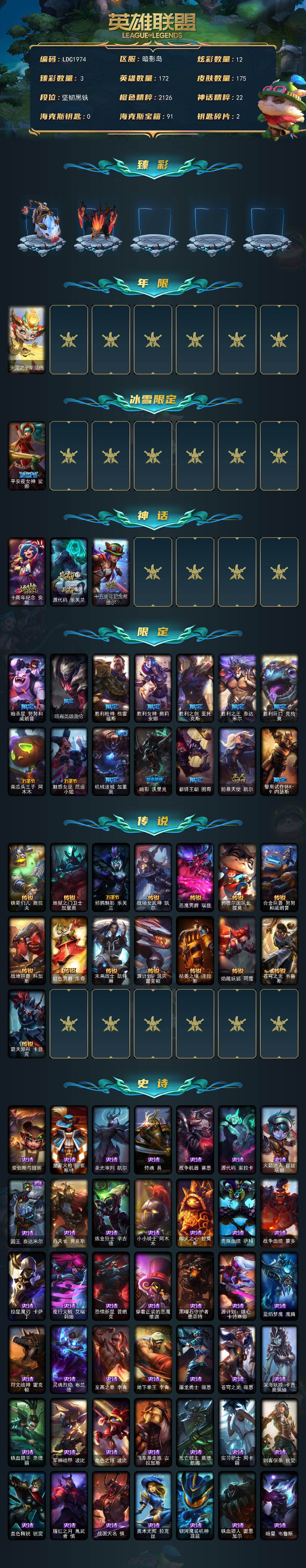 【314201】【LDC1974】172英雄/175皮肤/3神话/16限定/3臻彩/12炫彩/15传说/53史诗/未定级/无畏骑士瑟庄妮赤子初心/山海绘卷科加斯朱红/魔女阿卡丽虚荣/天龙之子斯莫德/平安夜女神娑娜/十周年纪念安妮/源代码乐芙兰/十五周年纪念希维尔/暗杀星努努和威朗普/暗裔英雄盖伦/胜利枪神格雷福斯/胜利女神奥莉安娜/胜利之剑亚托克斯/胜利之王泰达米尔/胜利巨口克格莫/南瓜头王子阿
