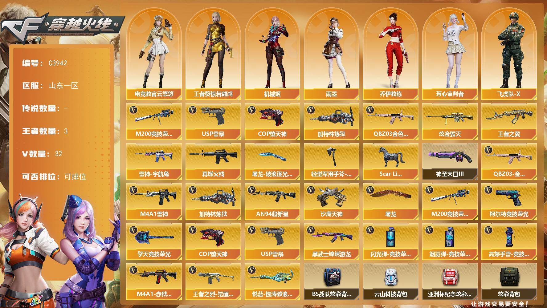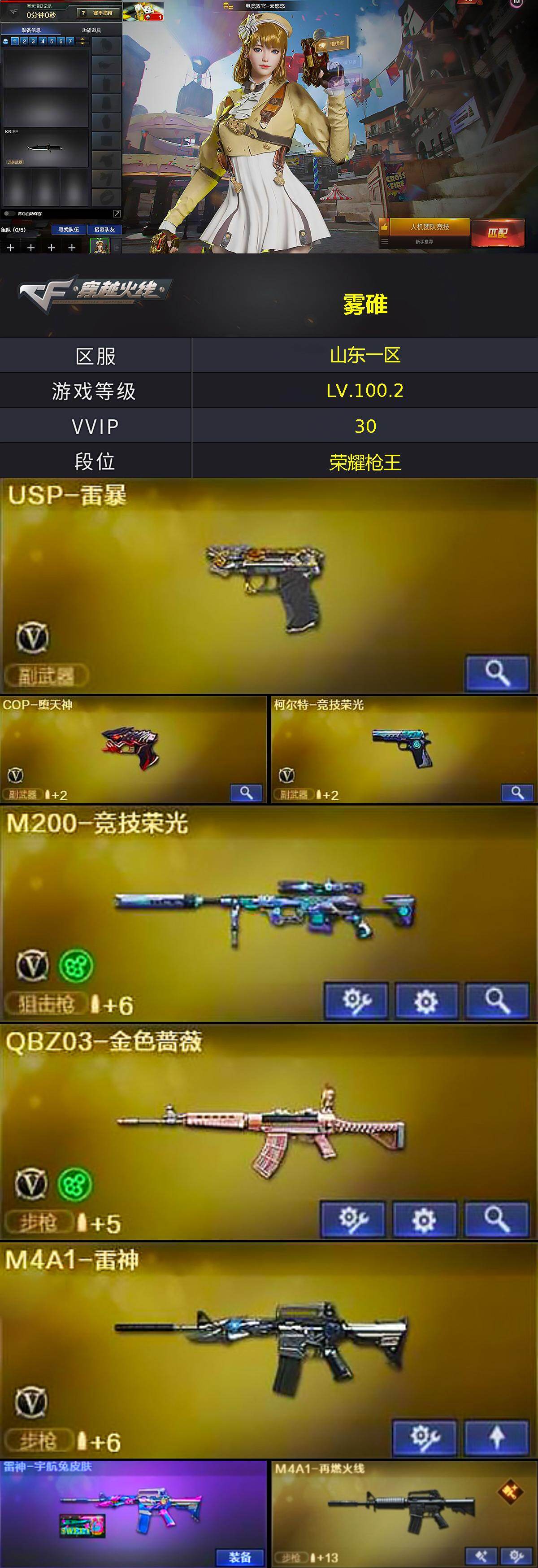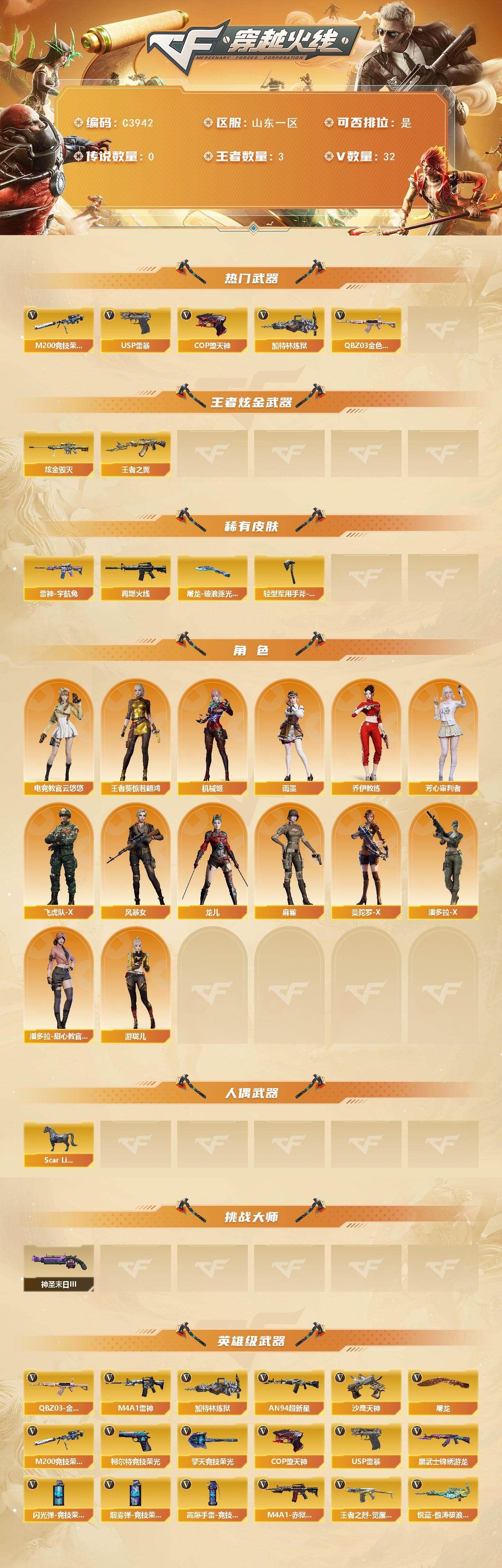 【320219】【320219】[15678066]山东一区-32V-3王者-1炫金【热门武器】:QBZ03-金色蔷薇,M200-竞技荣光,加特林-炼狱*2,