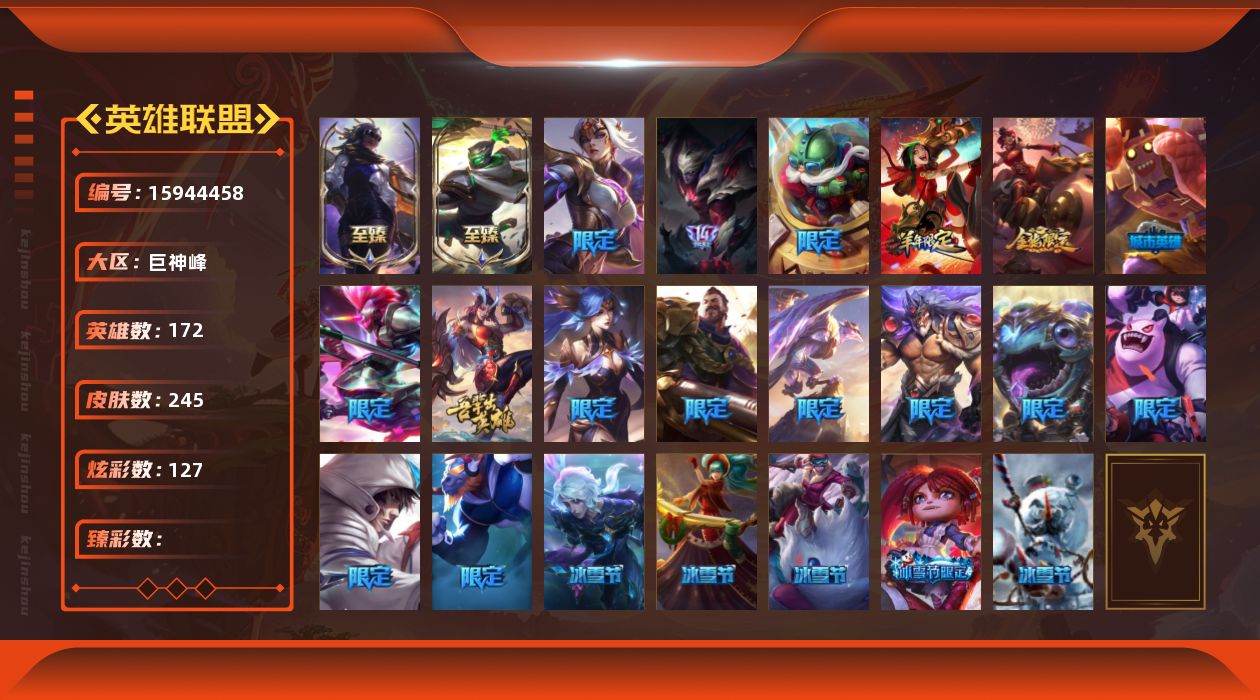【359342】2神话 23限定 21传说 66史诗 245皮肤 127炫彩 172英雄 可二次 可修改实名 【至臻】至臻 真实伤害 赛娜,至臻 征服者 贾克斯【限定】玉剑传说 舞龙卫【赛季限定皮】胜利凤凰 艾尼维亚,胜利女神-菲奥娜,胜利女神 娑娜,胜利巨口 克格莫,胜利之王 泰达米尔,胜利枪神 格雷福斯【冠军限定系列】S2 暗杀星 努努,S4 SSW 泰隆,S5 SKT T1 阿利斯塔【冰雪