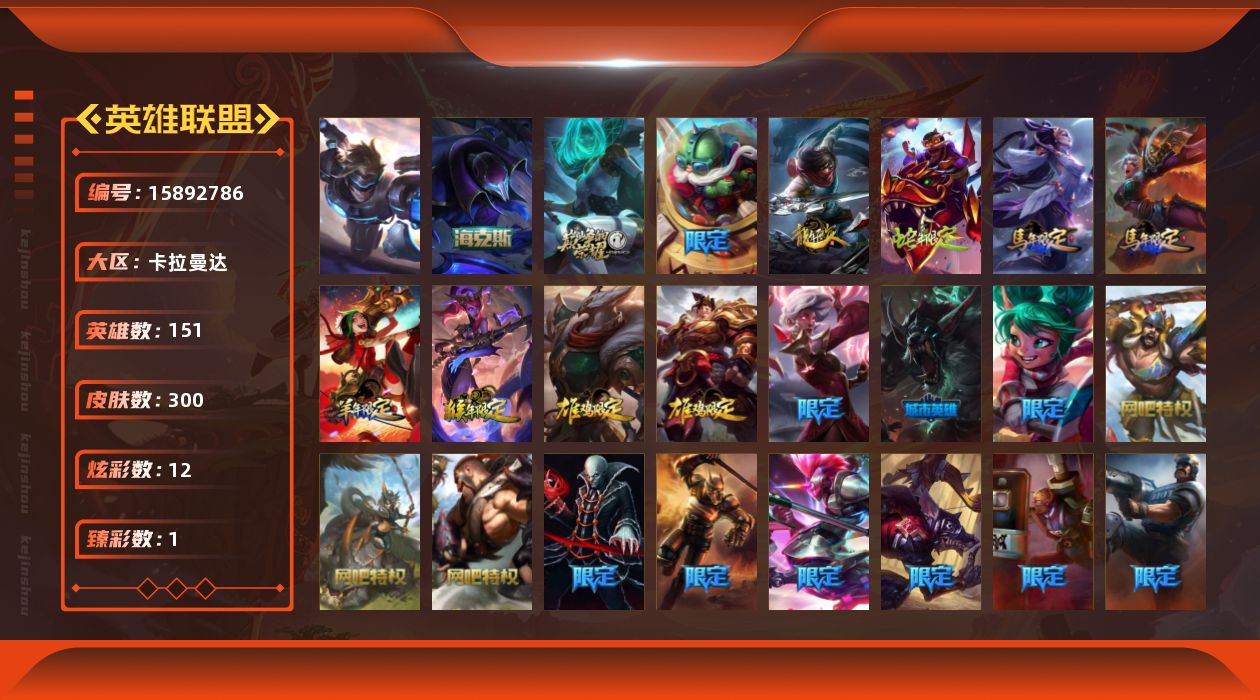 【359661】[15892786]实名: 可修改 英雄数: 151 皮肤数: 300 炫彩数: 12 海克斯: 海克斯 魔腾 情人节限定: 觅心魔灵 奥利安娜,觅心之翼 奎因 冠军限定系列: S1FNC 酒桶,S1FNC 迦娜,S1FNC 嘉文四世,S1FNC 卡尔萨斯,S1FNC 库奇,S2 暗杀星 蒙多,S3 SKT T1 婕拉,S4 SSW 雷恩加尔,S4 SSW 图奇,S4 SSW 炼