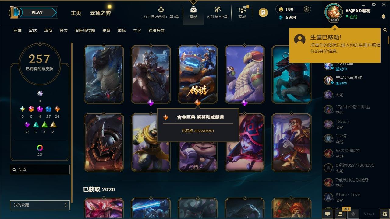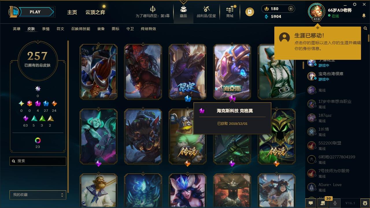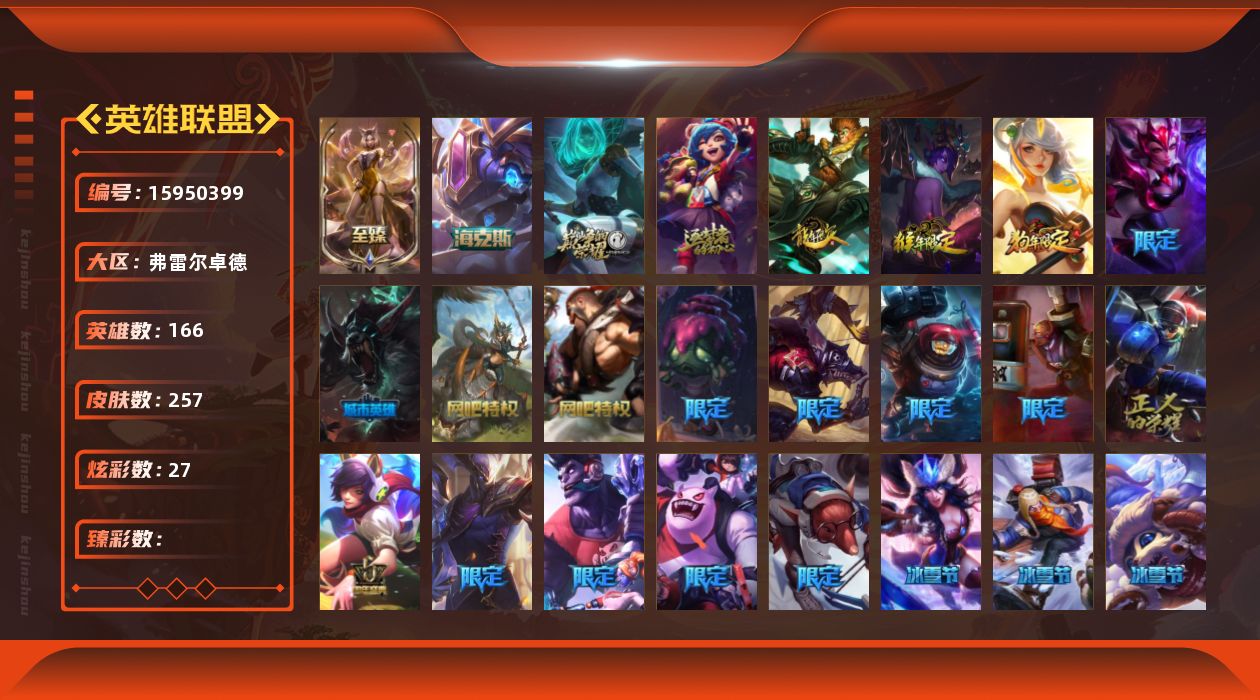 【360252】[15950399]4神话 27限定 24传说 63史诗 257皮肤 27炫彩 166英雄 可二次 可修改实名 【至臻】至臻 K/DA 阿狸【海克斯】海克斯 克格莫【赛季限定皮】胜利之剑 亚托克斯【冠军限定系列】S2 暗杀星 蒙多,S2 暗杀星 努努,S4 SSW 图奇【冰雪节限定】冰雪风暴 希维尔,冰雪节 辛吉德,冰雪兽 纳尔,胡桃夹子 萨科,平安夜女神 娑娜【泳池派对】泳池派
