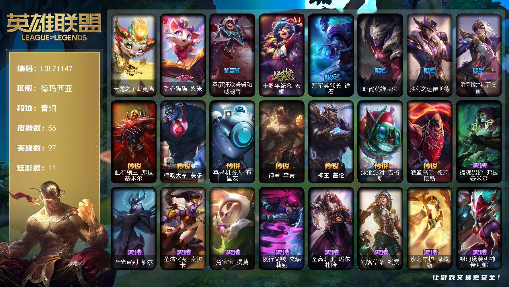 【363866】【LOLZ1147】97英雄/56皮肤/1神话/7限定/3臻彩/11炫彩/7传说/11史诗/青铜/冠军之血希瓦娜凯旋圣装/咖啡甜心金克丝核桃巴菲/魔女阿狸饕餮/天龙之子斯莫德/觅心猫猫悠米/圣诞狂欢努努和威朗普/十周年纪念安妮/冠军典狱长锤石/暗裔英雄盖伦/胜利之运崔斯特/胜利女神菲奥娜/血石领主弗拉基米尔/律政大亨蒙多/苹果机器人布里茨/神拳李青/神王盖伦/泳池派对吉格斯/灌篮