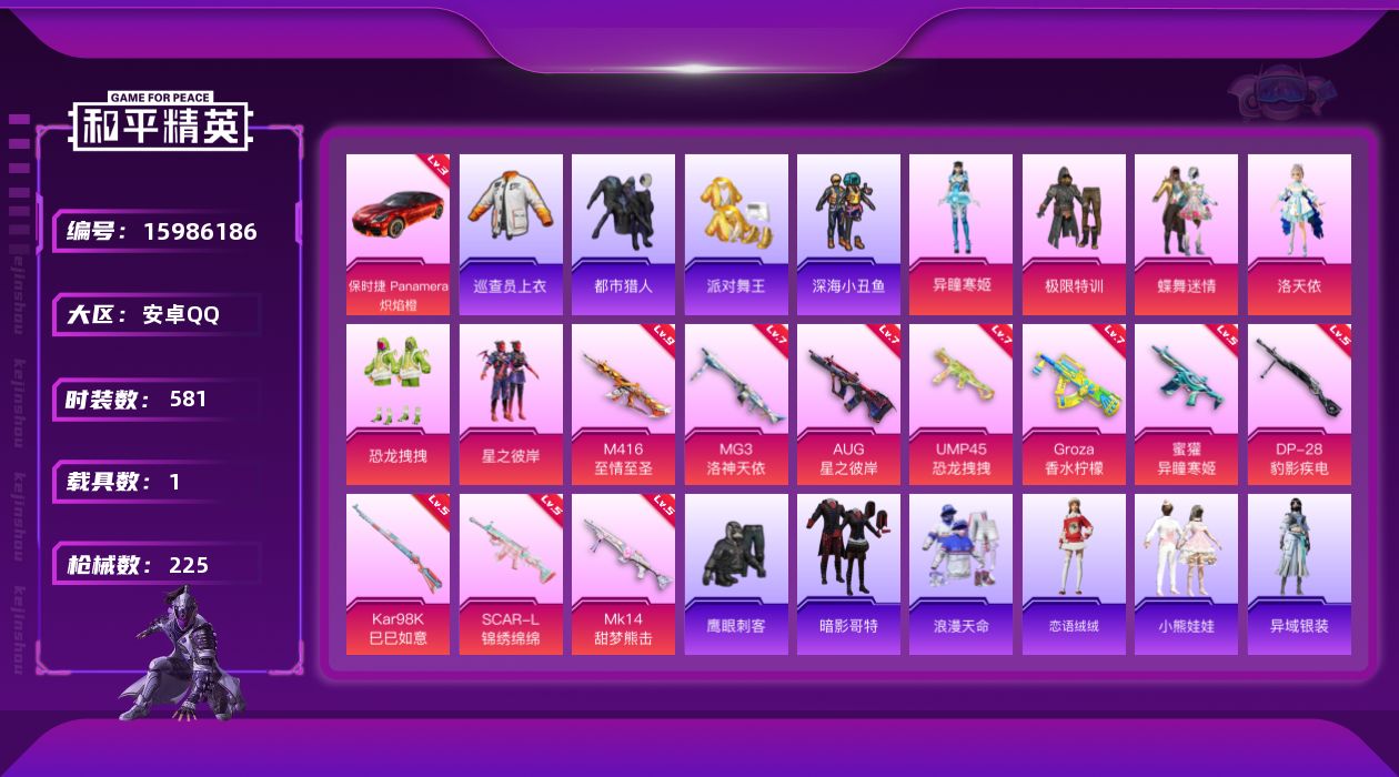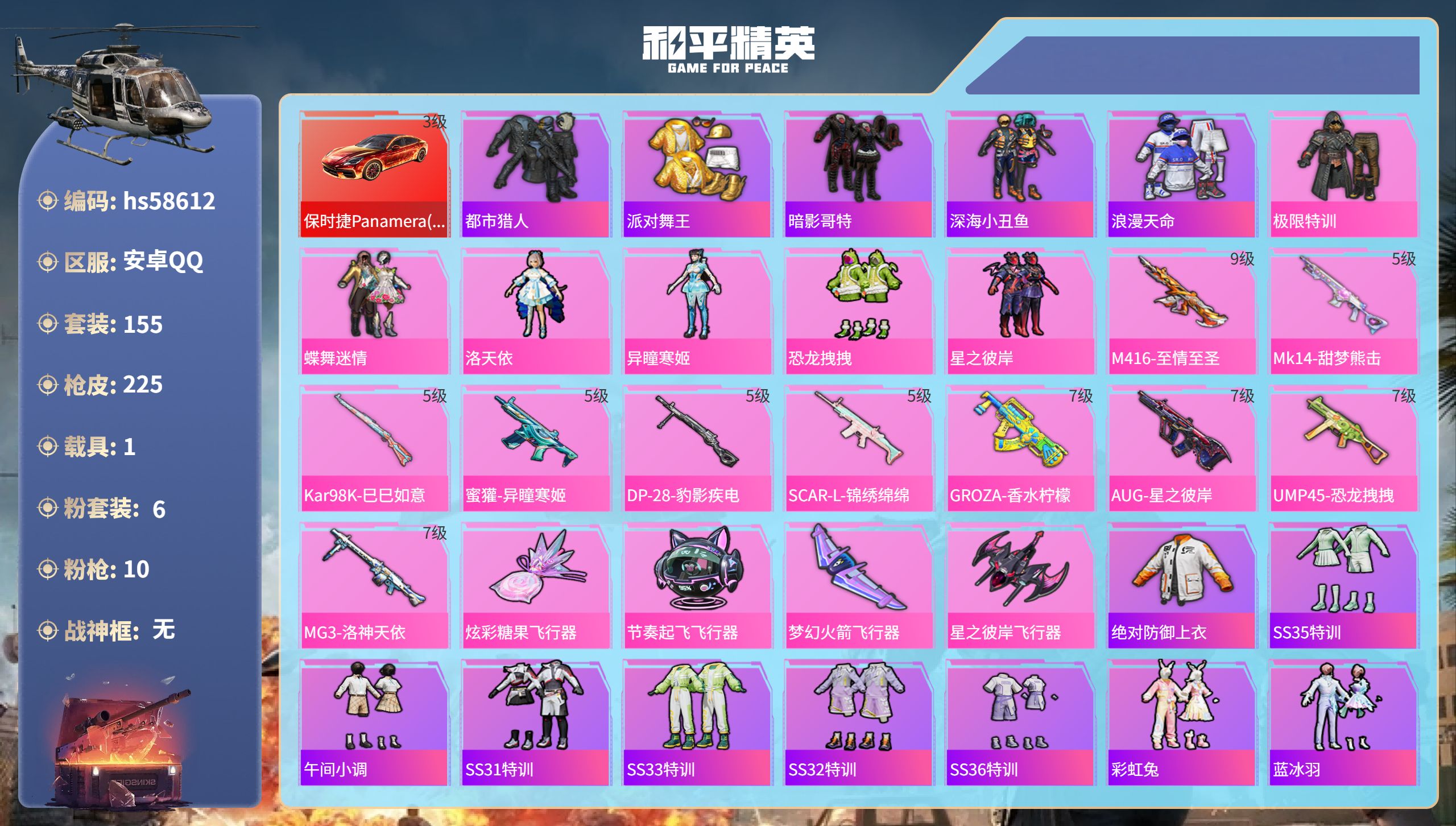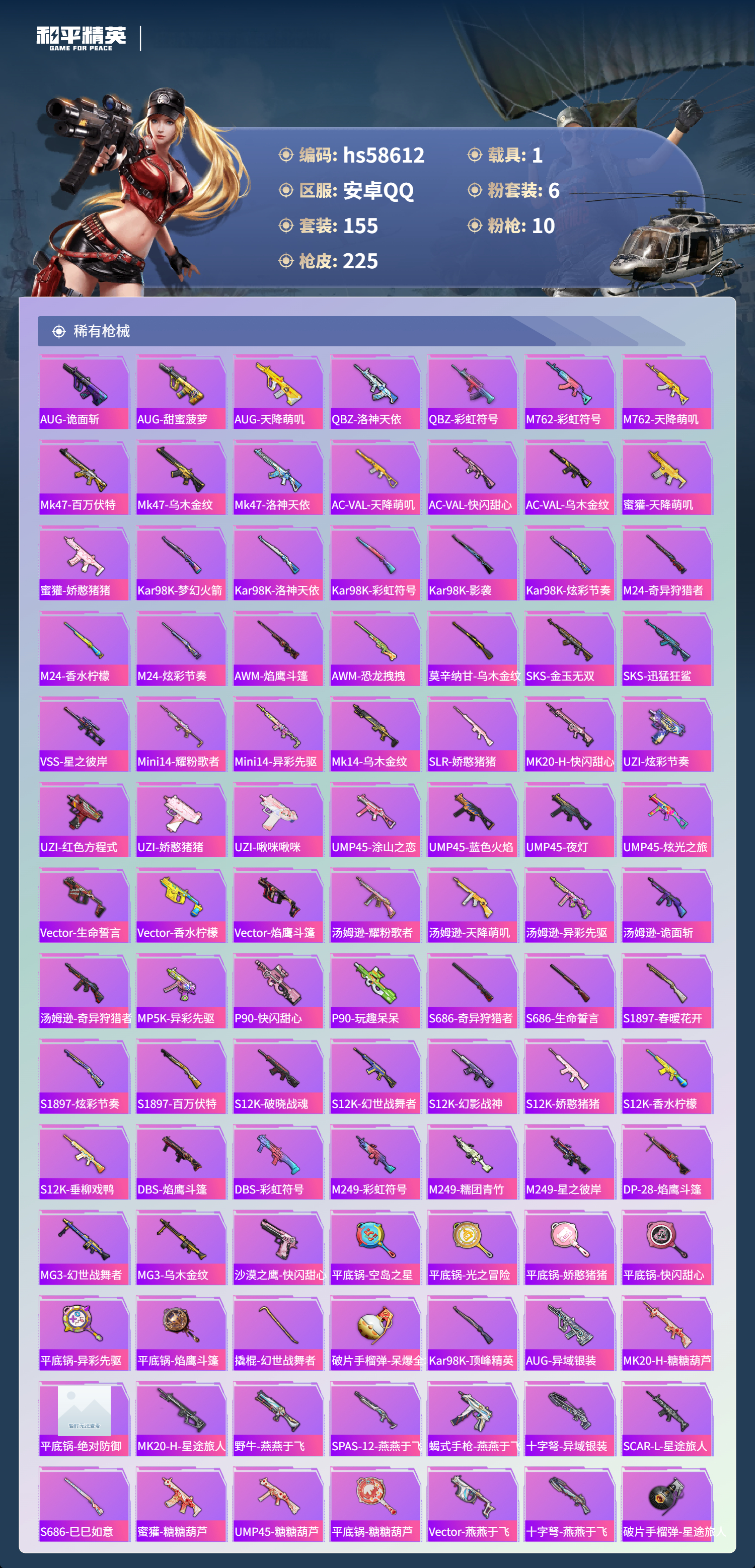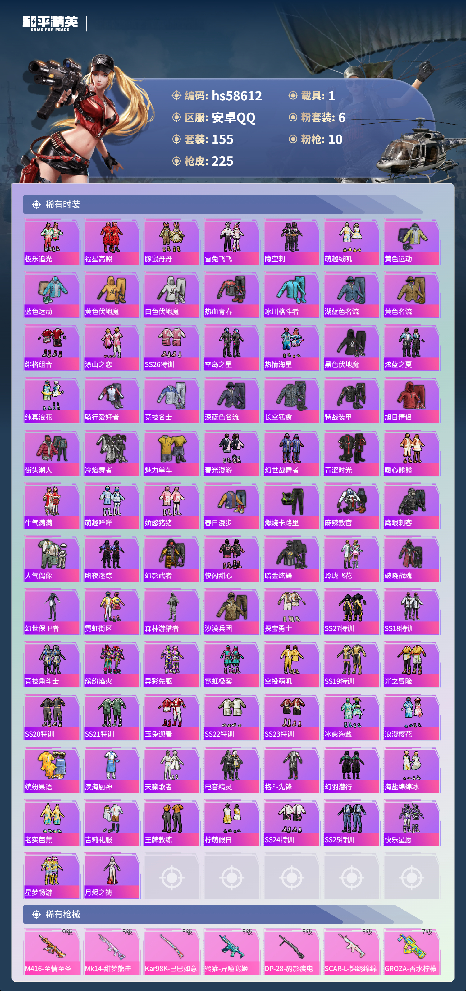 【364897】【可二次】【安卓QQ】恐龙拽拽 S686-奇异狩猎者 都市猎人 M24-奇异狩猎者 MG3-洛神天依 洛天依 星之彼岸飞行器 极限特训 UMP45-恐龙拽拽 豚鼠丹丹 SCAR-L-锦绣绵绵 巡查衣 M416-至情至圣 星之彼岸 深海小丑鱼 M24-香水柠檬 派对舞王 蝶舞迷情 GROZA-香水柠檬 AUG-星之彼岸 浪漫天命 梦幻火箭飞行器 暗影哥特
