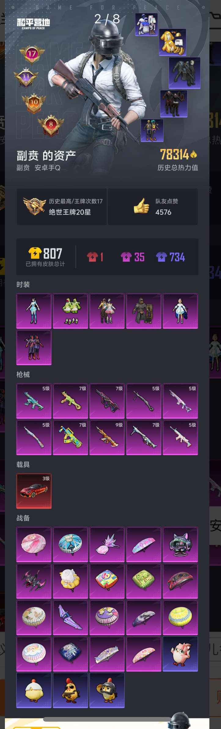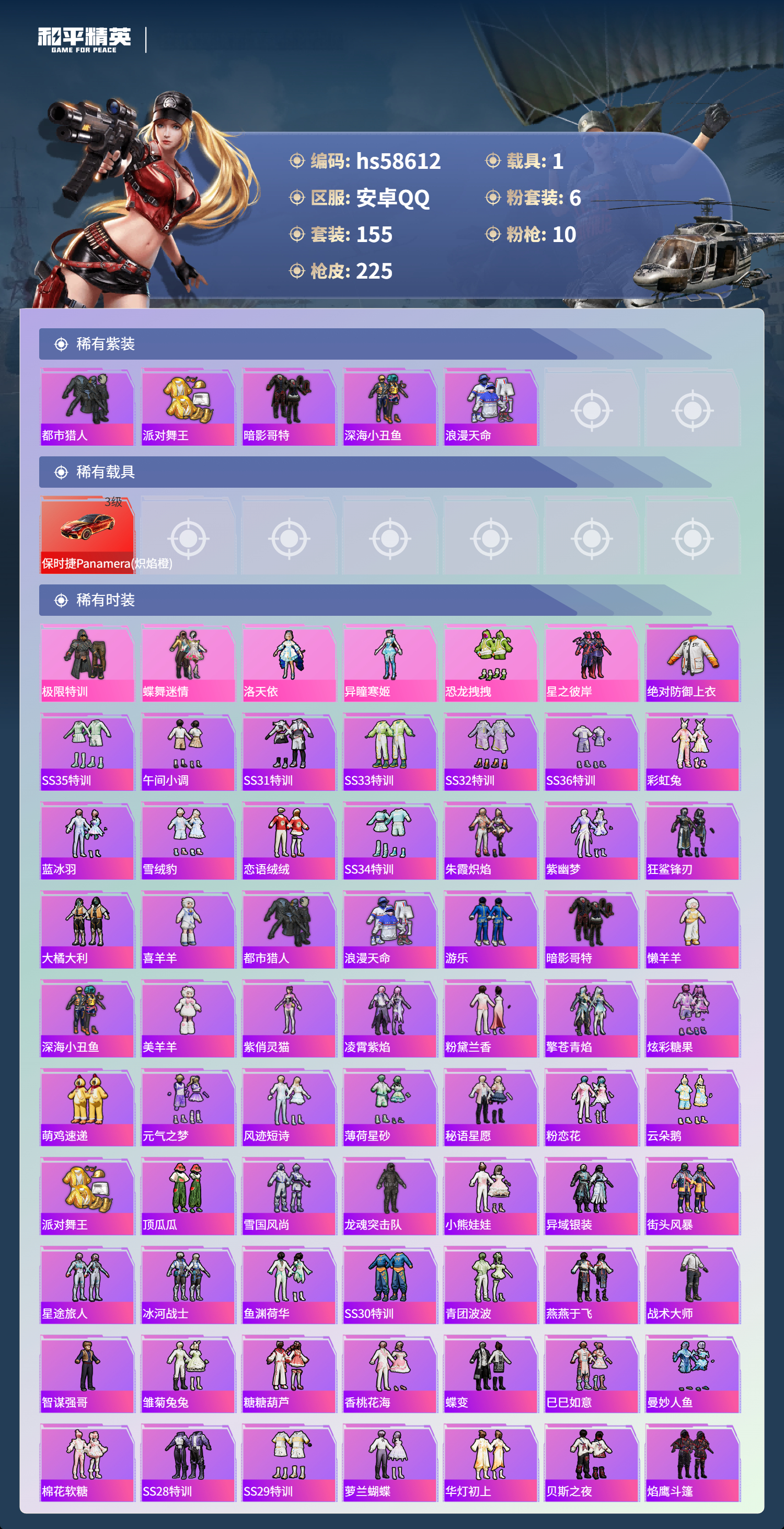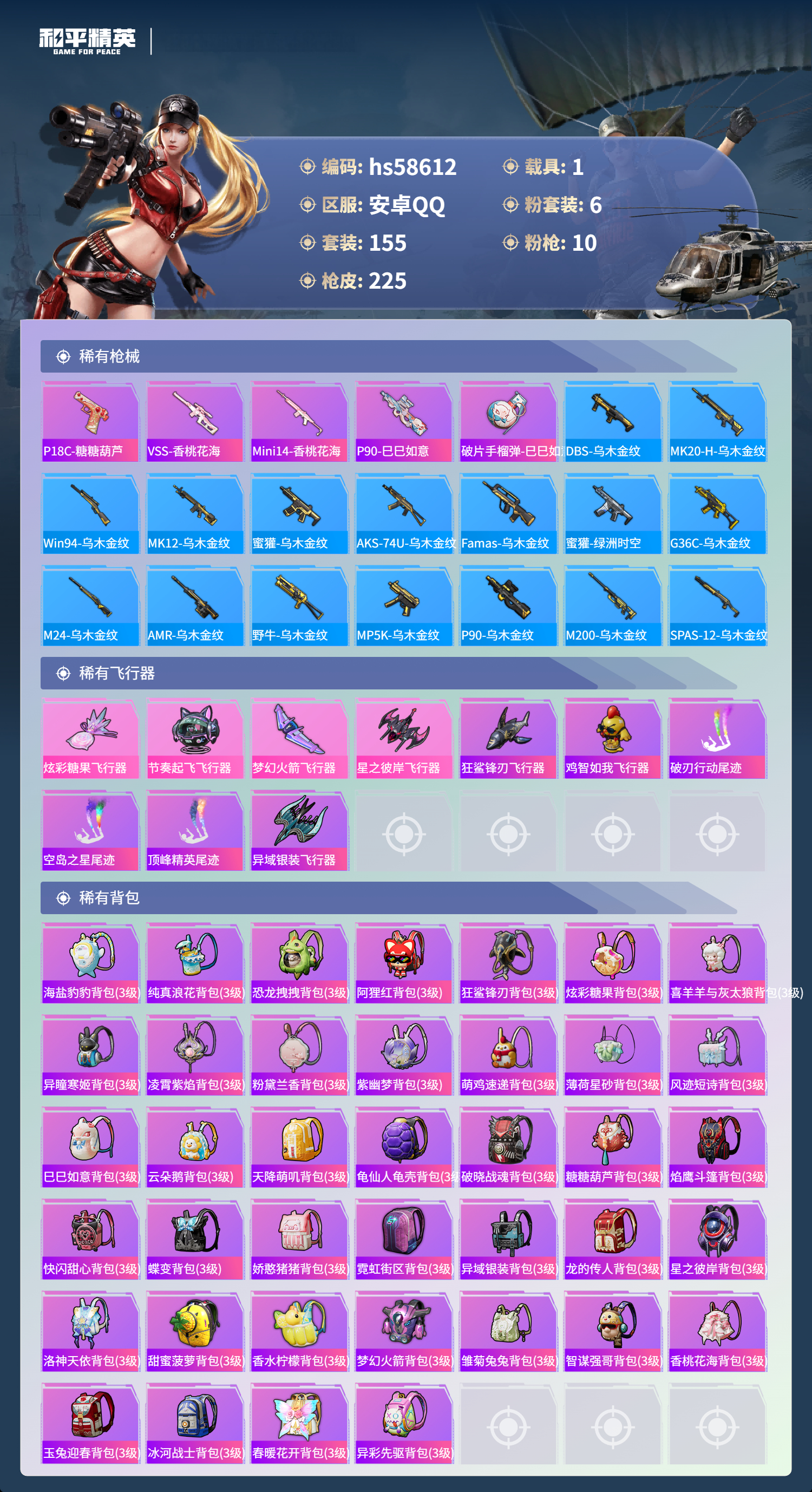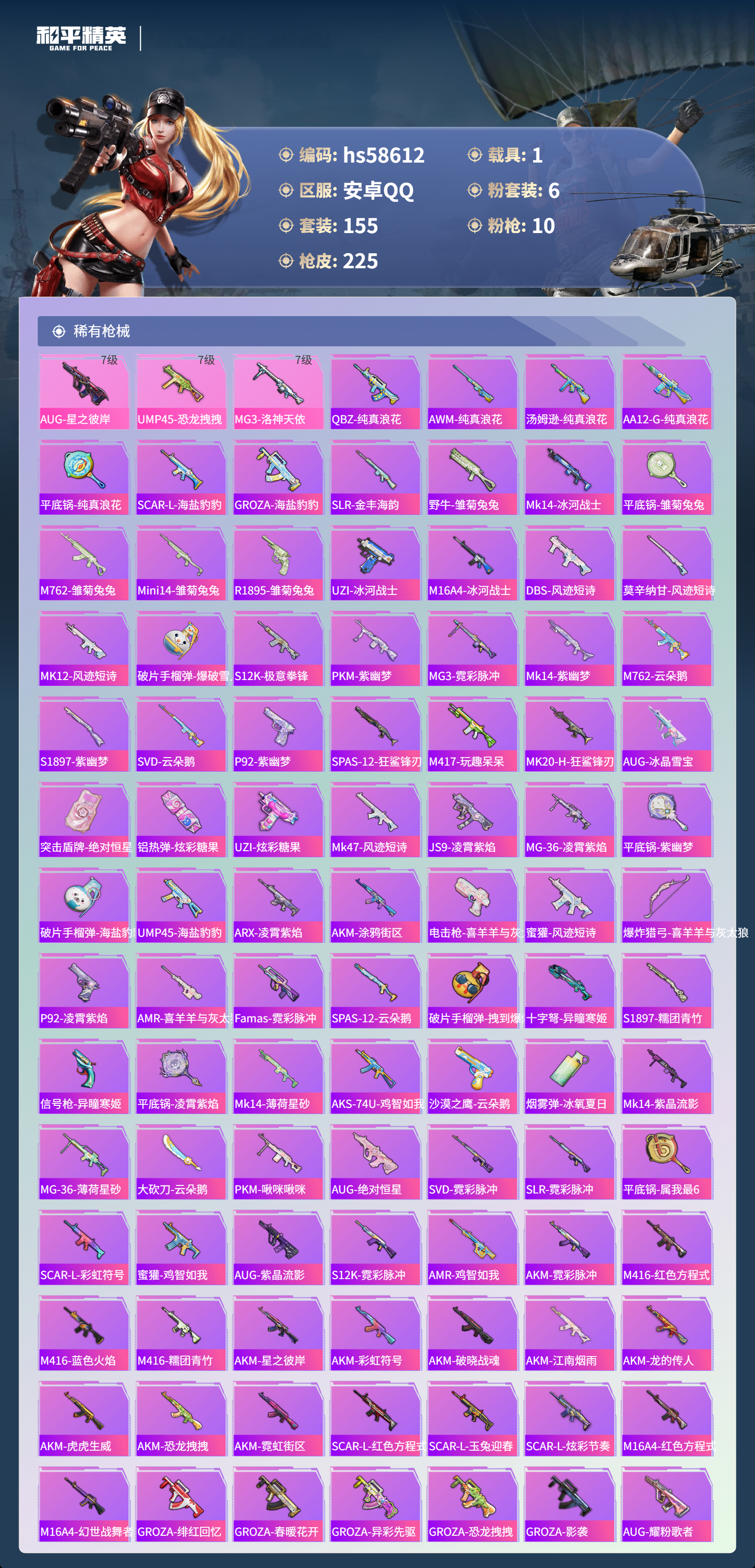 【364897】【可二次】【安卓QQ】恐龙拽拽 S686-奇异狩猎者 都市猎人 M24-奇异狩猎者 MG3-洛神天依 洛天依 星之彼岸飞行器 极限特训 UMP45-恐龙拽拽 豚鼠丹丹 SCAR-L-锦绣绵绵 巡查衣 M416-至情至圣 星之彼岸 深海小丑鱼 M24-香水柠檬 派对舞王 蝶舞迷情 GROZA-香水柠檬 AUG-星之彼岸 浪漫天命 梦幻火箭飞行器 暗影哥特