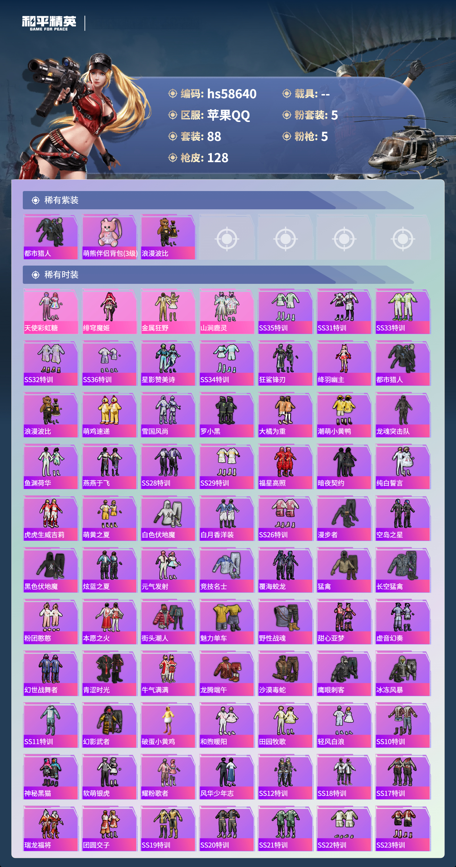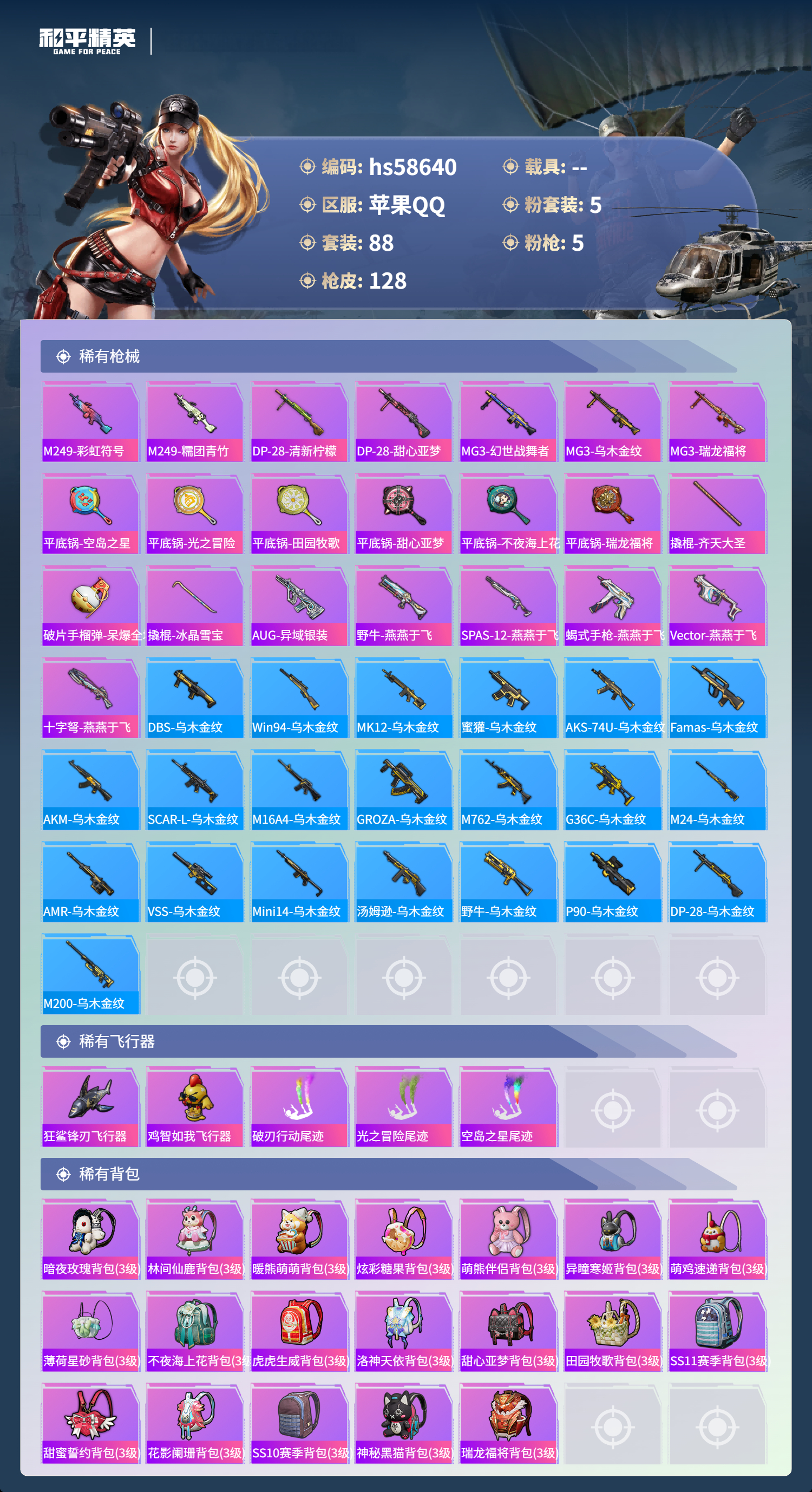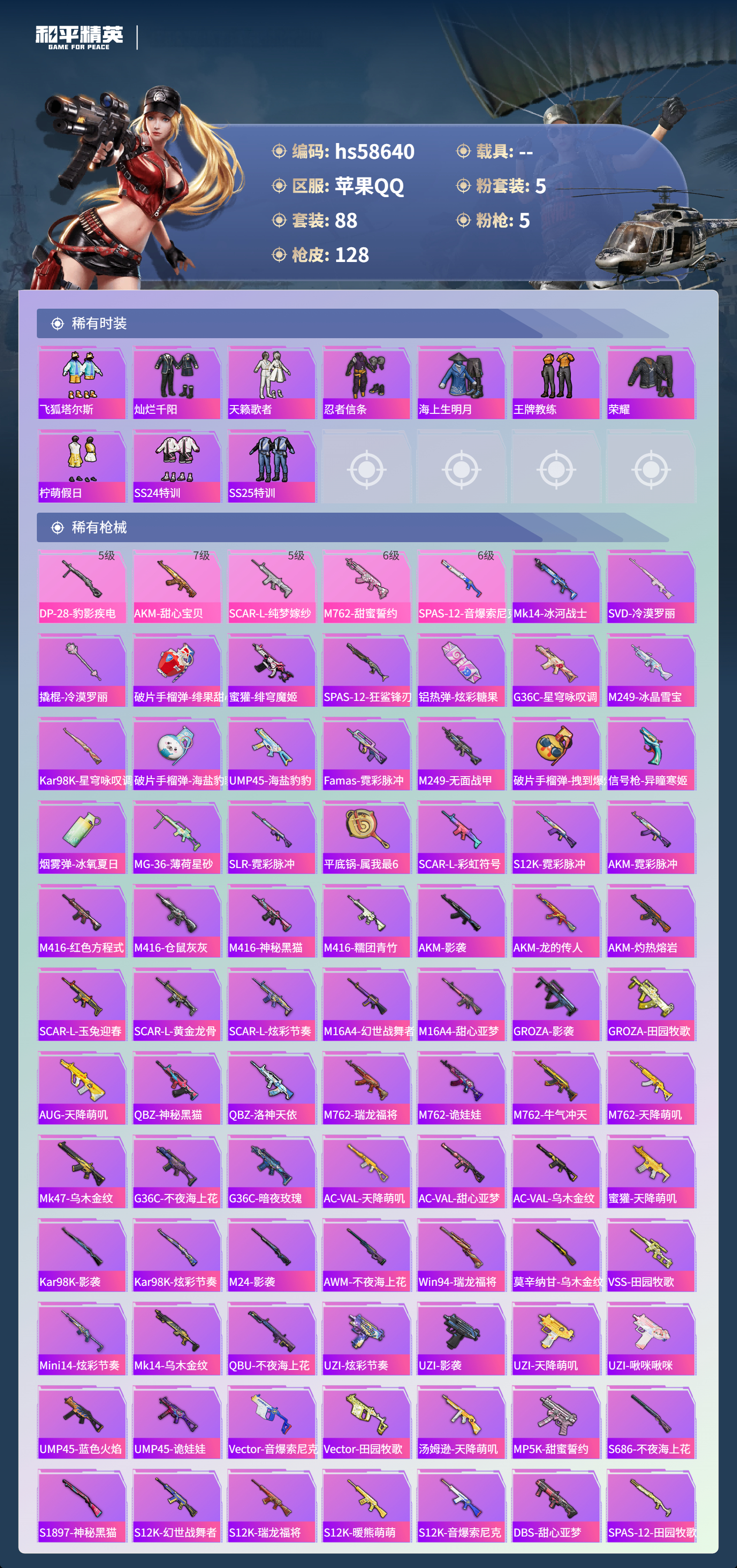 【364945】【不可二次】【苹果QQ】M762-甜蜜誓约 大橘为重 漫步者 都市猎人 SPAS-12-音爆索尼克 金属狂野 忍者信条 罗小黑 M416-仓鼠灰灰 浪漫波比 山涧鹿灵 瑞龙福将 激萌小黄鸭 AKM-甜心宝贝 纯白誓言 团圆交子 软萌银虎 暗夜契约 M762-瑞龙福将 潮萌小黄鸭 M762甜蜜誓言 白月香洋装 天使彩虹糖 SCAR-L-纯梦嫁纱 风华少年志 神秘黑猫