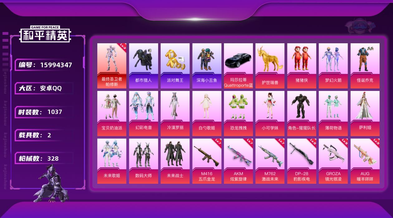 【366035】【不可二次】【安卓QQ】龟仙人 恐龙拽拽 M416-五爪金龙 漫步者 都市猎人 东方飞龙 极速红龙 深海小丑鱼 瑞龙福将 浪漫天命 猪猪侠 团圆交子 怪诞乔克 M762-激战未来 迅捷狂鲨 M762-瑞龙福将 千面幻镜飞行器 M417射手步枪 狂沙舞者 黄族统领飞行器 金羽特工 AKM-炫紫旋律 梦幻火箭 AKM-缤纷海域 AKM-百万伏特 数码大师 宝贝奶油派 M249-猪猪侠