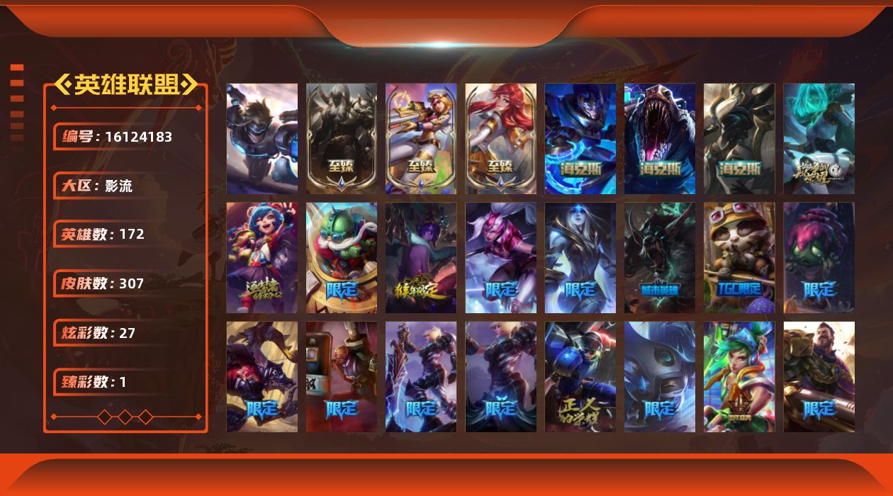 【383428】[16124183]【特价出售/店主推荐】铂金段位-172英雄-307皮肤-27炫彩-1终极-8神话-38限定-36传说-90史诗【热门头像】:勇者阿狸头像【至臻皮肤】:至臻电玩女神凯特琳,至臻战斗学院拉克丝,至臻腥红之月亚托克斯【臻彩皮肤】:战斗学院卡特琳娜盛典礼服【年限皮肤】:碧玉之牙卡西奥佩娅,紫金罗刹莫甘娜【海克斯皮肤】:海克斯科技雷克顿,海克斯科技嘉文四世,零之枪骑赫卡