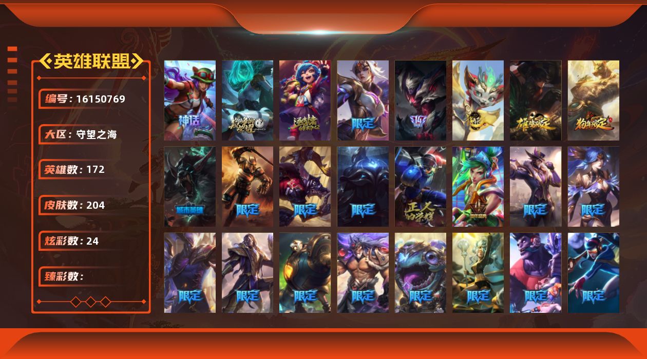 【387671】[16150769]3神话 26限定 16传说 51史诗 204皮肤 24炫彩 172英雄 可二次 可修改实名 【赛季限定皮】:胜利女神-菲奥娜,胜利之运 崔斯特,胜利女神 娑娜,胜利巨口 克格莫,胜利之王 泰达米尔,胜利之剑 亚托克斯,胜利枪神 卢锡安,胜利机器人 布里茨【冠军限定系列】:S1FNC 迦娜,S2 暗杀星 蒙多,S5 SKT T1 滑板鞋【冰雪节限定】:胡桃夹子