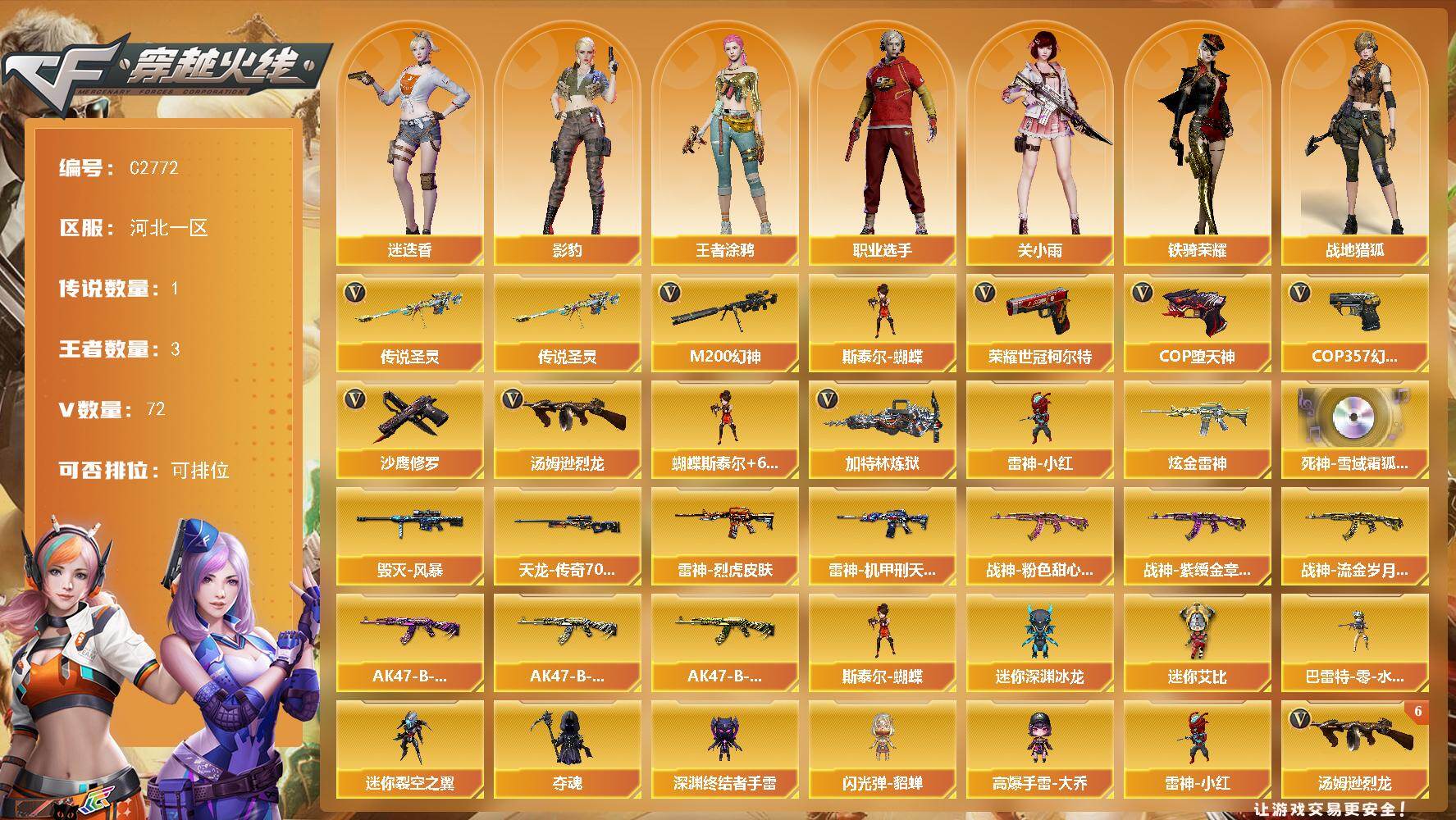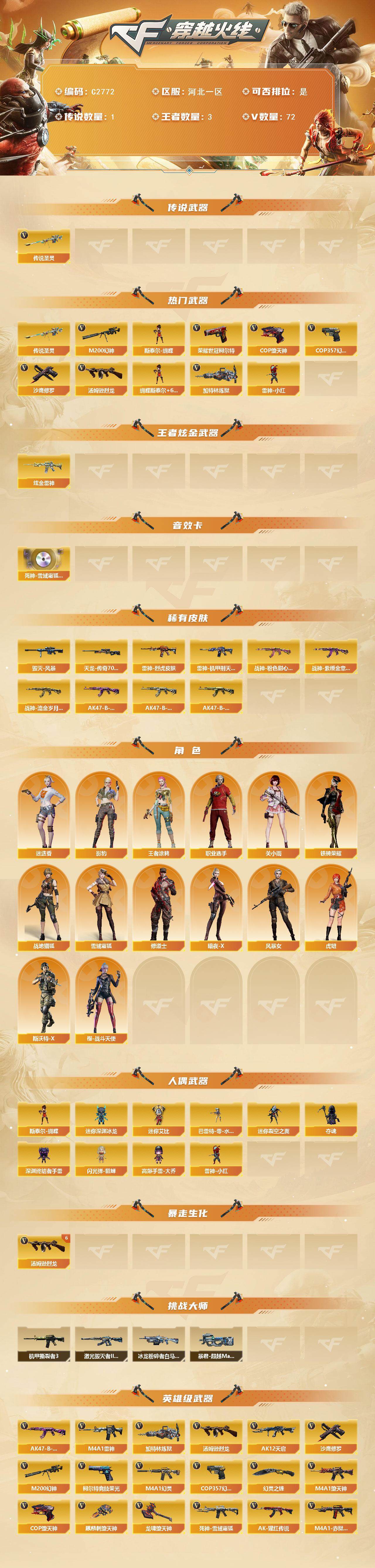 【394742】【394742】[16199602]河北一区-72V-3王者-1炫金【传说武器】:传说圣灵【热门武器】:传说圣灵,M200-幻神,荣耀世冠-柯