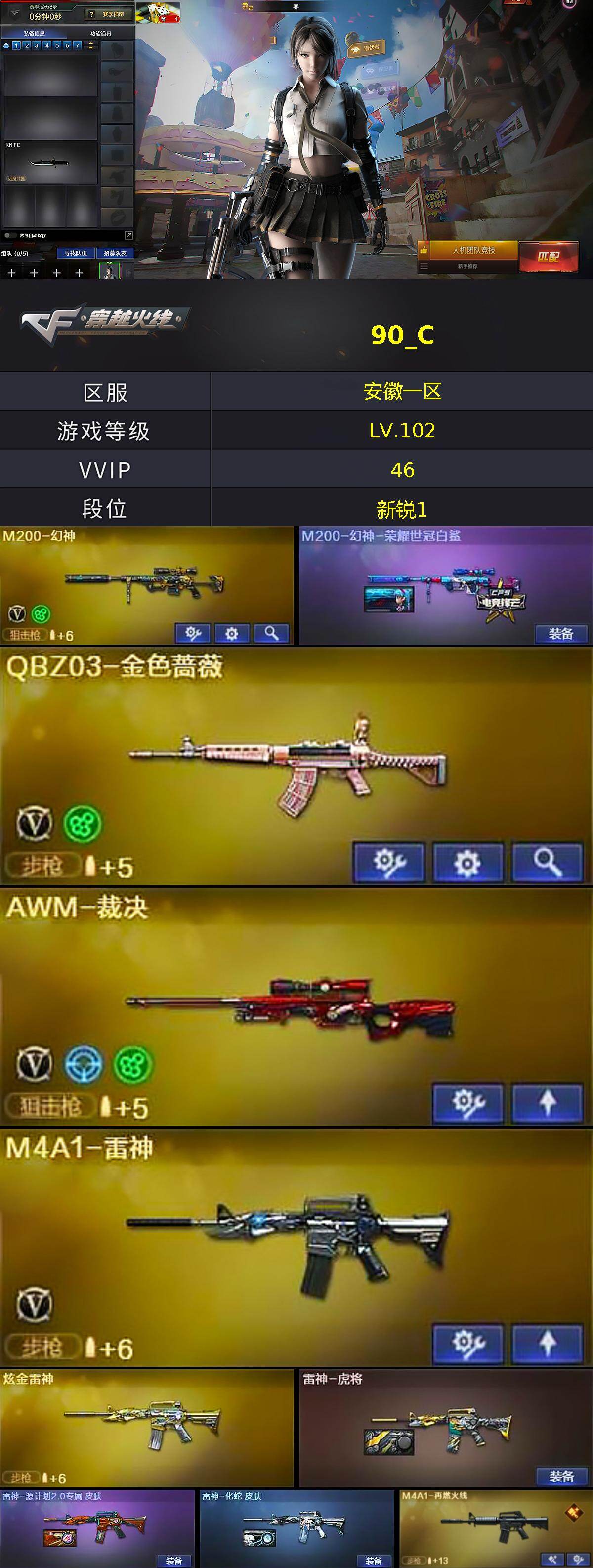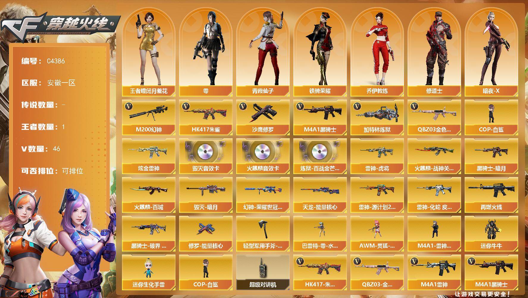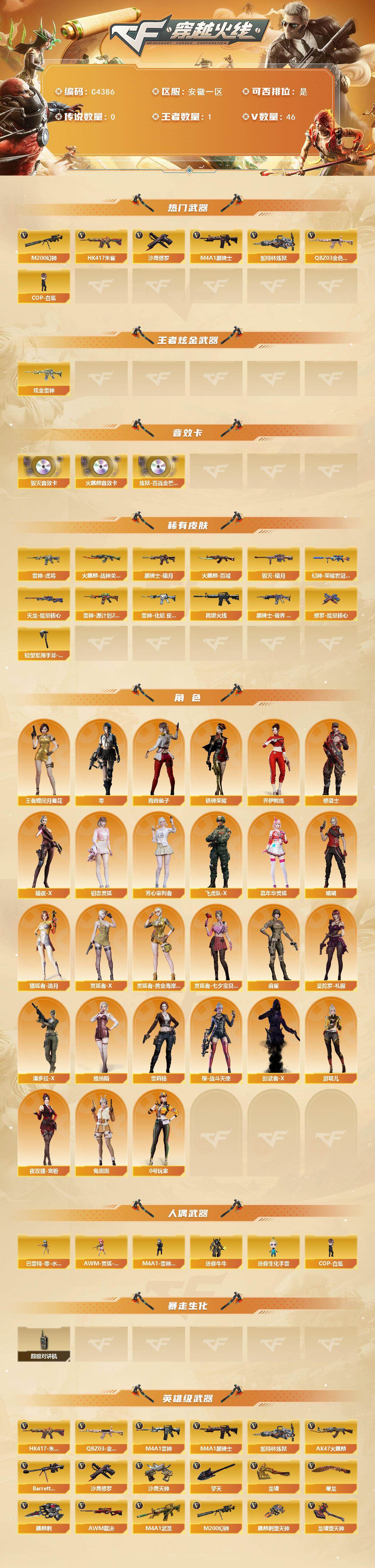 【394821】【394821】【C4386】安徽一区-46V-1王者-1炫金【热门武器】:QBZ03-金色蔷薇,HK417-朱雀,M200-幻神,M4A1-