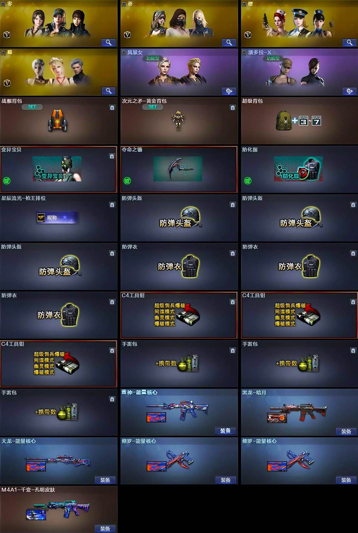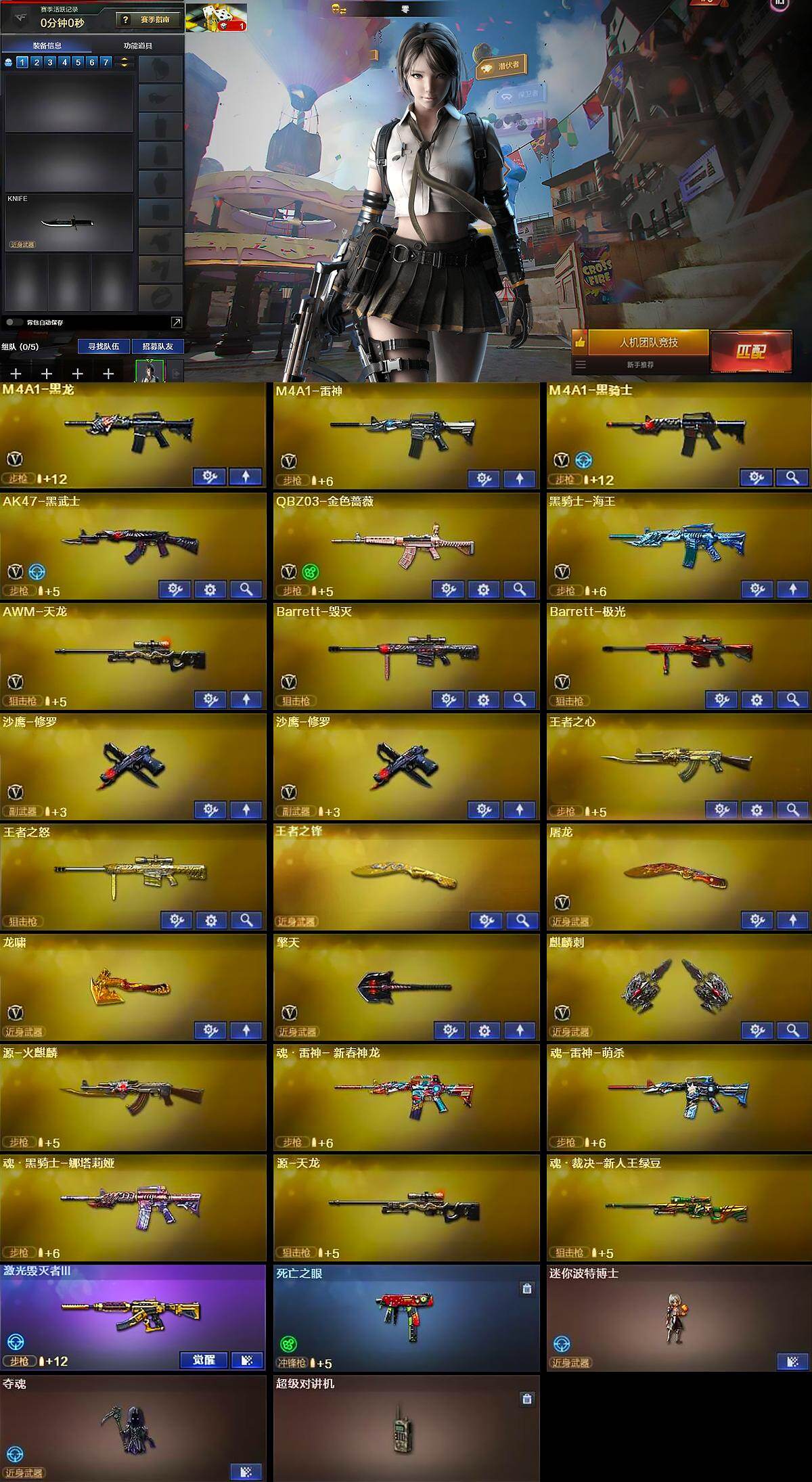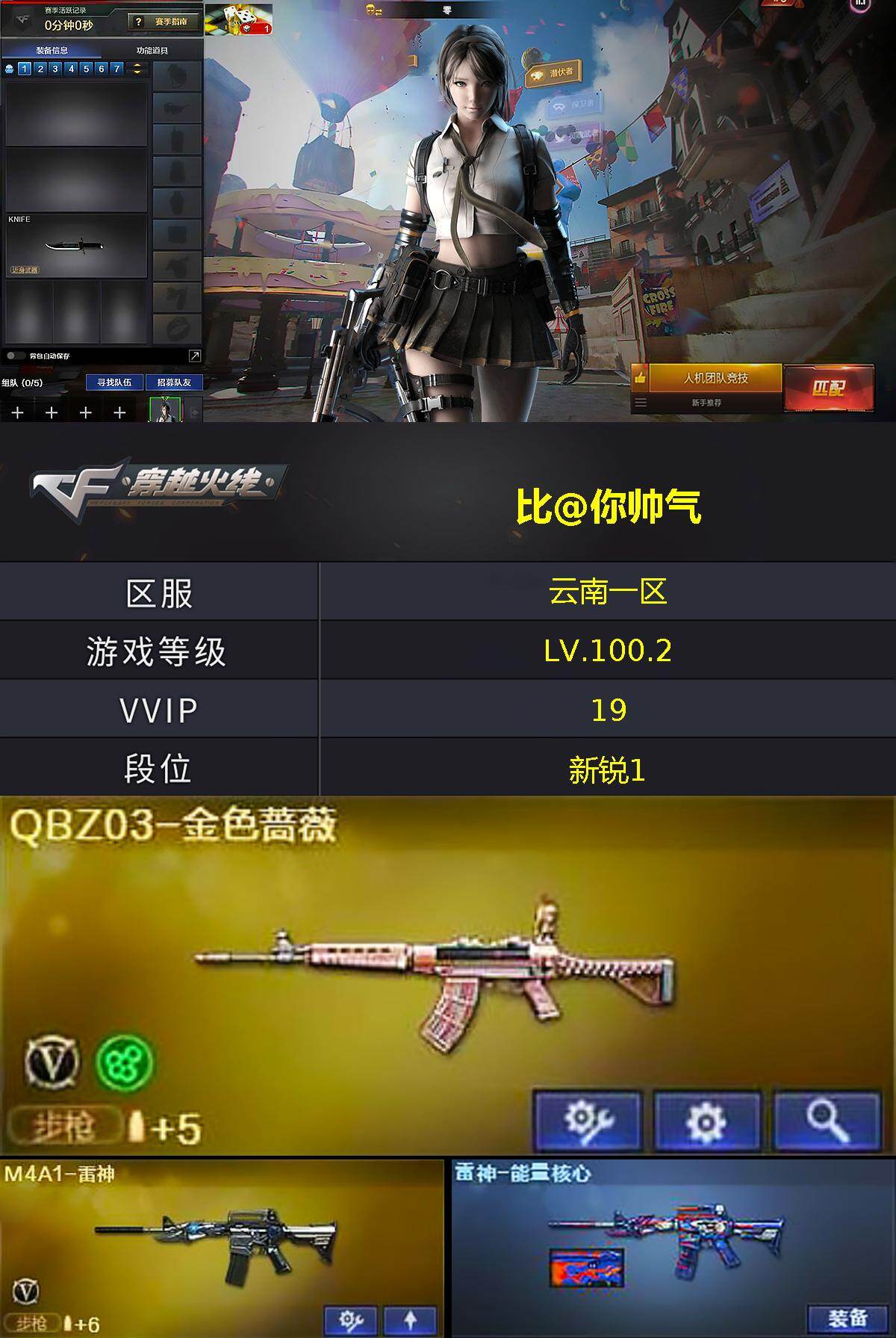 【395043】云南一区-19V-3王者-0炫金【热门武器】:QBZ03-金色蔷薇,死亡之眼,M4A1-黑骑士,沙鹰-修罗*2【王者炫金武器】:王者之心,王者之怒,王者之锋【皮肤】:雷神-能量核心,M4A1-千变-孔明皮肤,黑龙-暗月,天龙-能量核心,修罗-能量核心*2【角色】:零,葵,樱,瞳,风暴女,潘多拉-X【人偶武器】:迷你波特博士,夺魂【暴走生化】:死亡之眼,超级对讲机【挑战大师】:激光