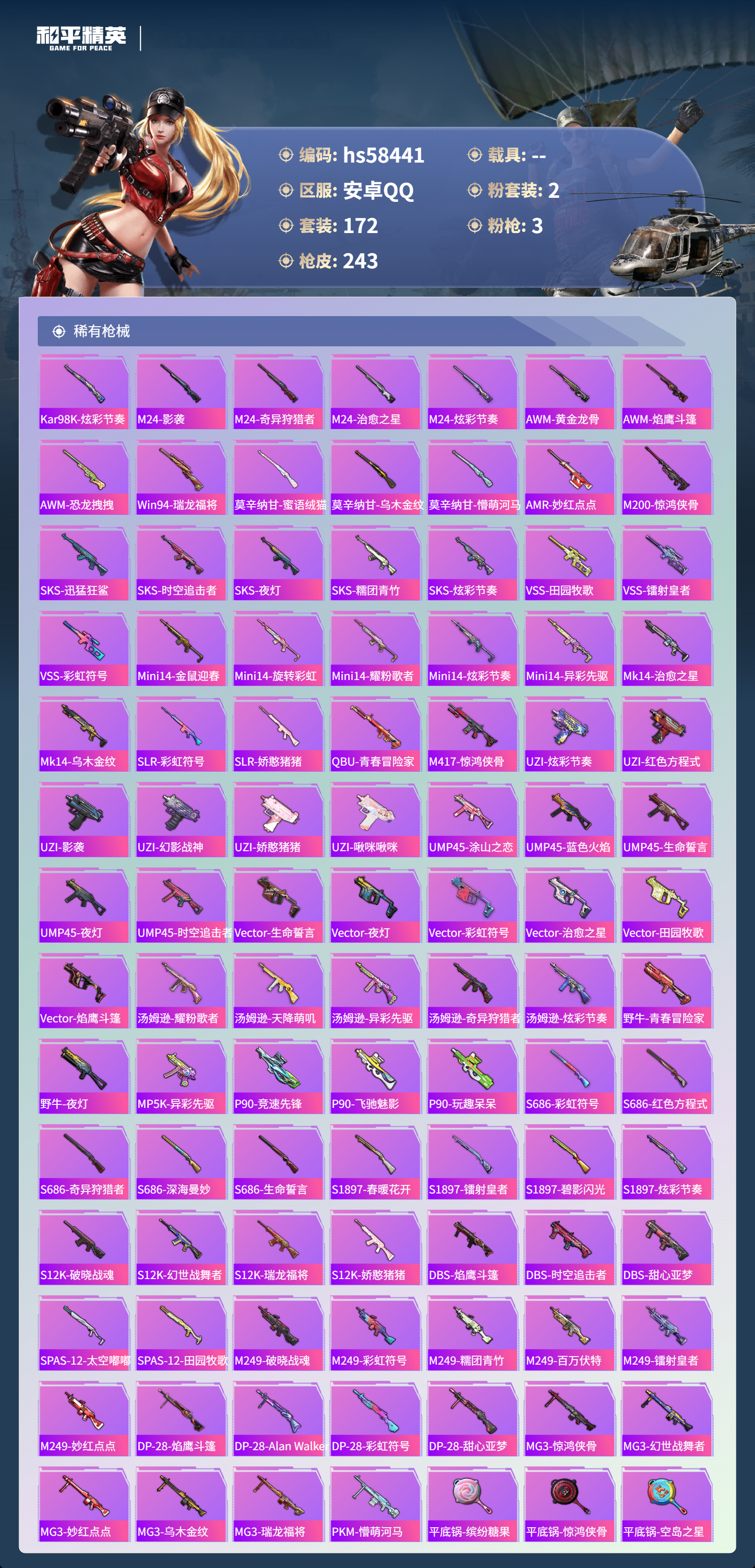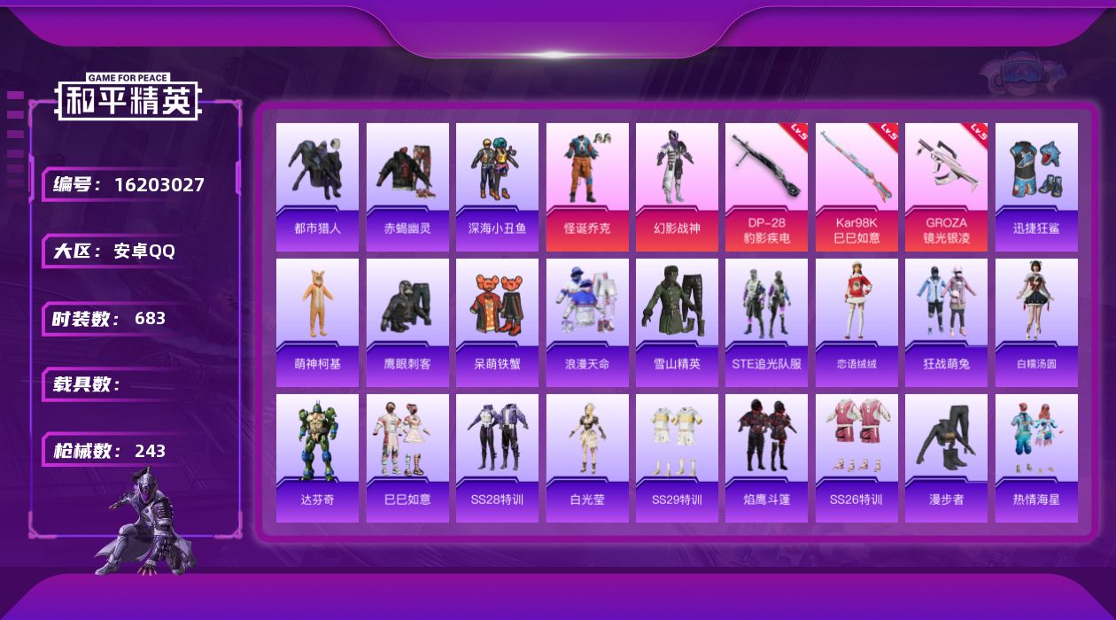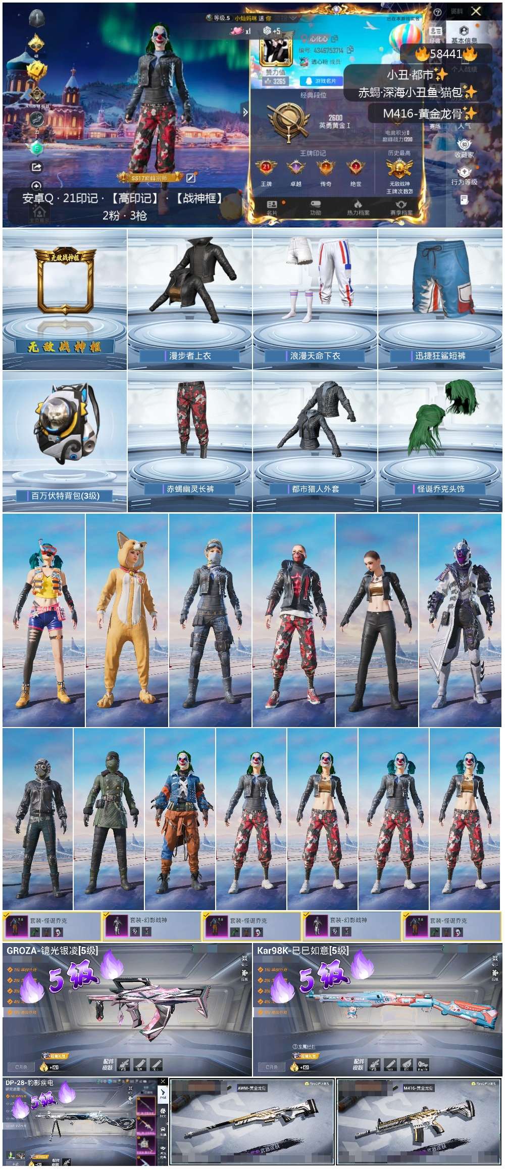【395176】【不可二次】【安卓QQ】龟仙人 水银刺客 S686-奇异狩猎者 漫步者 怪诞乔克 都市猎人 迅捷狂鲨 萌神柯基 M24-奇异狩猎者 M762-瑞龙福将 千面幻镜飞行器 极速红龙 赤蝎幽灵 M762-奇异狩猎者 深海小丑鱼 幻影战神 瑞龙福将 M416-黄金龙骨 浪漫天命 雪山精英 AWM-黄金龙骨 裁决冥王 团圆交子 AKM-奇异狩猎者