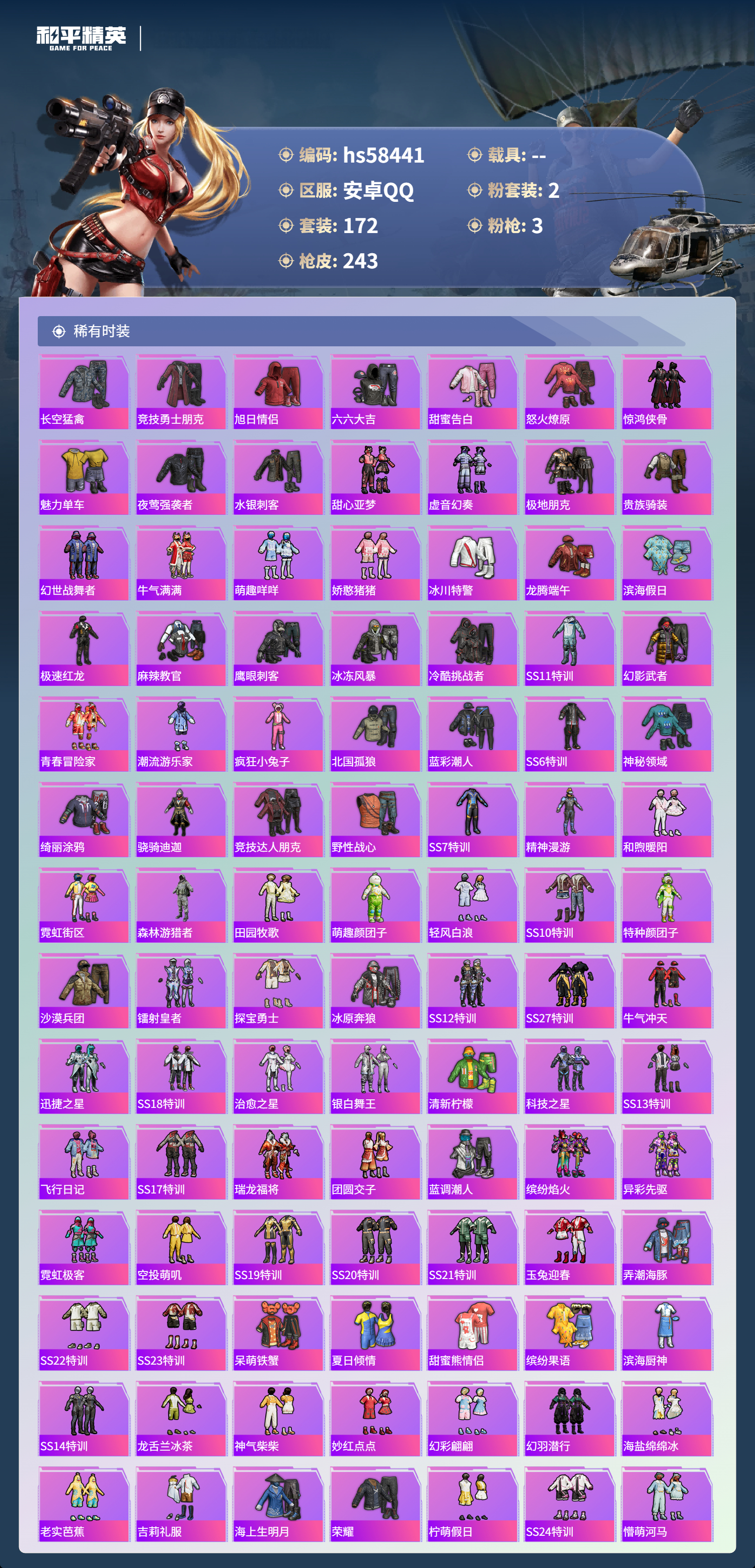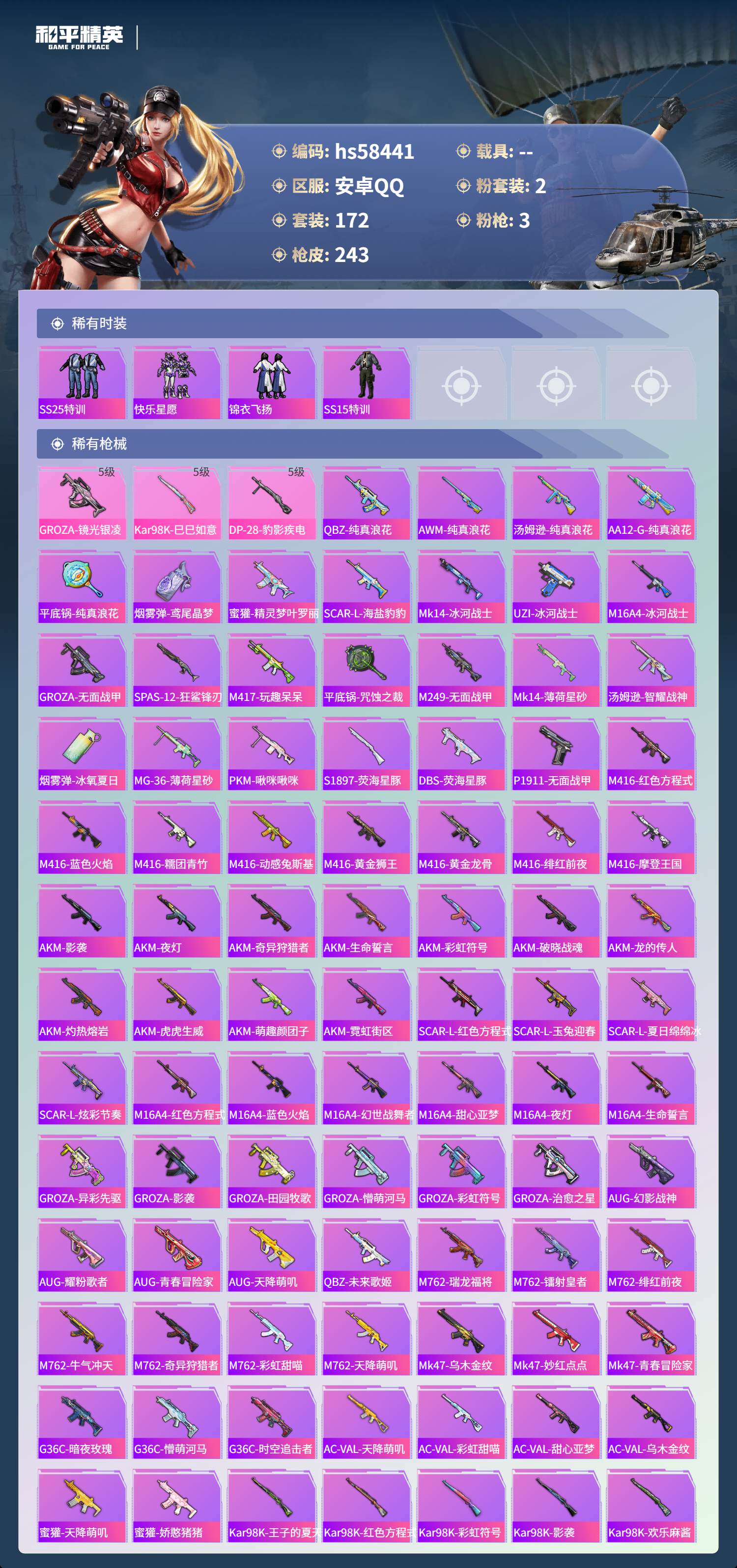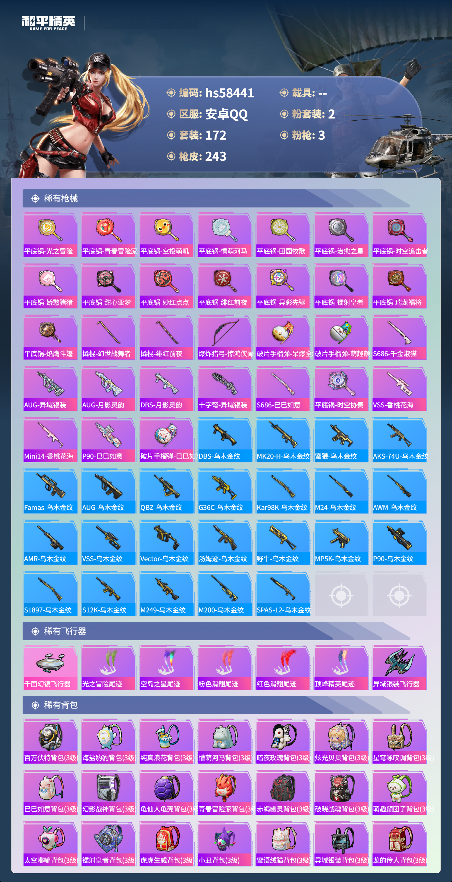 【395176】【不可二次】【安卓QQ】龟仙人 水银刺客 S686-奇异狩猎者 漫步者 怪诞乔克 都市猎人 迅捷狂鲨 萌神柯基 M24-奇异狩猎者 M762-瑞龙福将 千面幻镜飞行器 极速红龙 赤蝎幽灵 M762-奇异狩猎者 深海小丑鱼 幻影战神 瑞龙福将 M416-黄金龙骨 浪漫天命 雪山精英 AWM-黄金龙骨 裁决冥王 团圆交子 AKM-奇异狩猎者