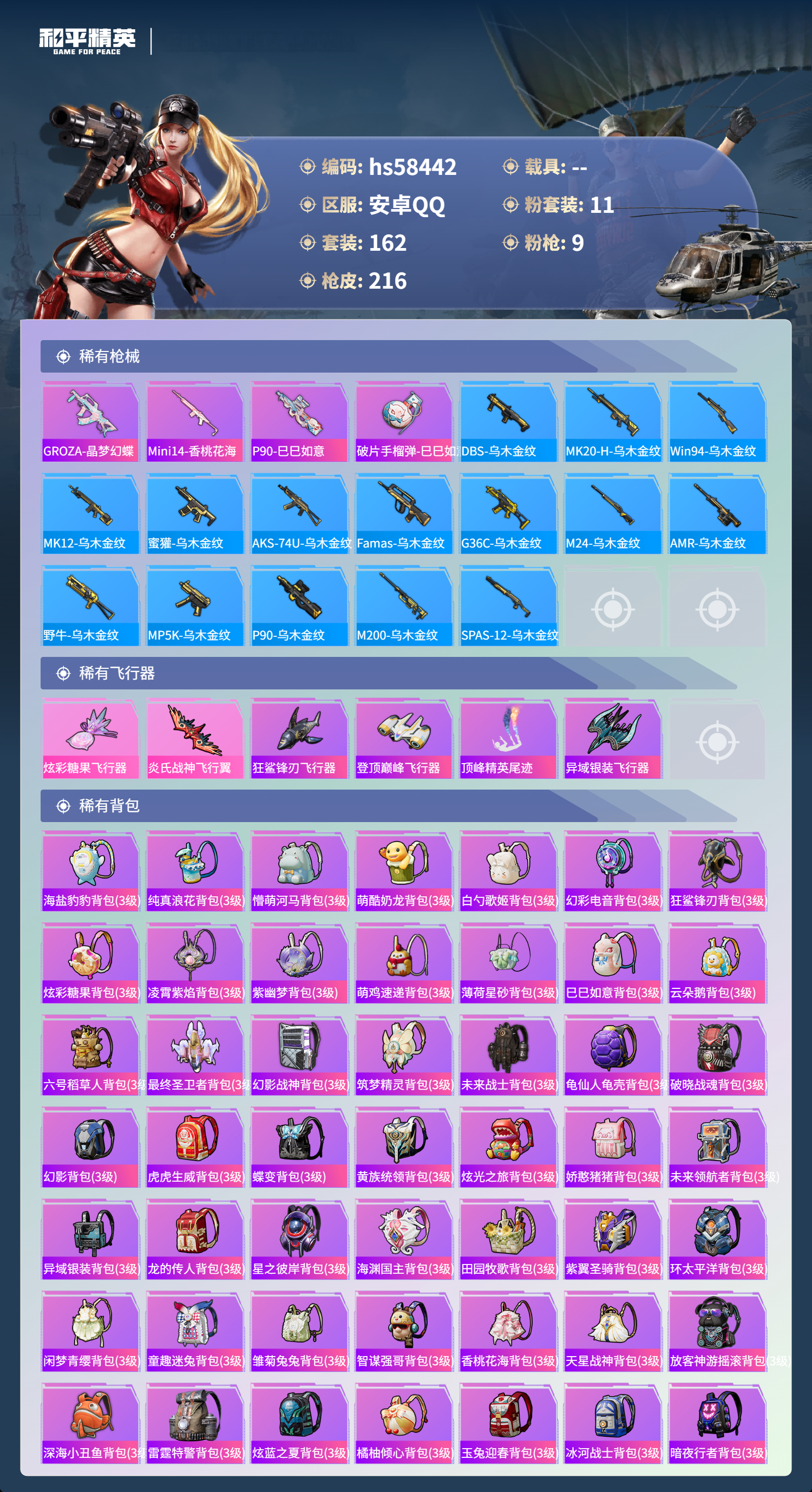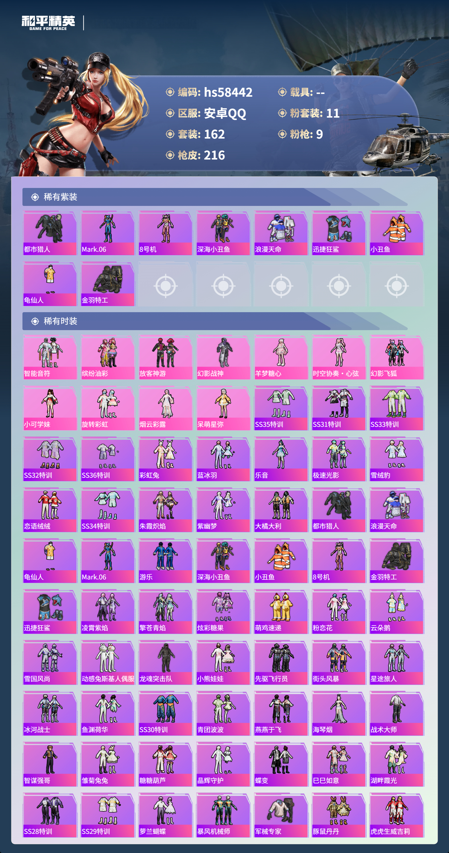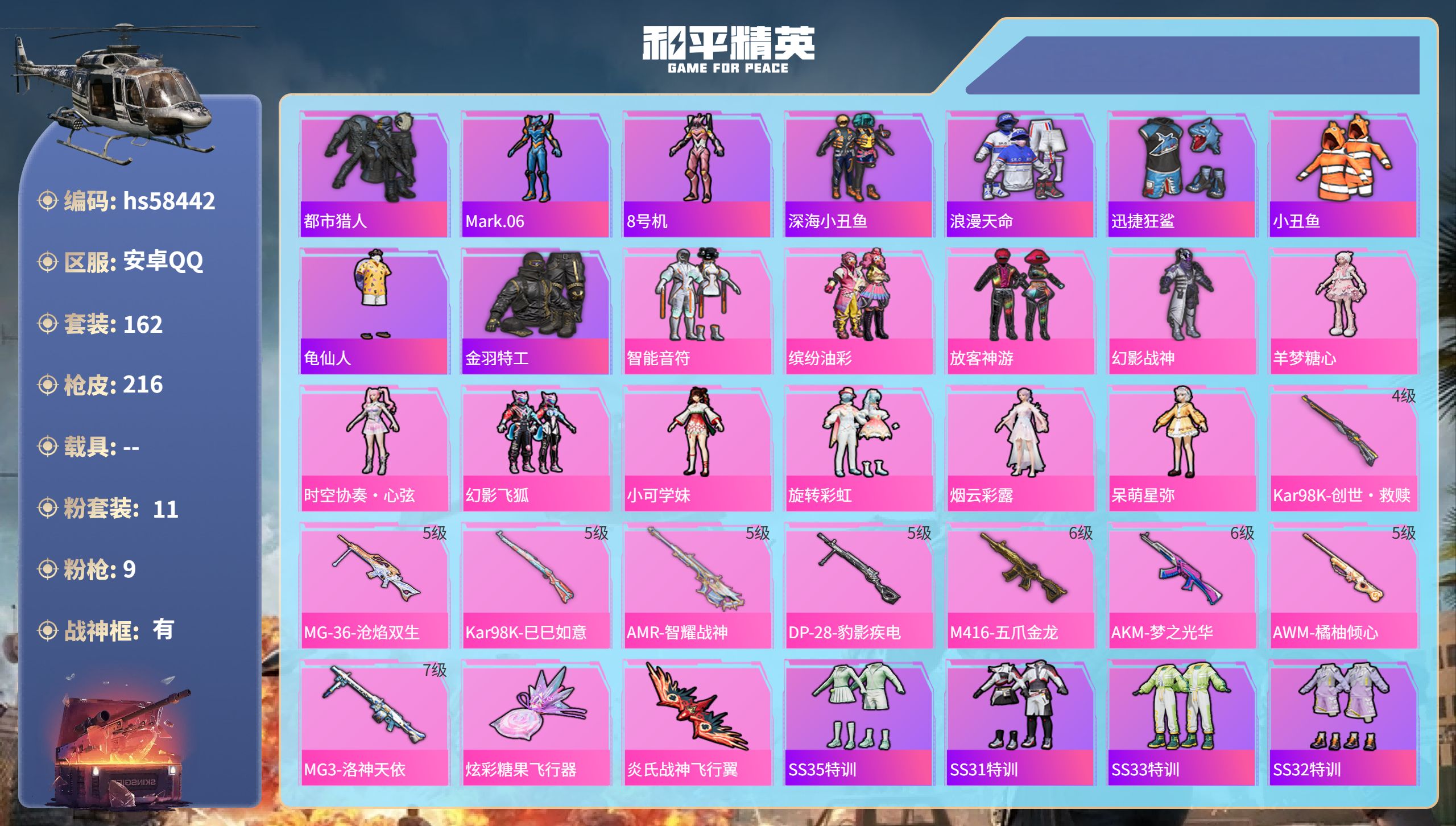 【395185】【不可二次】【安卓QQ】龟仙人 水银刺客 M416-五爪金龙 都市猎人 M24-奇异狩猎者 AWM-橘柚倾心 豚鼠丹丹 炎氏战神飞行翼 忍者信条 放客神游 缤纷油彩 深海小丑鱼 瑞龙福将 智能音符 浪漫天命 团圆交子 迅捷狂鲨 M762-瑞龙福将 MG3-洛神天依 金羽特工 暗夜之虎 AKM-梦之光华 AKM-缤纷海域 粉红小猪 幻影战神 时空协奏·心弦