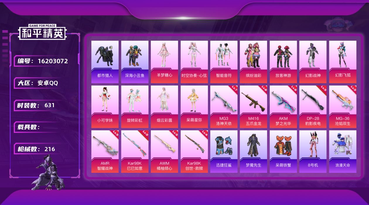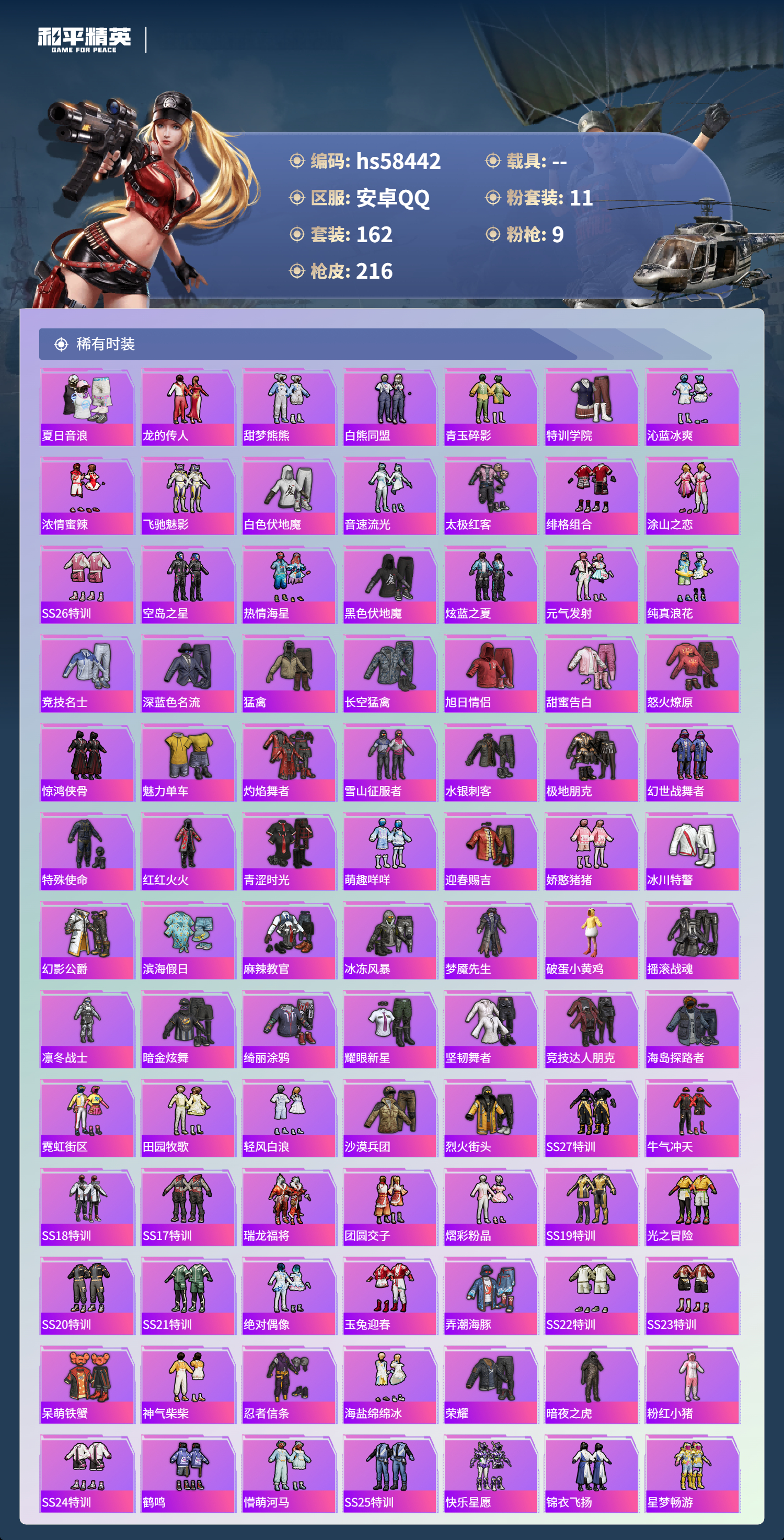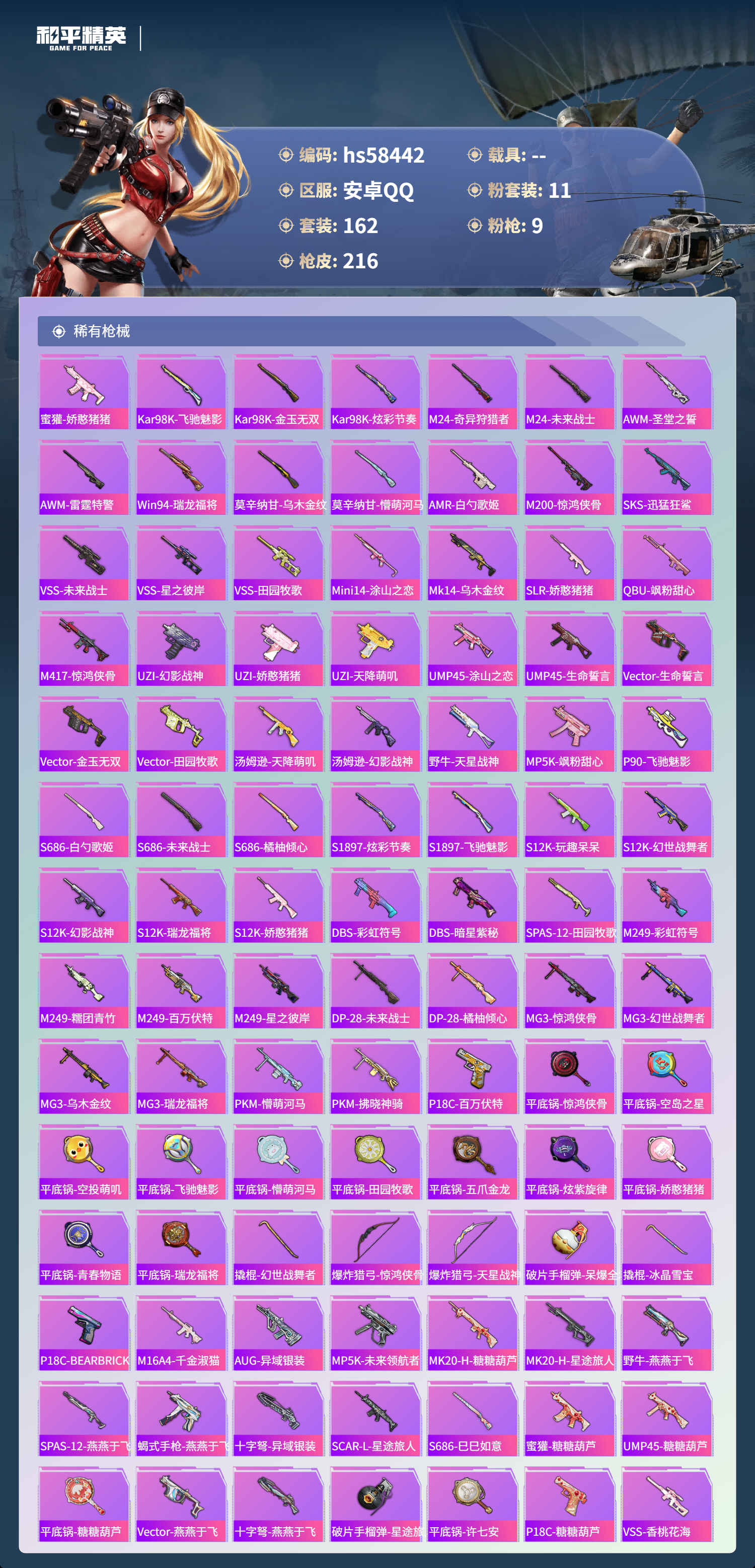 【395185】【不可二次】【安卓QQ】龟仙人 水银刺客 M416-五爪金龙 都市猎人 M24-奇异狩猎者 AWM-橘柚倾心 豚鼠丹丹 炎氏战神飞行翼 忍者信条 放客神游 缤纷油彩 深海小丑鱼 瑞龙福将 智能音符 浪漫天命 团圆交子 迅捷狂鲨 M762-瑞龙福将 MG3-洛神天依 金羽特工 暗夜之虎 AKM-梦之光华 AKM-缤纷海域 粉红小猪 幻影战神 时空协奏·心弦