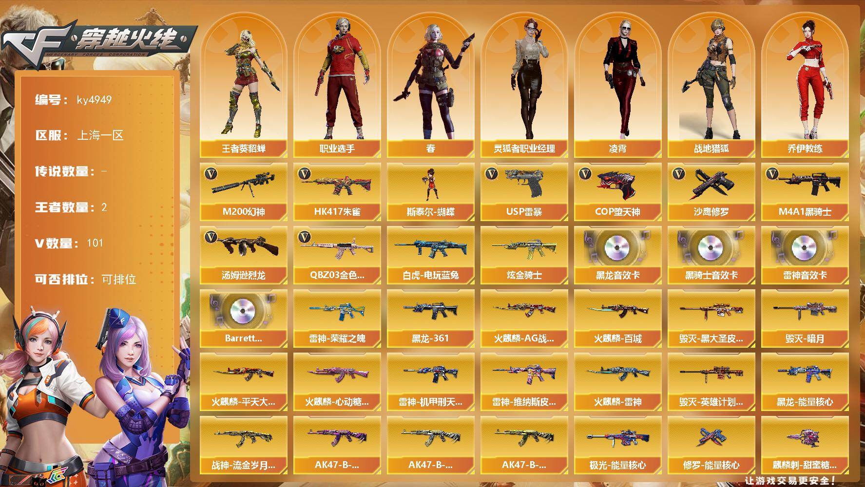 【395531】【395531】上海一区-101V-2王者-1炫金【热门武器】:QBZ03-金色蔷薇,HK417-朱雀,M200-幻神,白虎-电玩蓝兔,M4A