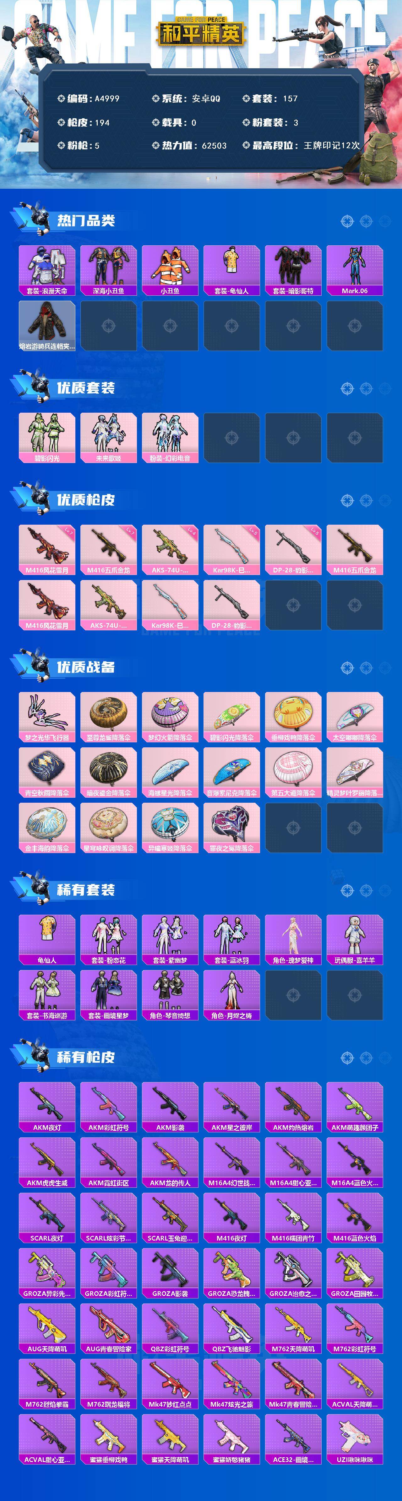 【395586】【可二次】【安卓QQ】龟仙人 梦幻火箭降落伞 M416-五爪金龙 漫步者 韶华初心 梦之光华飞行器 青空秋雨降落伞 暗夜鎏金降落伞 碧影闪光降落伞 太空嘟嘟降落伞 第五大道降落伞 浪漫假日 深海小丑鱼 碧影闪光 M24-香水柠檬 瑞龙福将 浪漫天命 团圆交子 垂柳戏鸭降落伞 M762-瑞龙福将 海螺星光降落伞 狂沙舞者 摩登艾咪 至尊龙雀降落伞 音爆索尼克降落伞 M416-风花雪