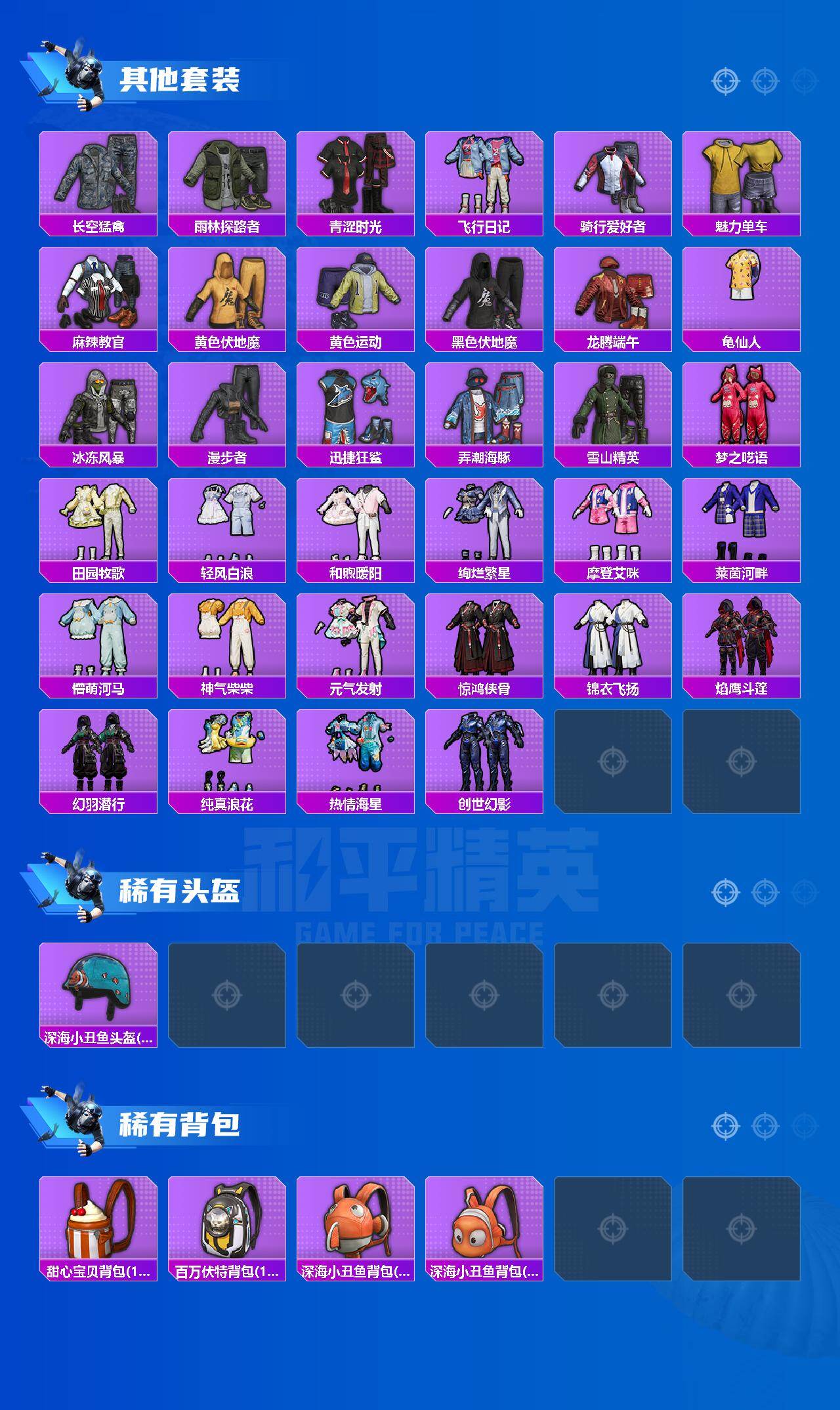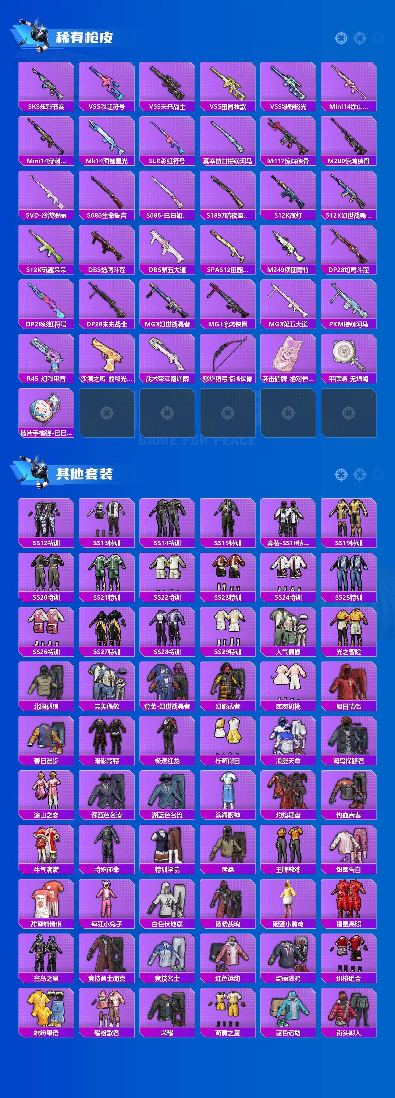 【395596】【可二次】【安卓QQ】龟仙人 阿狸红降落伞 漫步者 都市猎人 迅捷狂鲨 M24-奇异狩猎者 香水柠檬降落伞 极速红龙 摩登艾咪 AKM-梦之光华 AKM-缤纷海域 浪漫天命 暗影哥特 梦之呓语 雪山精英