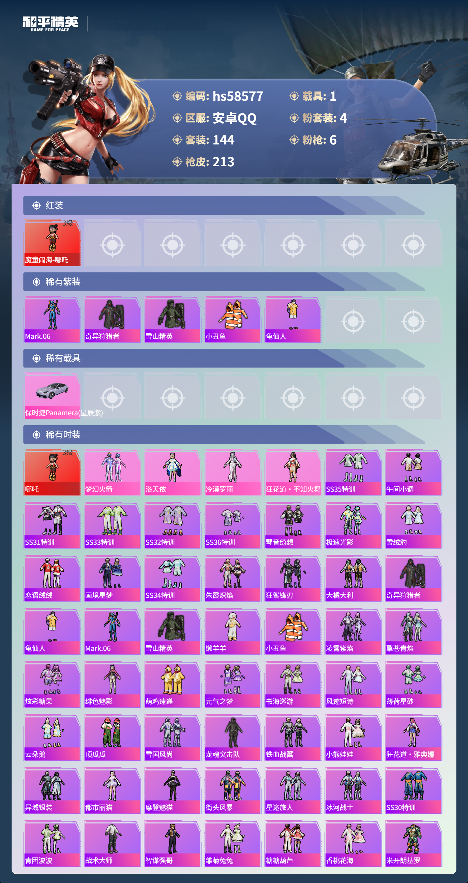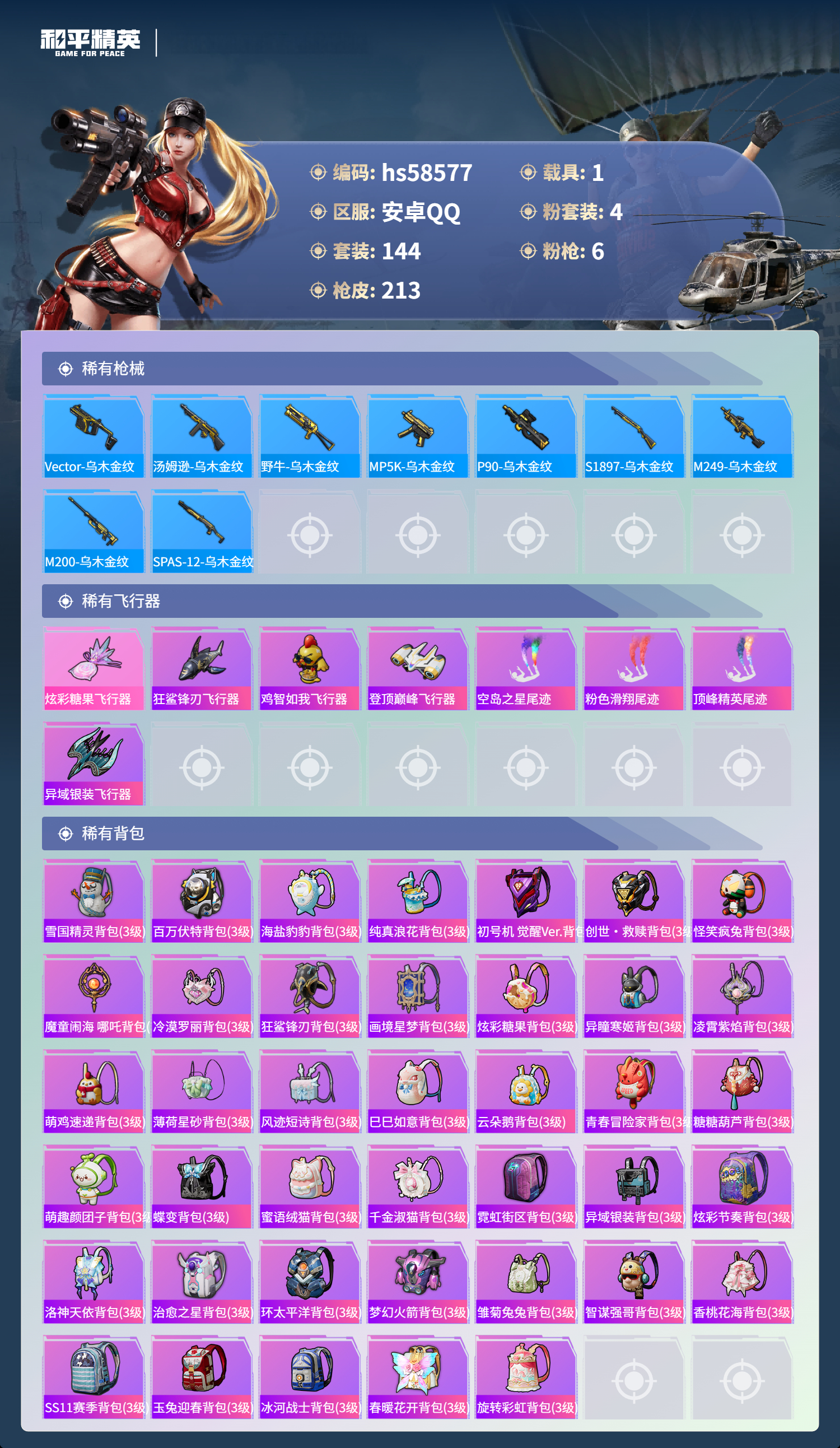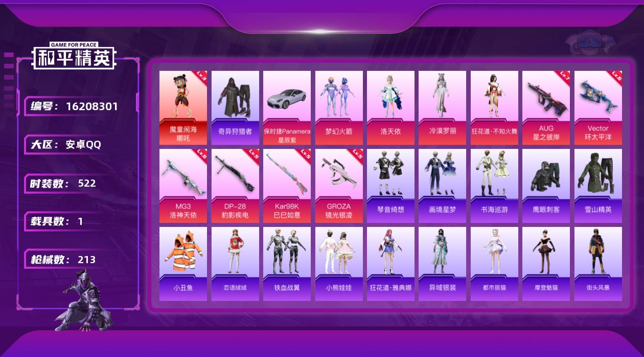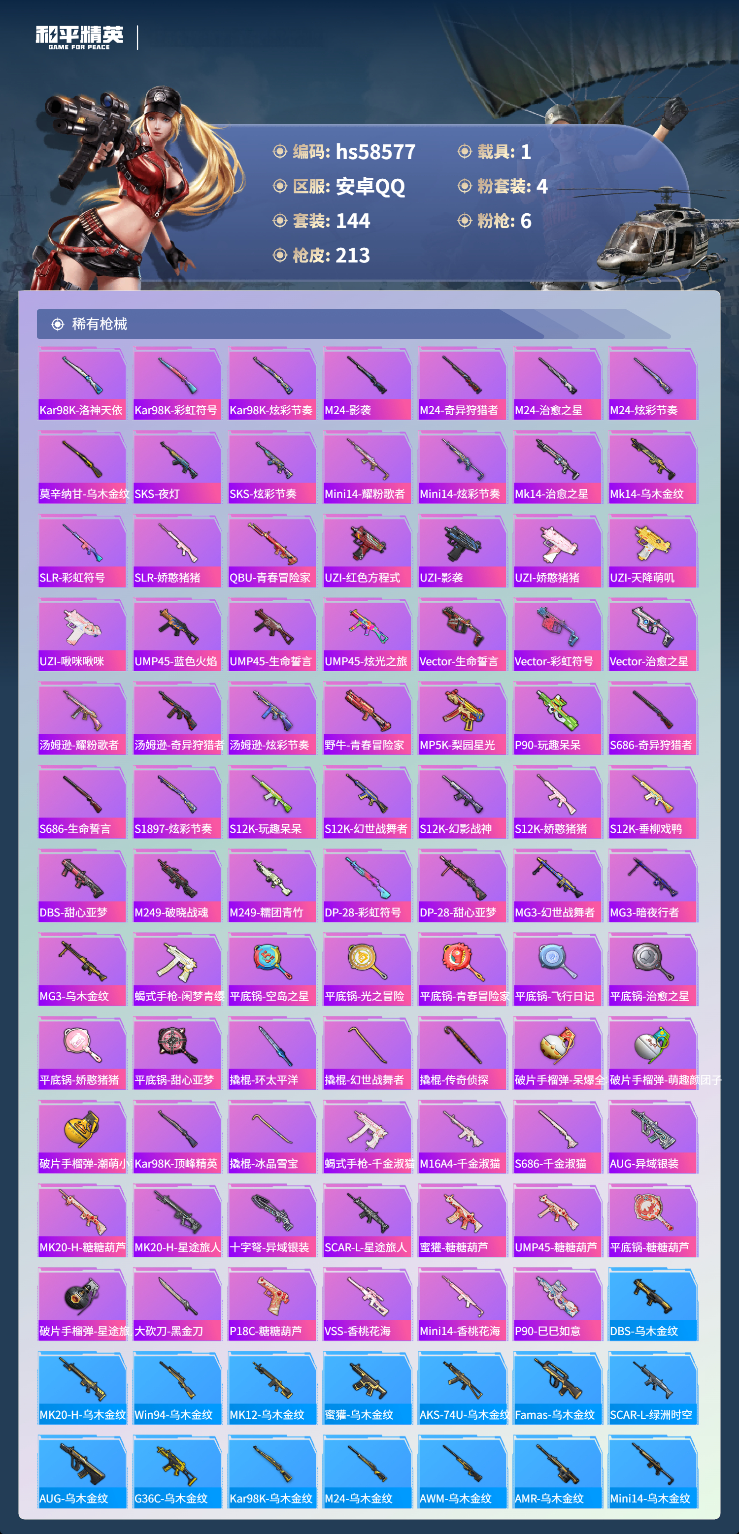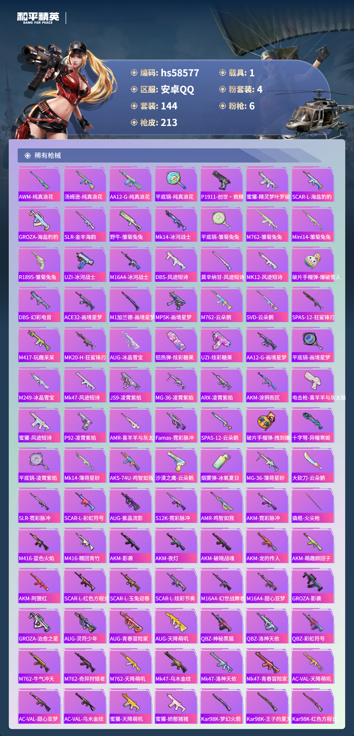 【395616】【不可二次】【安卓QQ】龟仙人 S686-奇异狩猎者 漫步者 奇异狩猎者 M24-奇异狩猎者 Vector-环太平洋 MG3-洛神天依 洛天依 M762-奇异狩猎者 梦幻火箭 粉红小猪 魔童闹海-哪吒 AUG-星之彼岸 雪山精英
