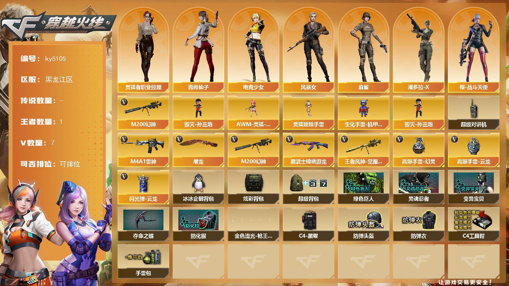 【395645】【395645】[16208628]黑龙江区-7V-1王者-0炫金【热门武器】:M200-幻神,毁灭-孙三炮【角色】:电竞少女,风暴女,灵狐者