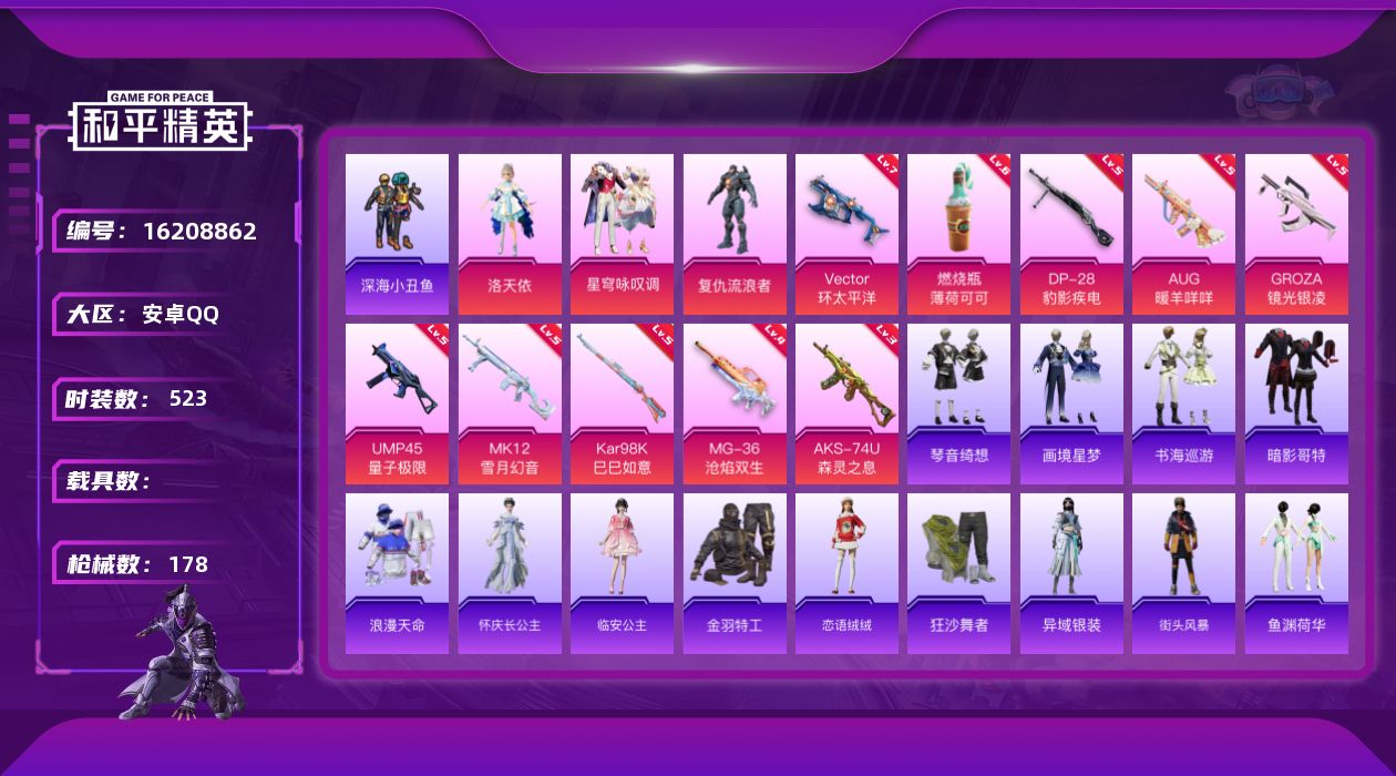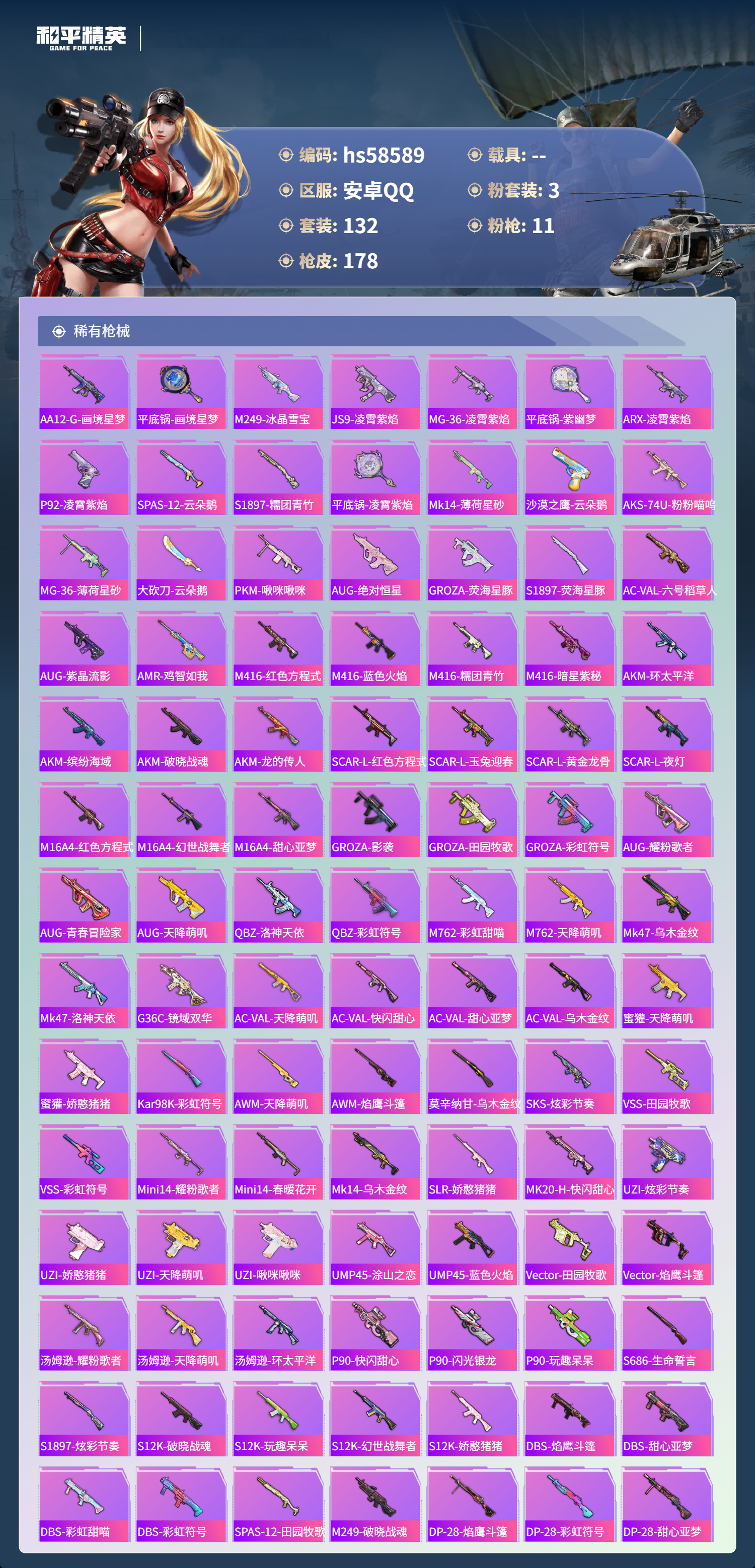 【395664】【不可二次】【安卓QQ】龟仙人 UMP45-量子极限 繁龙极客飞行器 AKM-缤纷海域 深海小丑鱼 Vector-环太平洋 洛天依 狂沙舞者 极速红龙 浪漫天命 暗影哥特 金羽特工