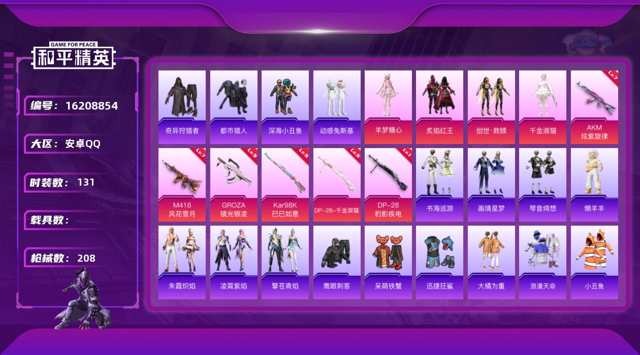 【395665】【可二次】【安卓QQ】AKM-炫紫旋律 大橘为重 M416-风花雪月 奇异狩猎者 深海小丑鱼